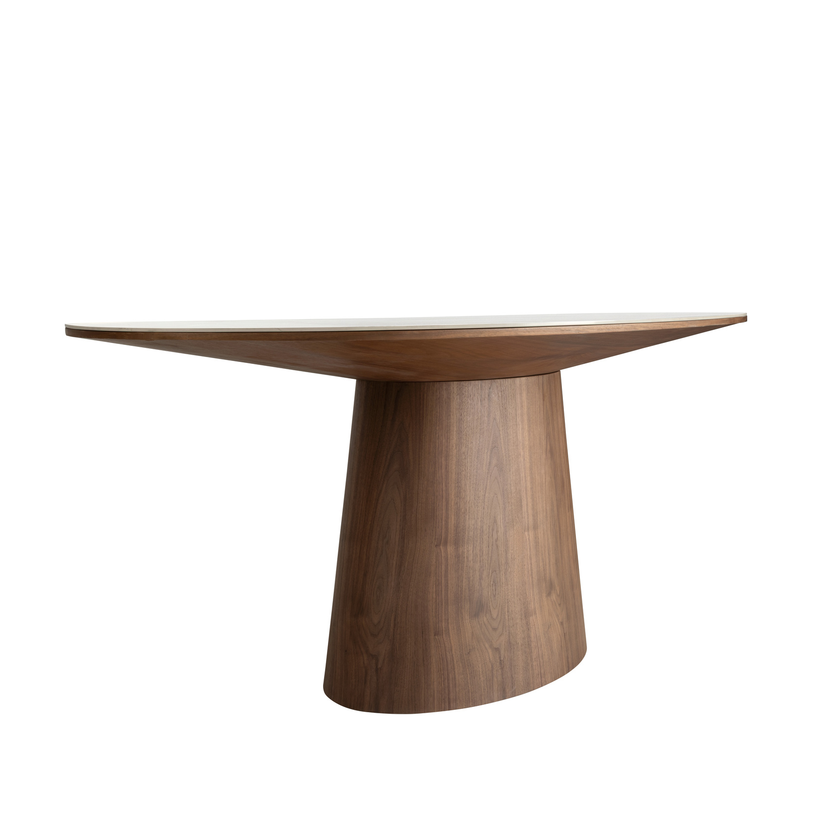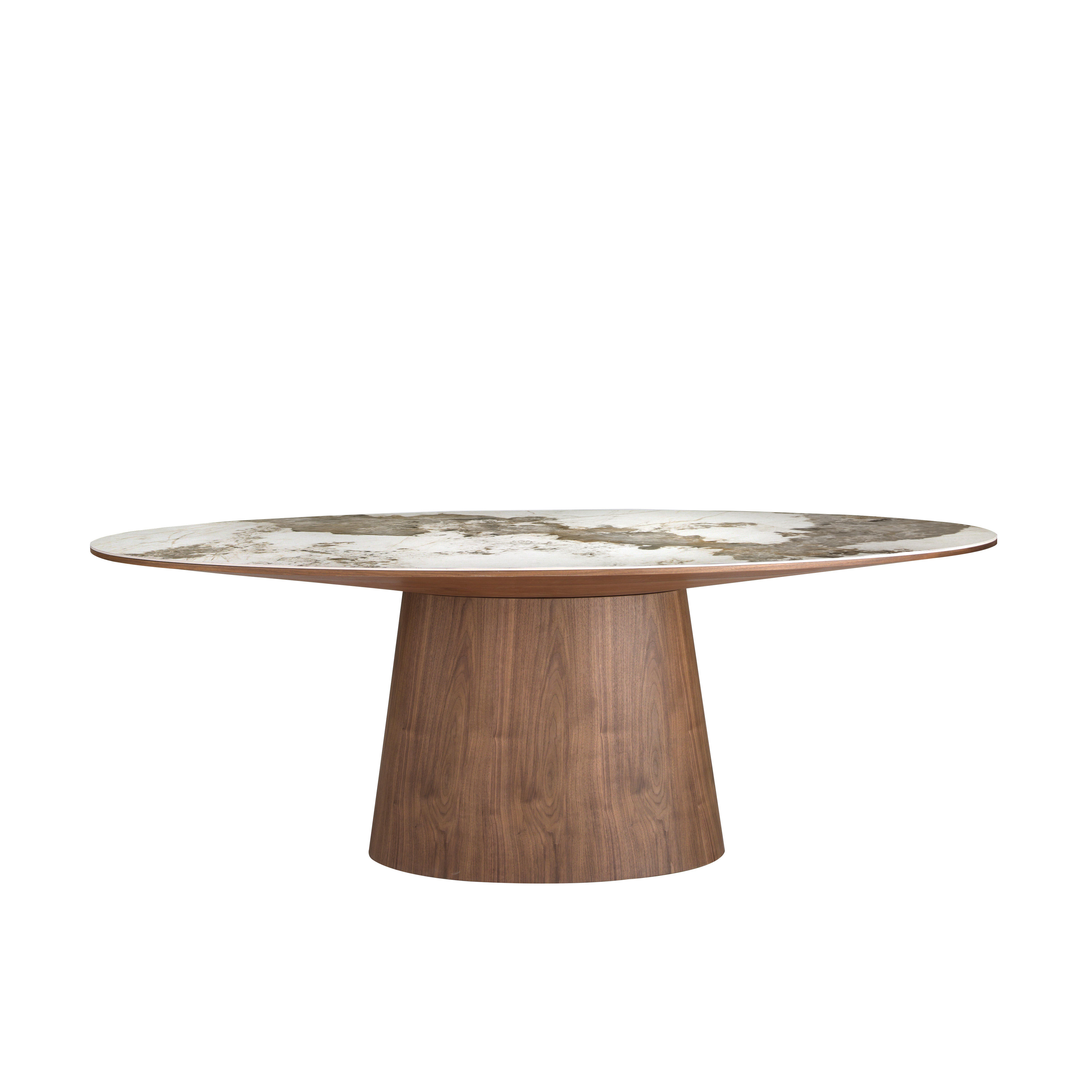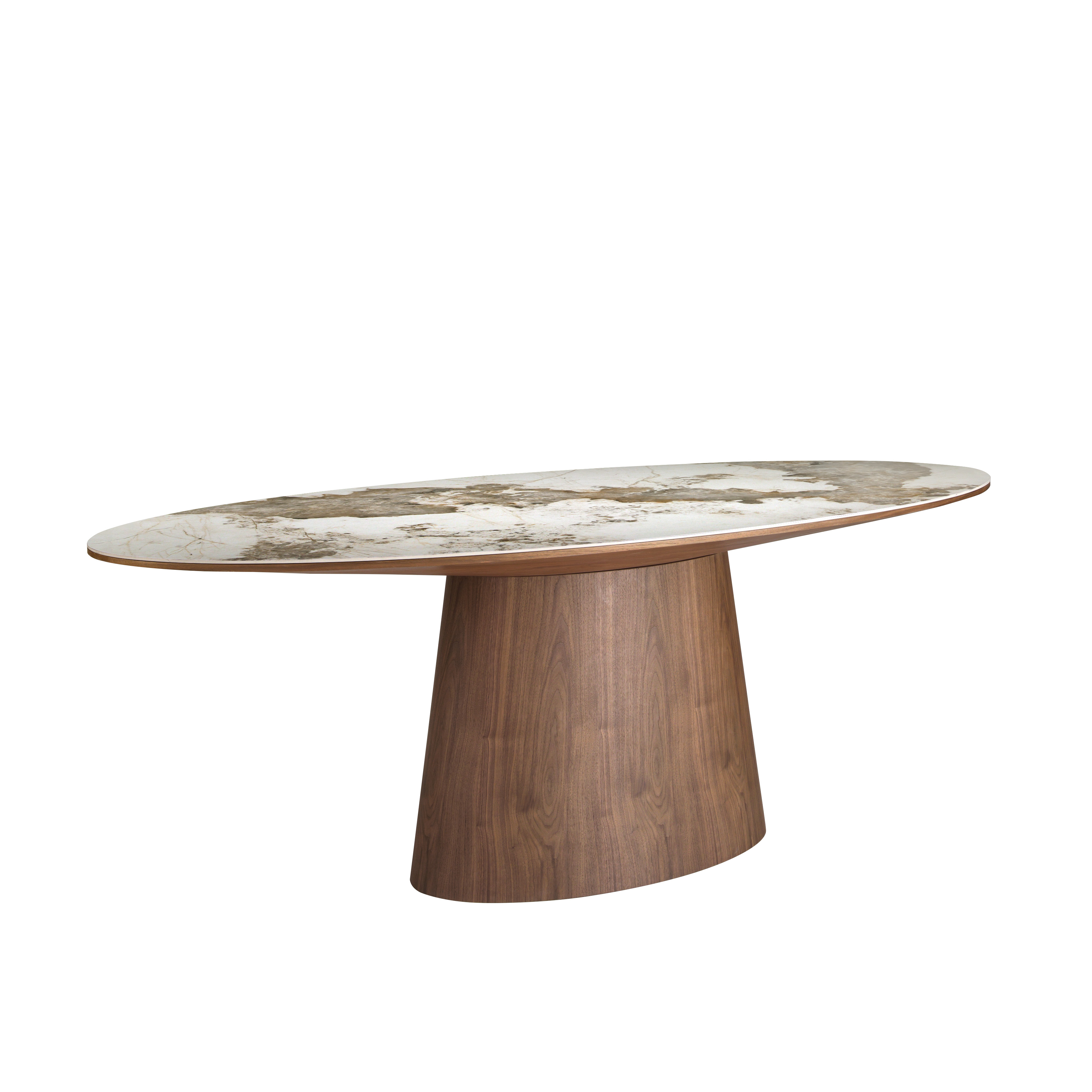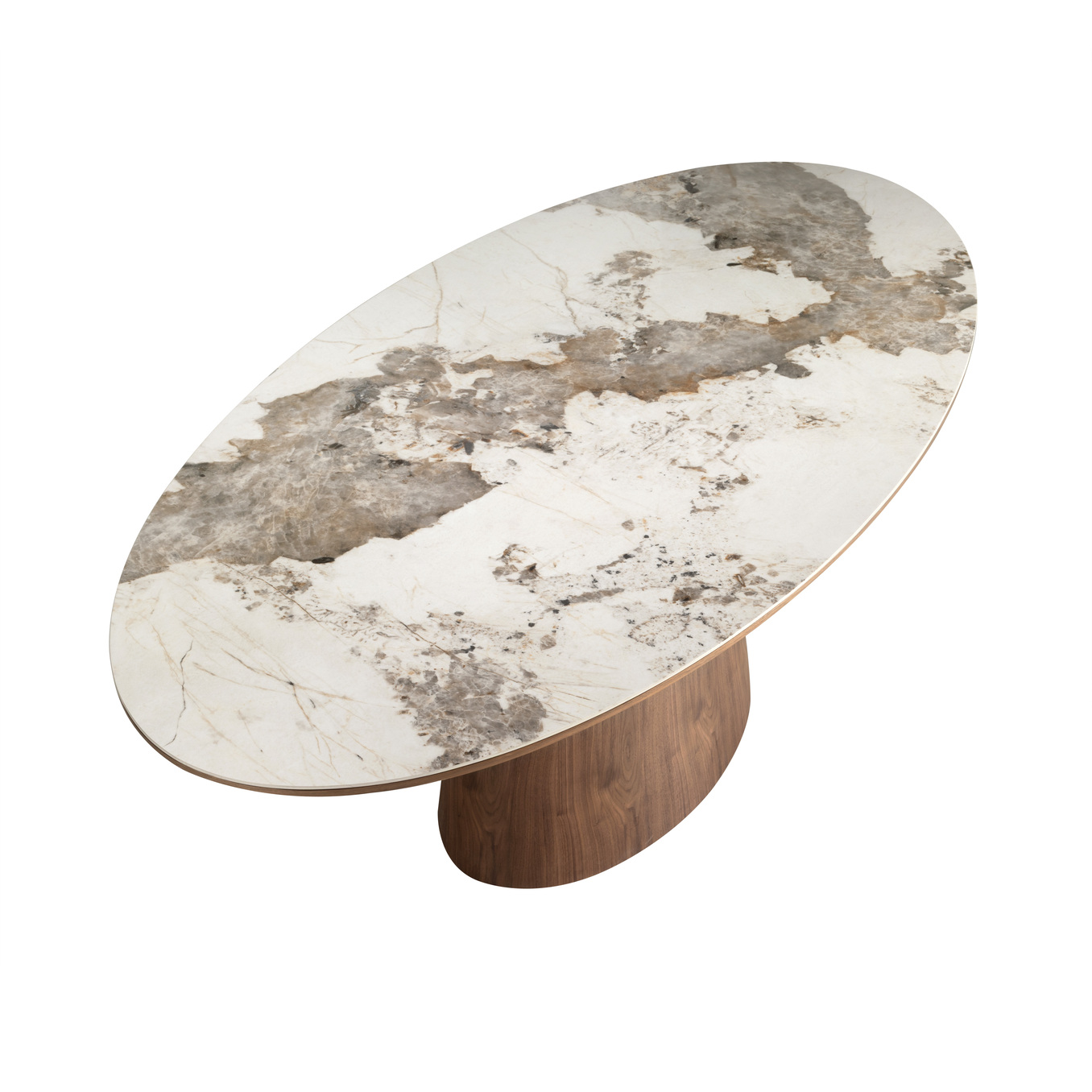 Modern, ovális alakú fix prémium étkezőasztal masszív, fényes felületű fehér porcelán márványlappal, földszínű erezetekkel, természetes dió színű furnérozott fa lába valamint letisztult megjelenése egy teljesen funkcionális és elegáns bútorrá teszi.