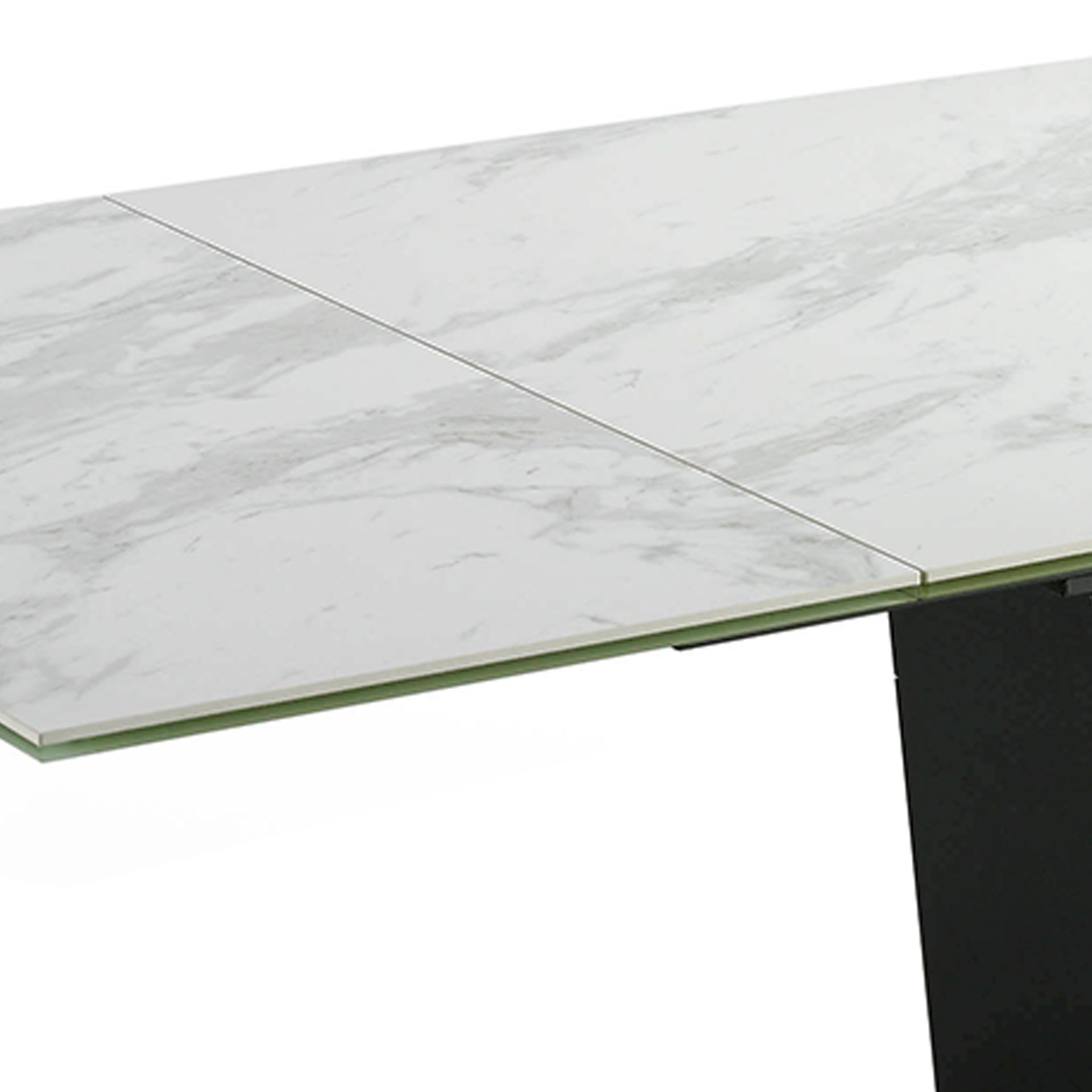 Modern, téglalap alakú bővíthető prémium étkezőasztal masszív, 4 mm-es calacatta márvány asztallappal és 8 mm-es üveglappal, fekete színű rozsdamentes acél lába valamint rugalmas kialakítása egy teljesen funkcionális és sokoldalú bútorrá teszi.