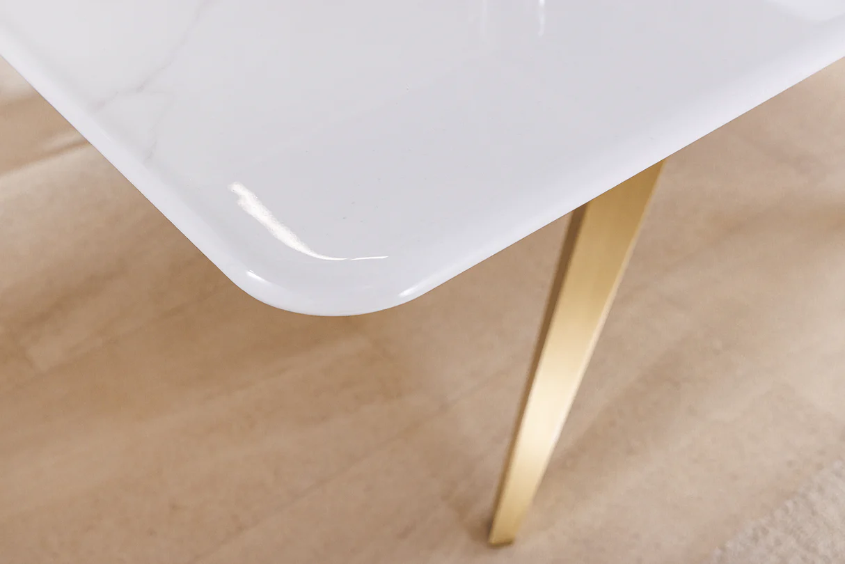 Modern téglalap alakú fix étkezőasztal fényes felületű márvány mintás fehér kerámia lappal, szürke erezettel. Pezsgő arany színű szálcsiszolt rozsdamentes acél lába stabil kialakítása és különleges formája miatt az asztal dekoratív és strapabíró. Asztallapja lekerekített sarkai által biztonságot nyújt környezetének.