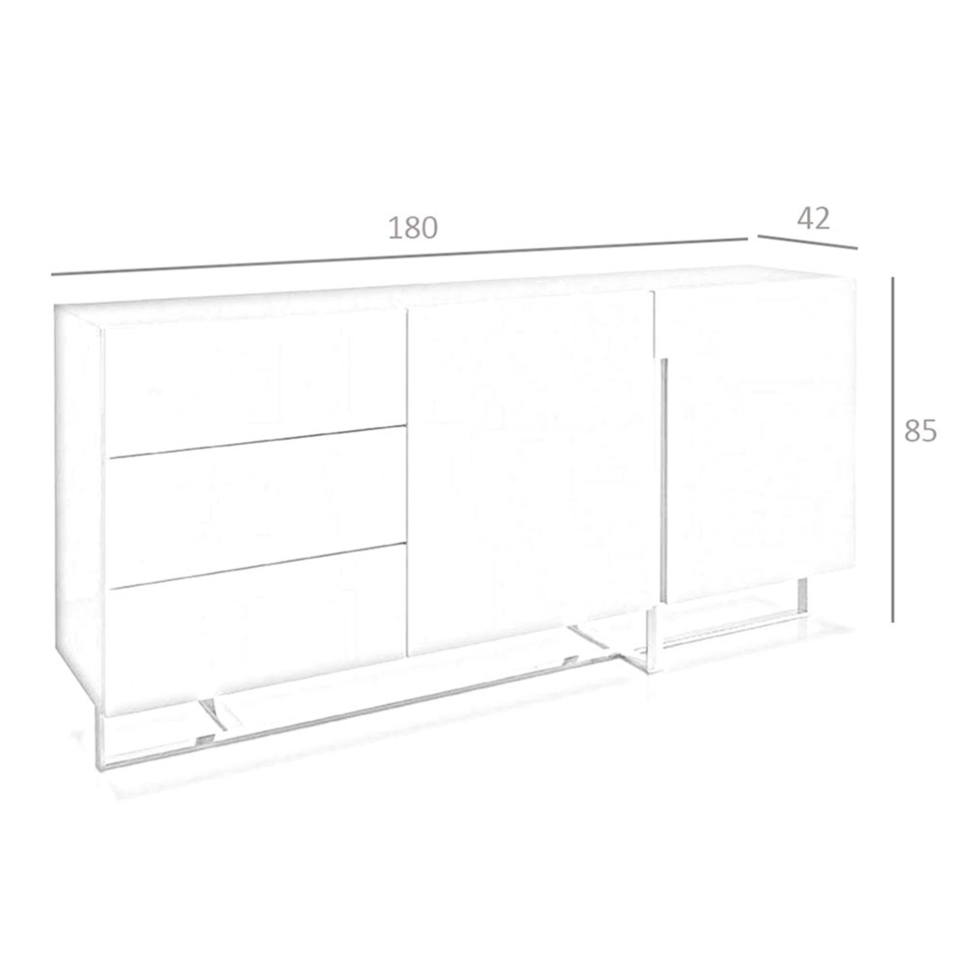 Modern stílusú tálaló komód fehér színű mdf faszerkezettel és krómozott rozsdamentes acél lábakkal, krómozott dizájn eleme letisztult megjelenést kölcsönöz a bútornak