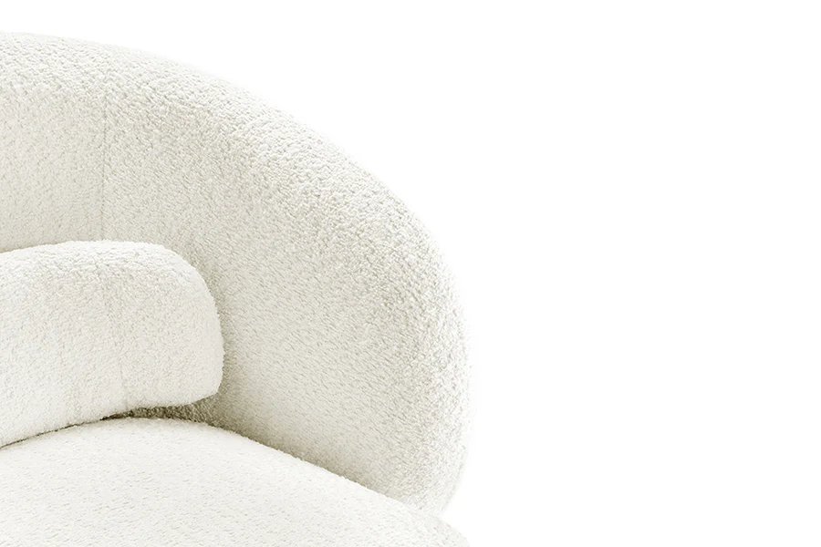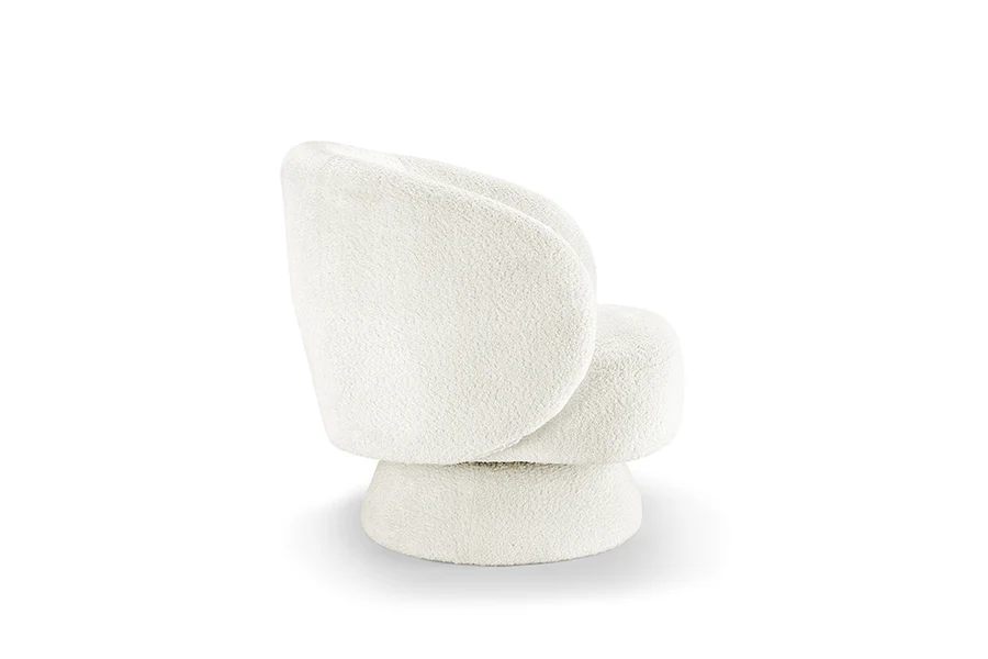 360 fokban elforgatható design forgófotel lekerekített háttámlával és elegáns fehér színű bouclé szövettel ideális választás nappaliba vagy hálószobába egyaránt, kényelmes ülőfelülete és háttámlájának kialakítása hívogató és egyben modern megjelenést kölcsönöz, hogy otthona ne csak egyedi de pihentető is legyen. A párna a fotel tartozéka.