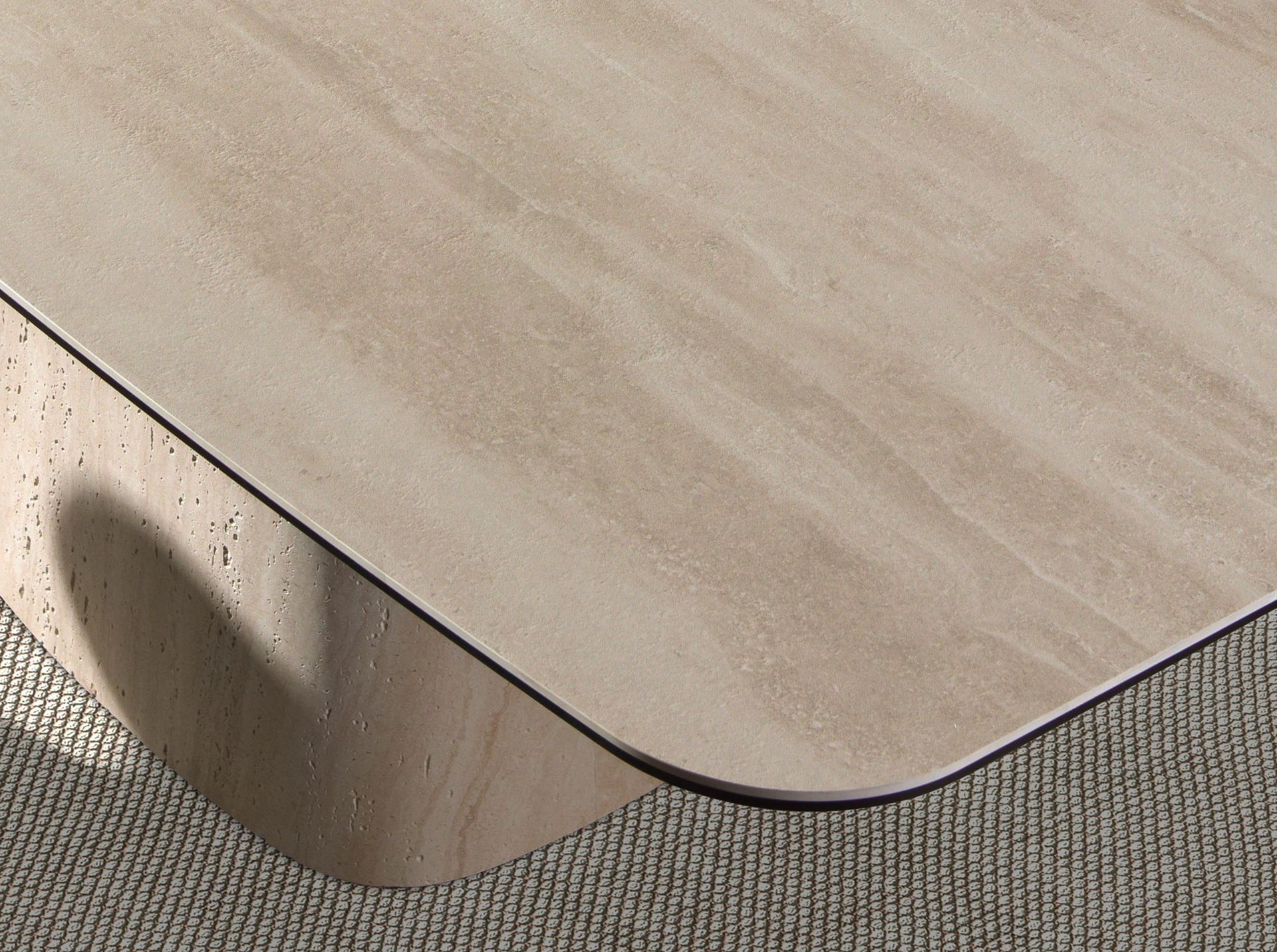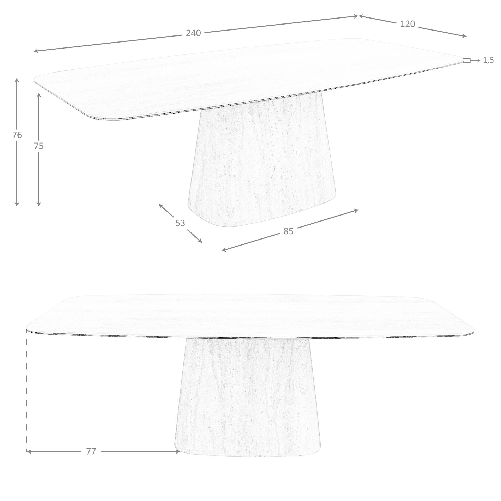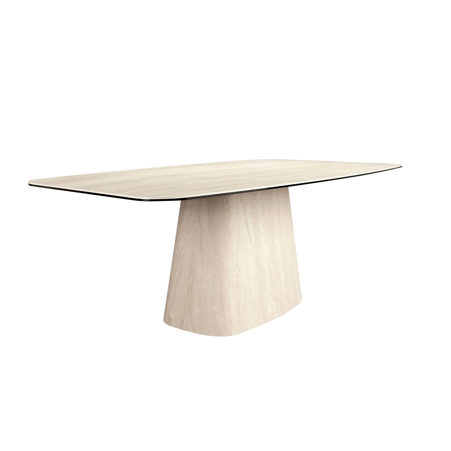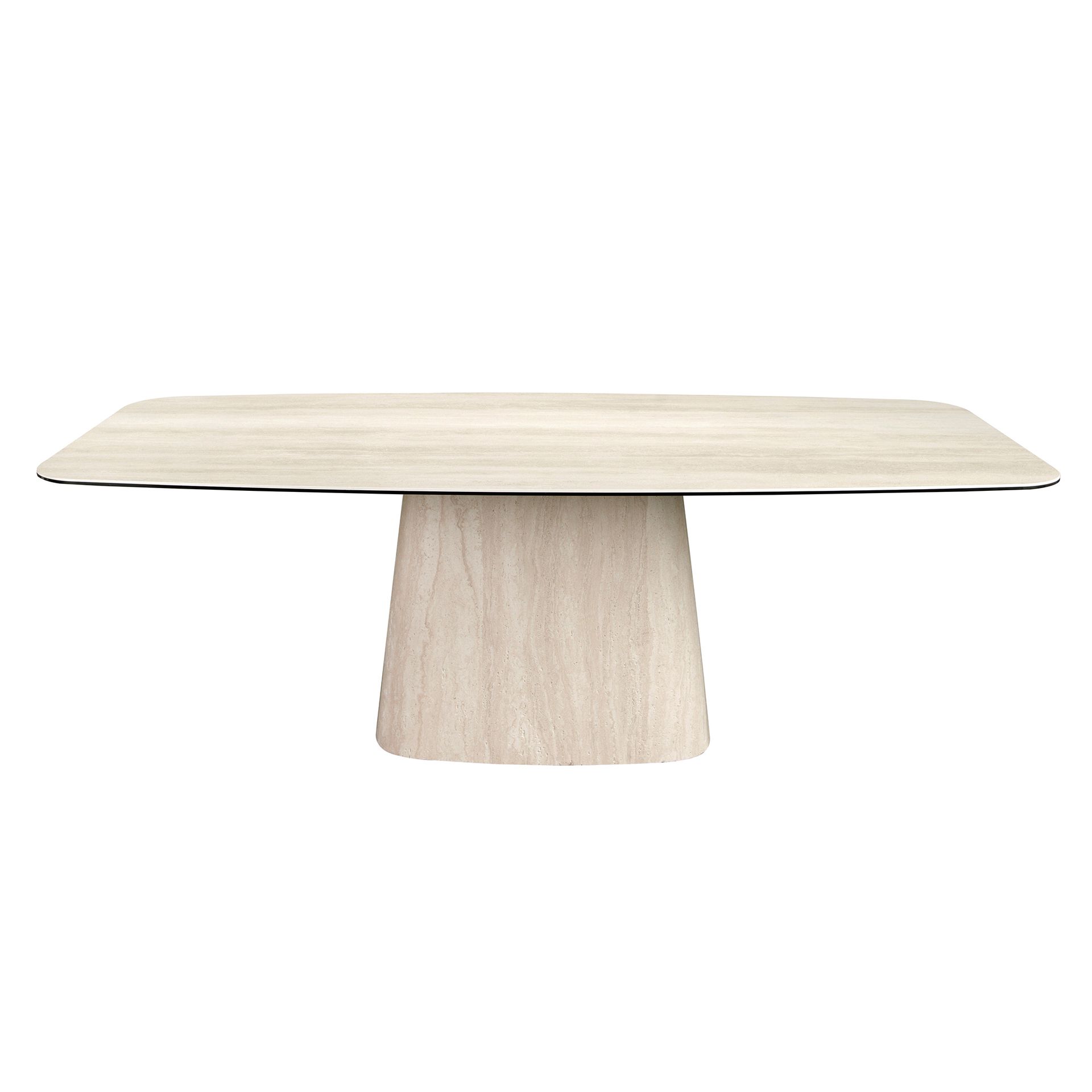 Ovális prémium étkezőasztal fix asztallappal és matt felületű, homokszínű porcelán márvány központi masszív lábbal lenyűgöző eleganciát kölcsönöz otthonának.