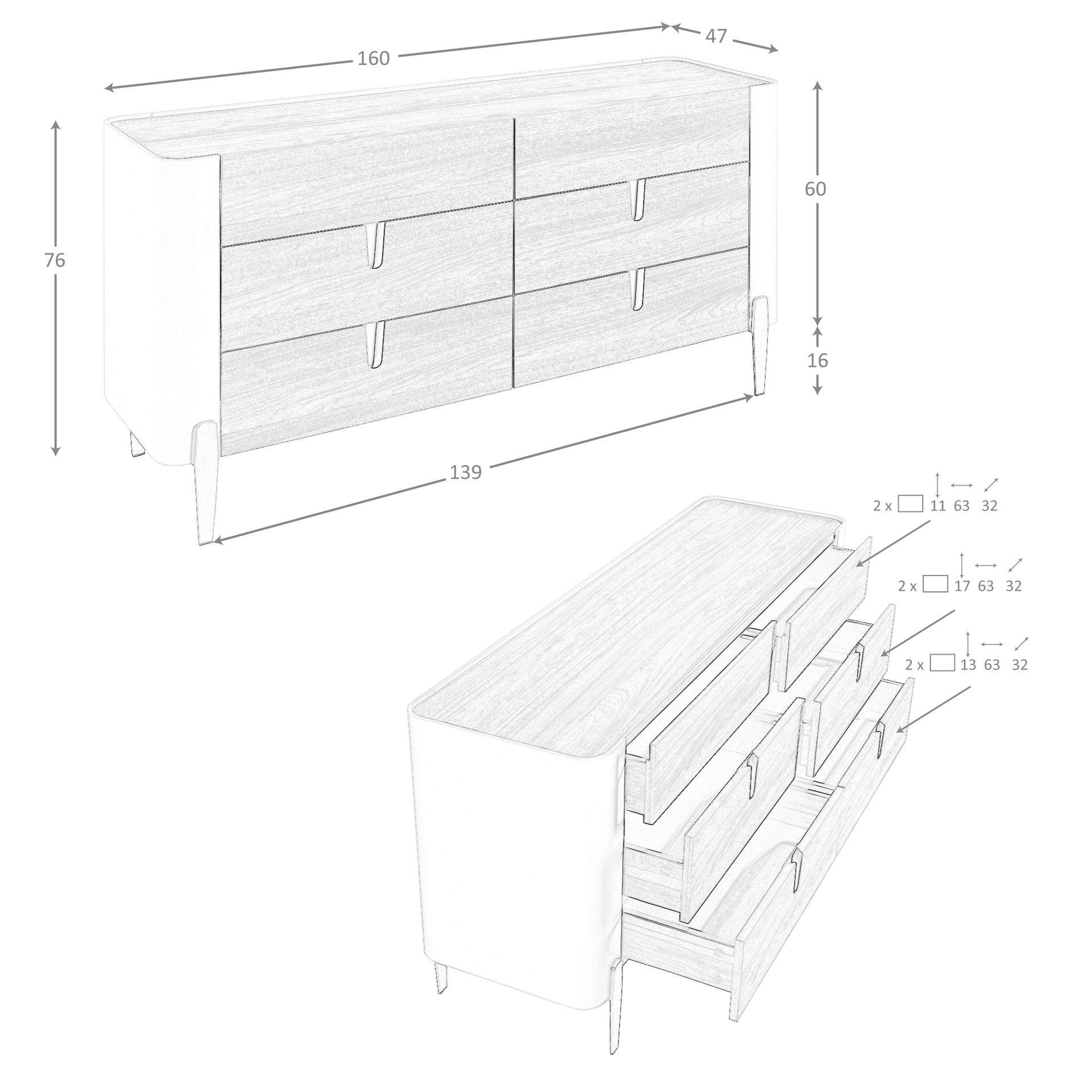 Modern megjelenésű komód natúr dió furnérozott fa szerkezettel és bézs lakkozású MDF fával, valamint polírozott arany színű rozsdamentes acél lábakkal. Tágas tárolóhellyel, 6 fiókkal került kialakításra, melyek a fiók előlapok egyedi, arany színű bevágásának kialakításával nyithatóak és lágyan záródó rendszerrel működnek.