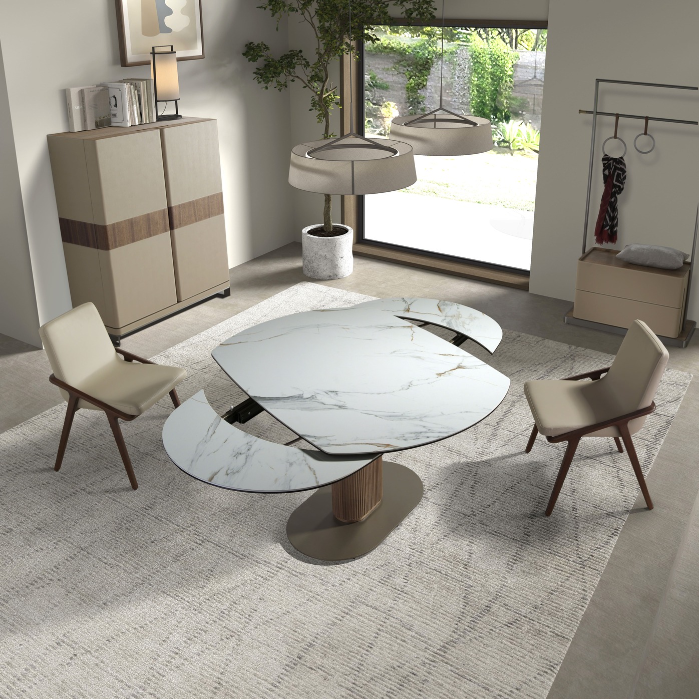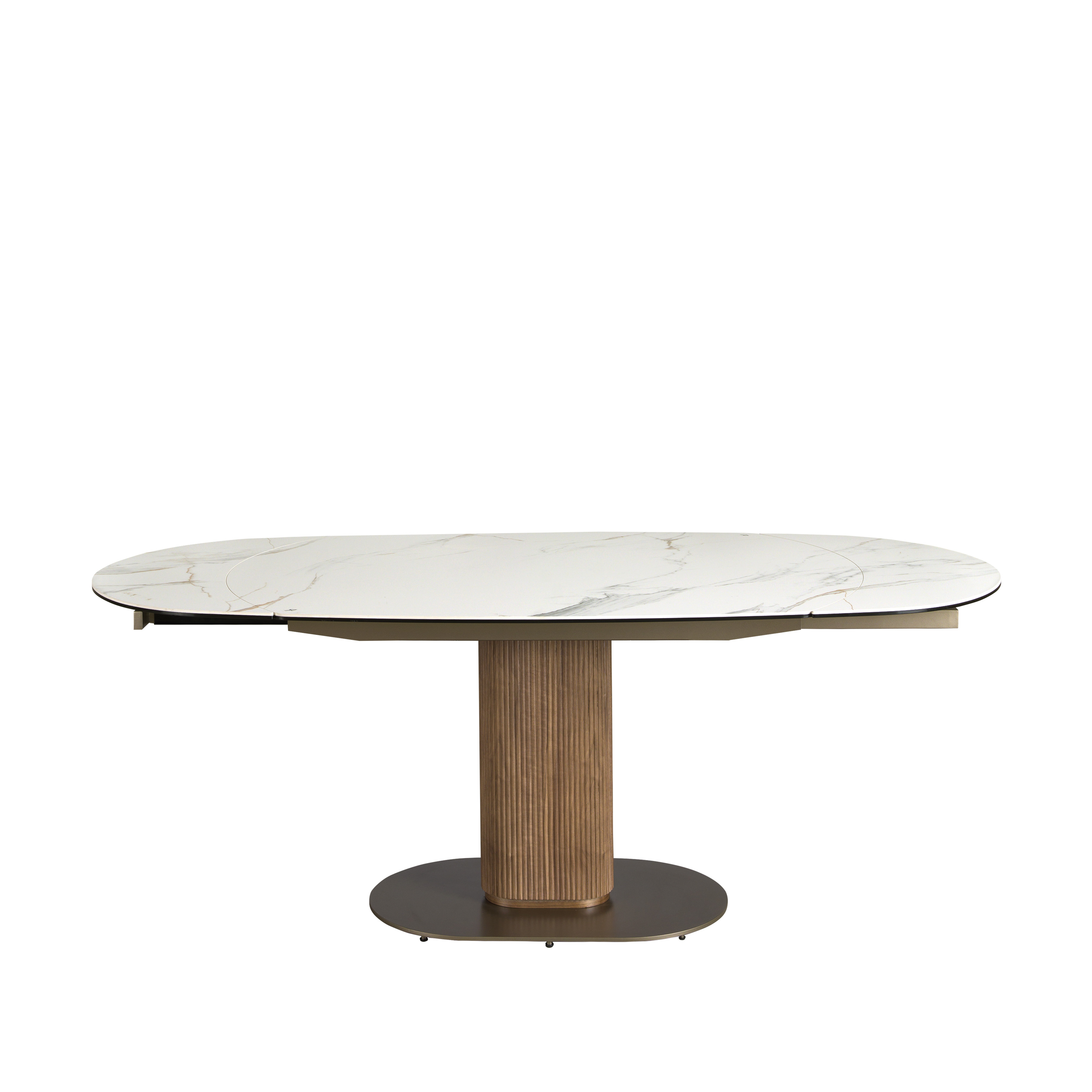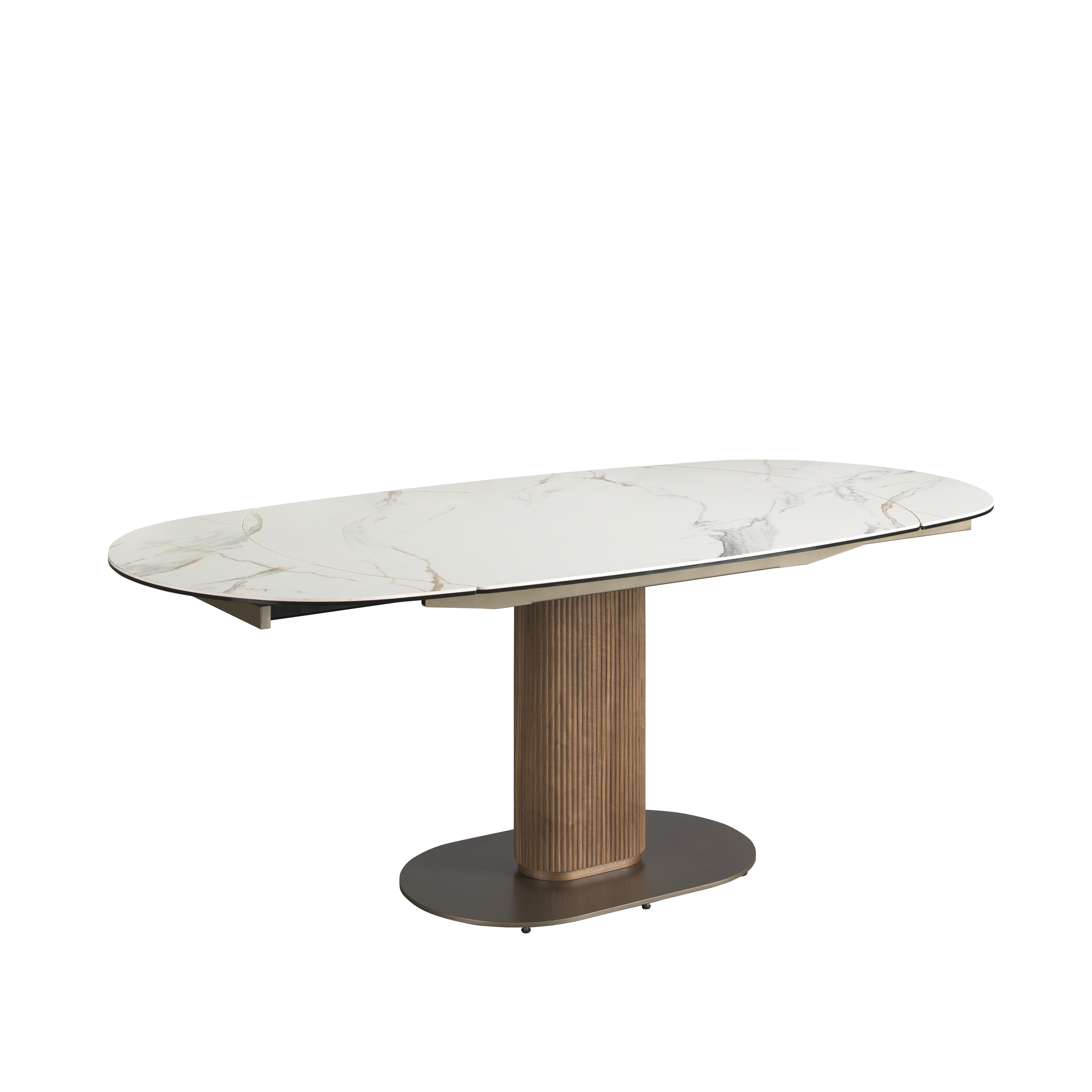 Modern, ovális alakú bővíthető prémium étkezőasztal masszív, fehér színű porcelán márvány asztallappal, szürke és barna erezetekkel, természetes dió furnérozott lába valamint rugalmas kialakítása egy teljesen funkcionális és sokoldalú bútorrá teszi.