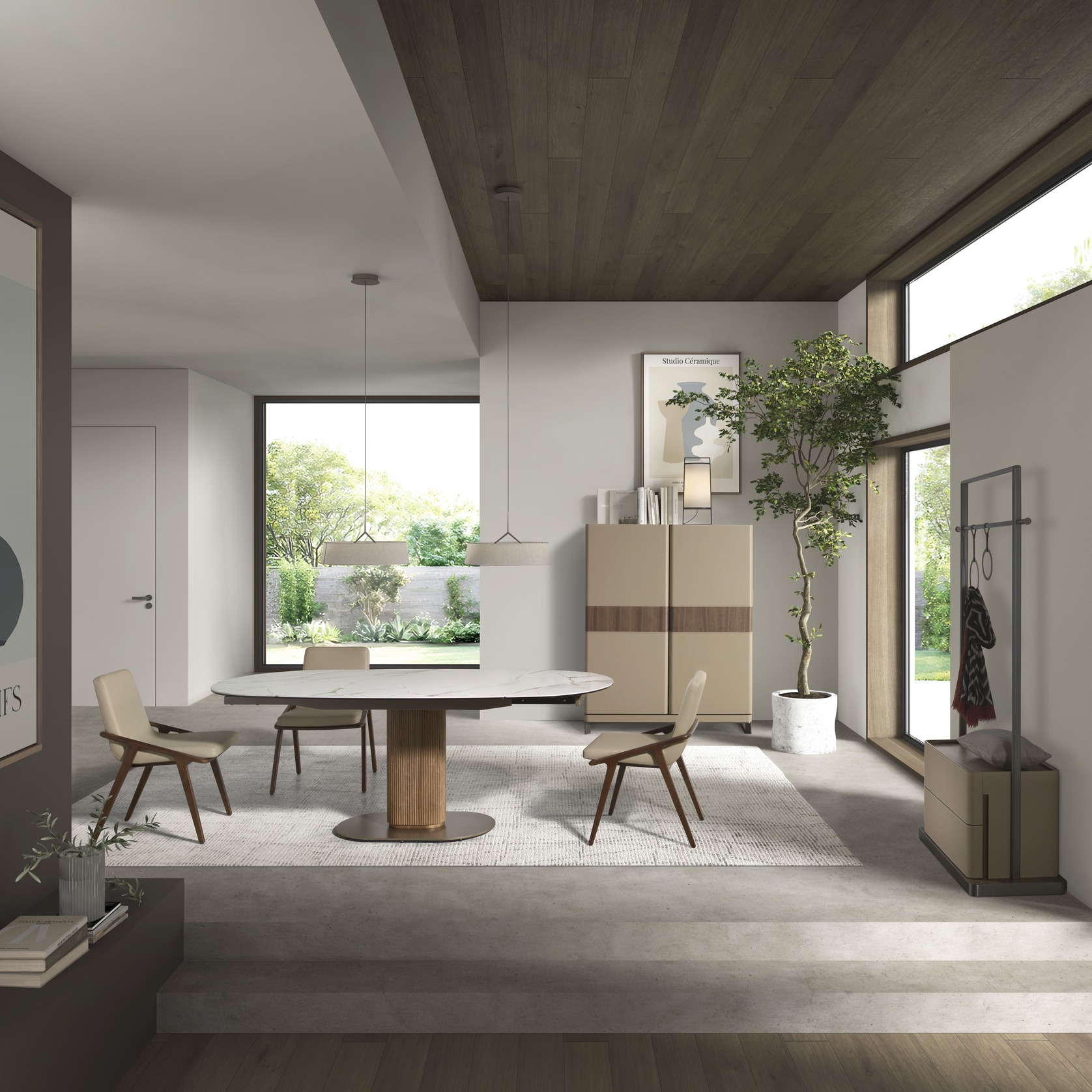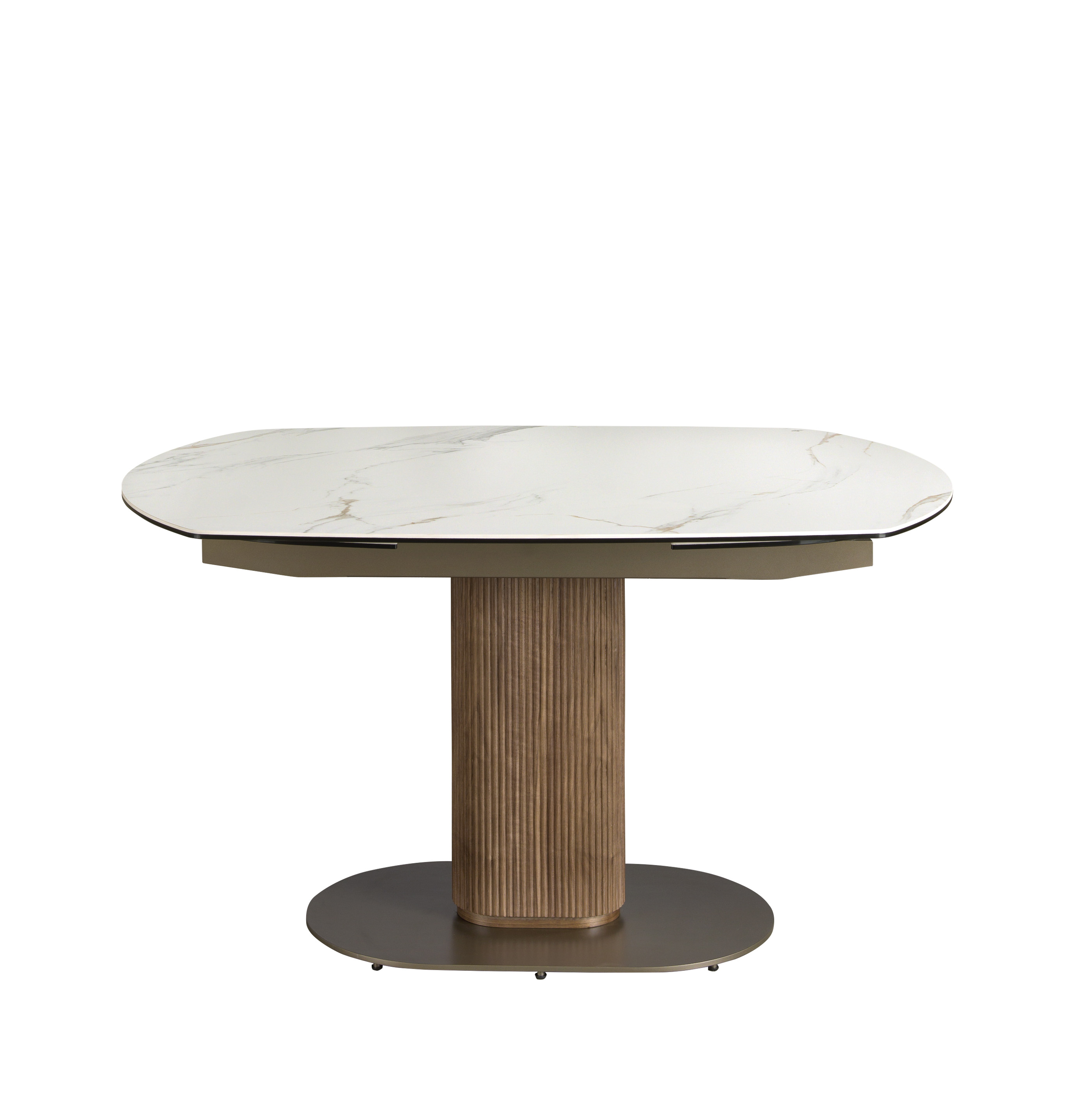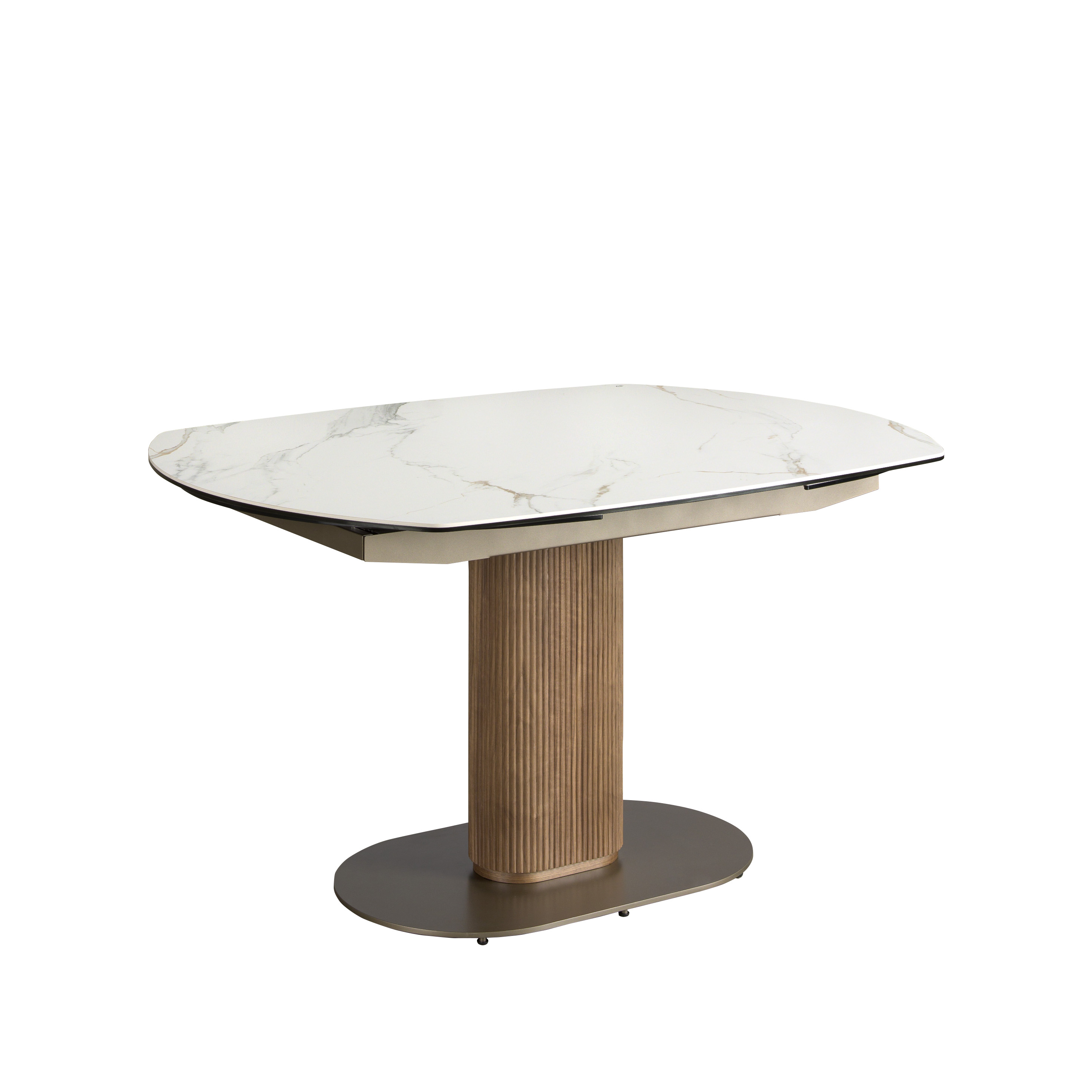 Modern, ovális alakú bővíthető prémium étkezőasztal masszív, fehér színű porcelán márvány asztallappal, szürke és barna erezetekkel, természetes dió furnérozott lába valamint rugalmas kialakítása egy teljesen funkcionális és sokoldalú bútorrá teszi.