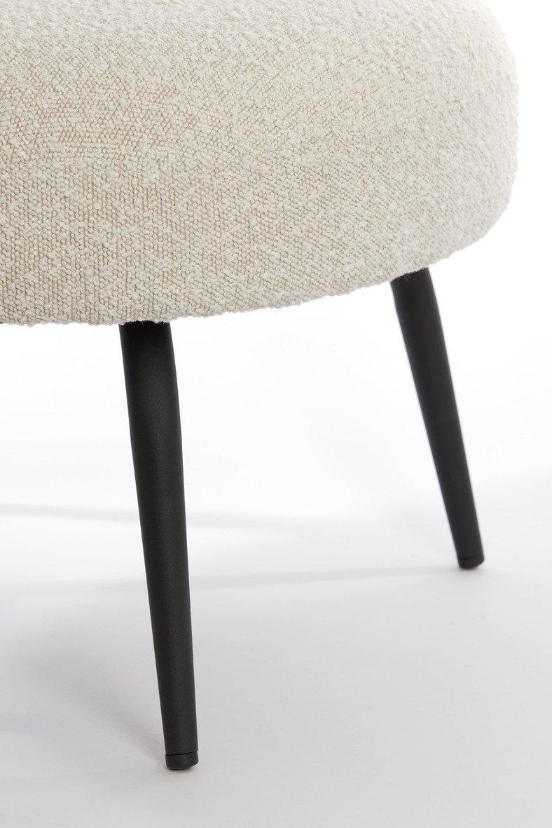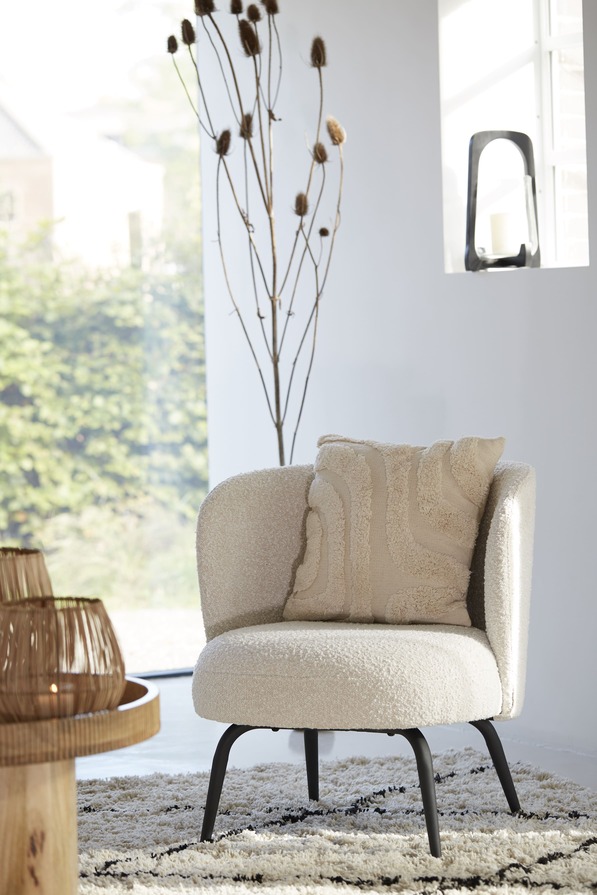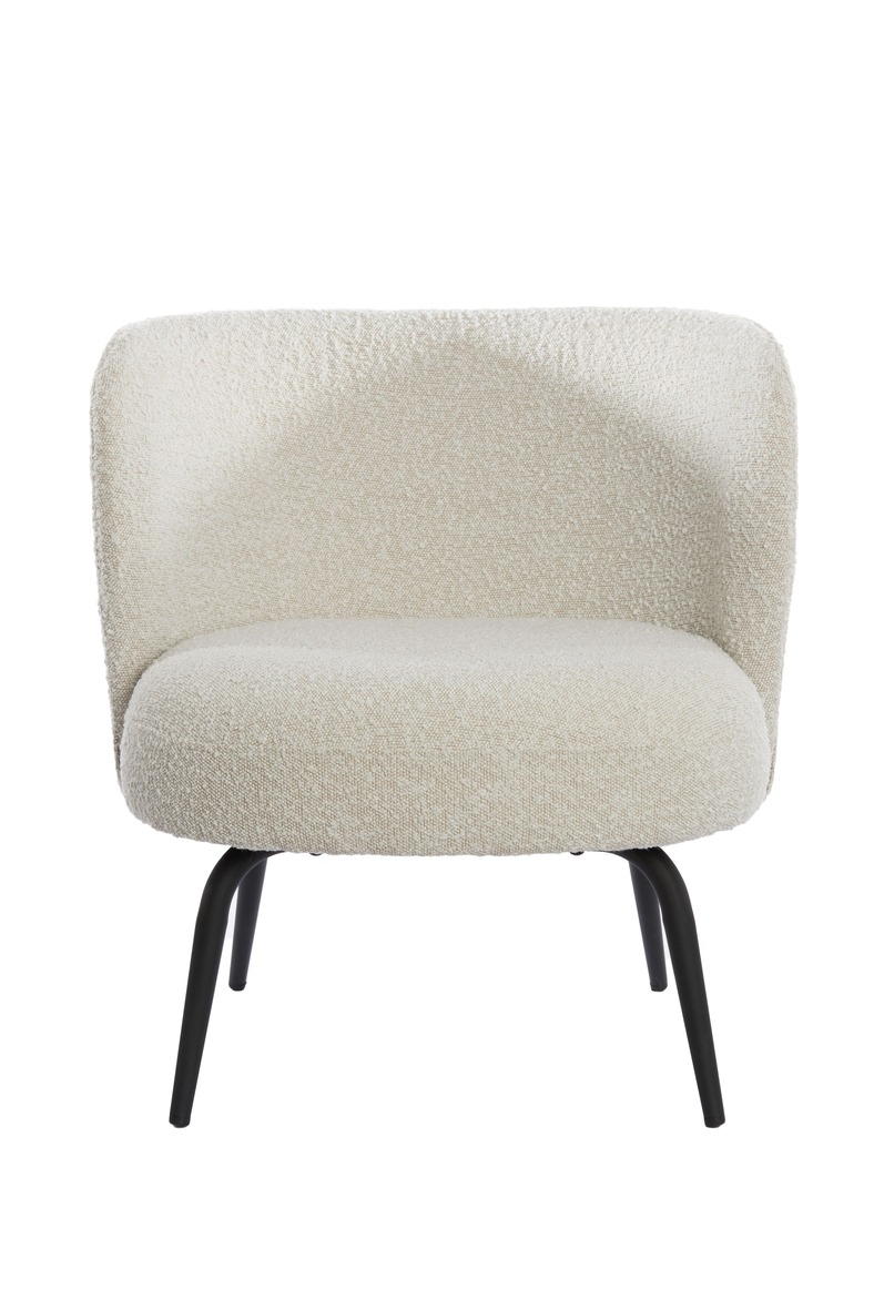 Krém színű bouclé fotel fekete színű fém lábakkal kényelmes, vastag ülőfelülete és lekerekített háttámlája nemcsak kényelmes de látványos eleme lesz otthonának.