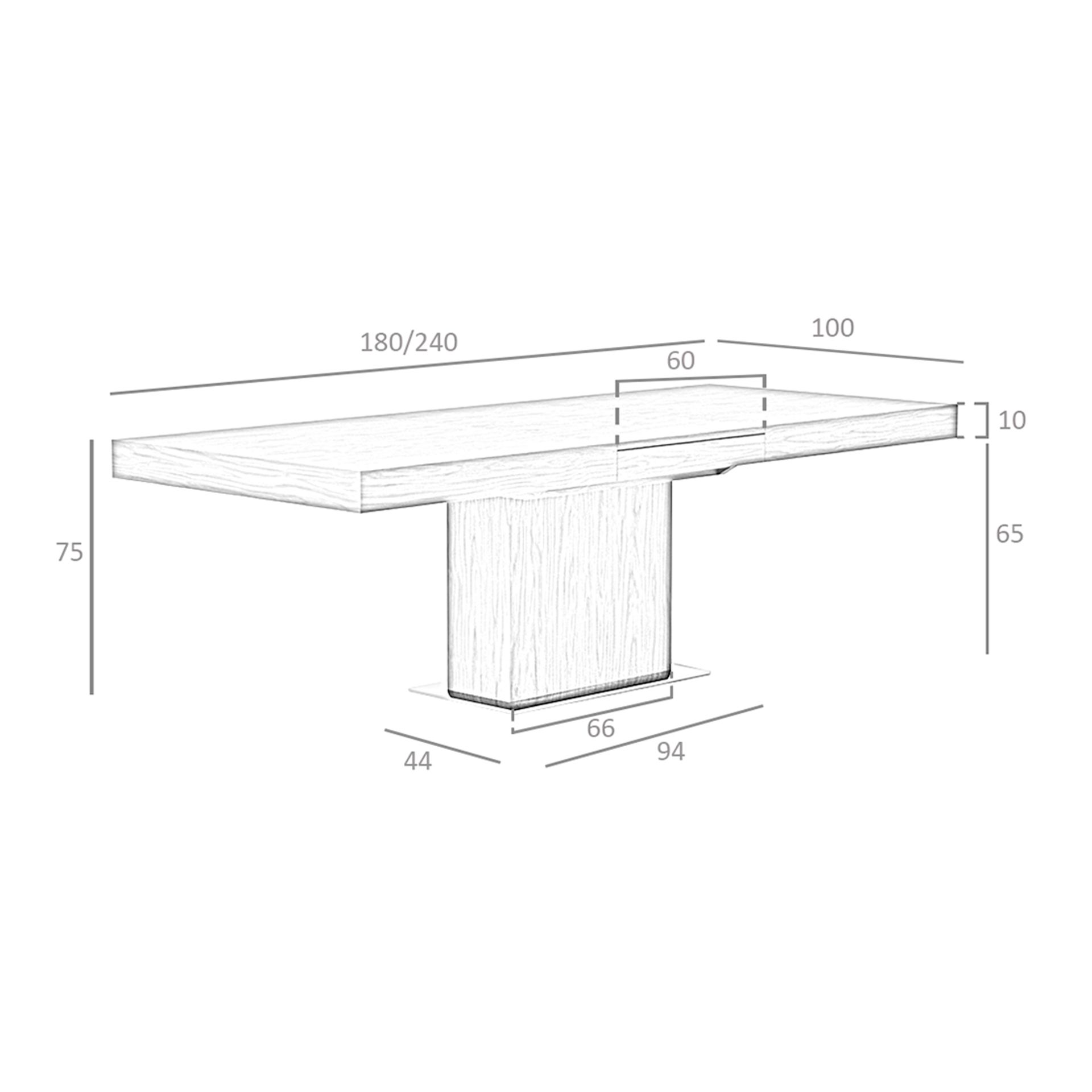 Az étkezőasztal 1 db 60 cm-es kihúzható részből áll, így 180 és 240 cm között állítható, a rejtett középső mechanizmusnak köszönhetően egy sokoldalú és funkcionális asztalt élvezhet, amely a vendégek számához igazítható. Maximum 10 fő használatára alkalmas.