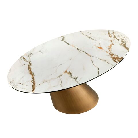 Fix ovális prémium étkezőasztal szürke és barna erezetes fehér színű porcelán márványlappal és bronz színű rozsdamentes acél lábbal.