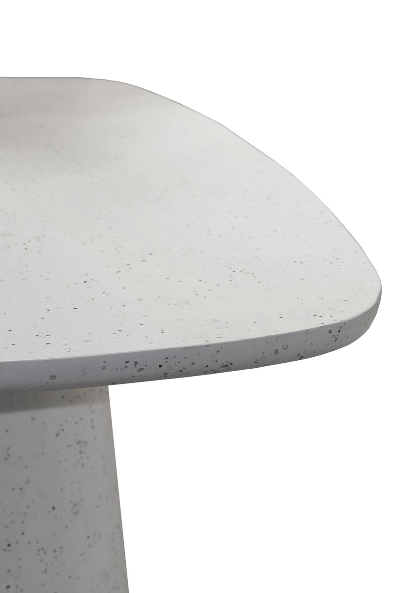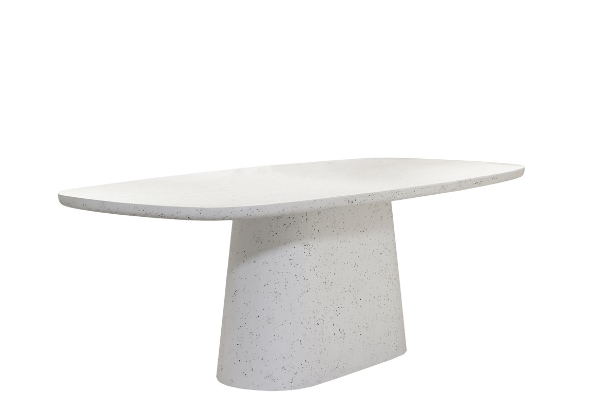 Terrrazzo fehér színű ovális design fa étkezőasztal központi lábbal meghatározó darabja lesz otthonának. Lekerekített asztallapja, terrazzo mintája különleges hangulatot teremt.