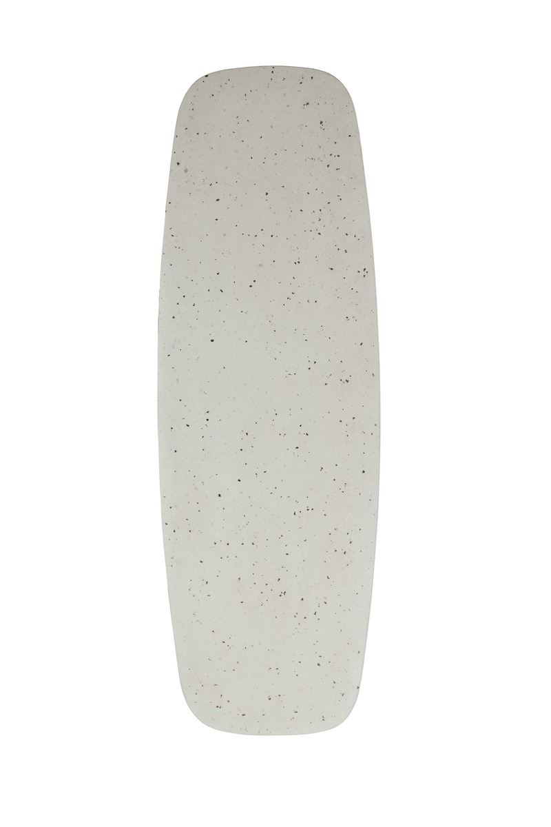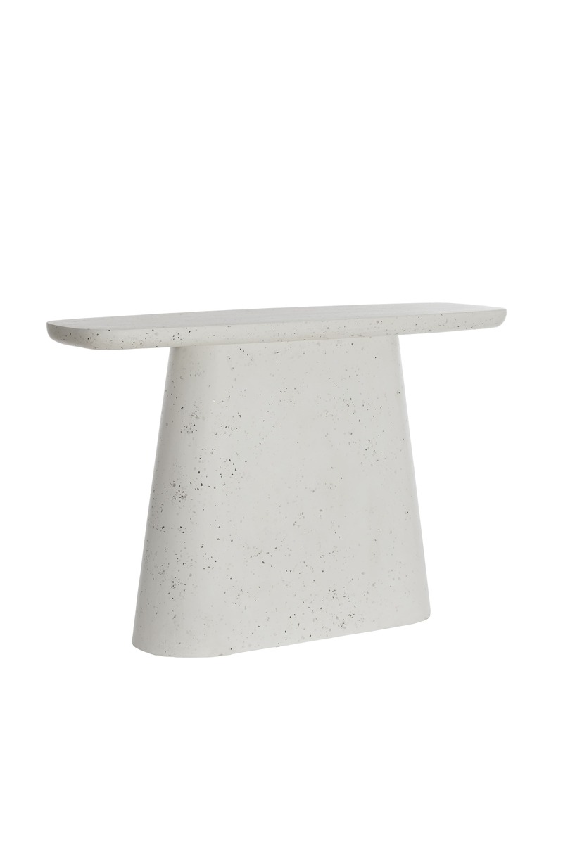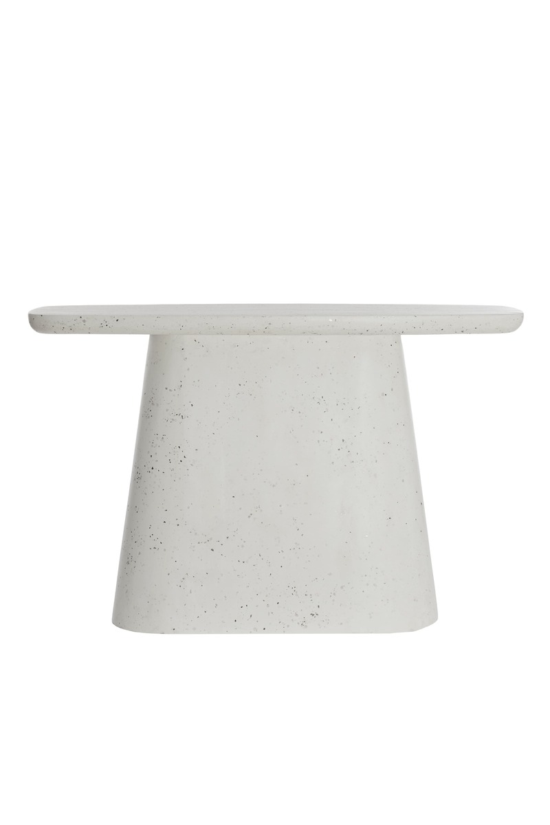 Terrrazzo fehér színű design fa konzolasztal központi, lefelé vastagodó lábbal meghatározó darabja lesz otthonának. Lekerekített asztallapja, terrazzo mintája különleges és modern hangulatot teremt. Nagyobb méretű nappalik, előszobák design bútora, helyezze rá használati tárgyait, kedvenc dekorjait, virágot, könyveket, ezzel tükrözve személyiségét és kreativitását, színével és megjelenésével kiemeli otthona természetességét és modern hangulatát.