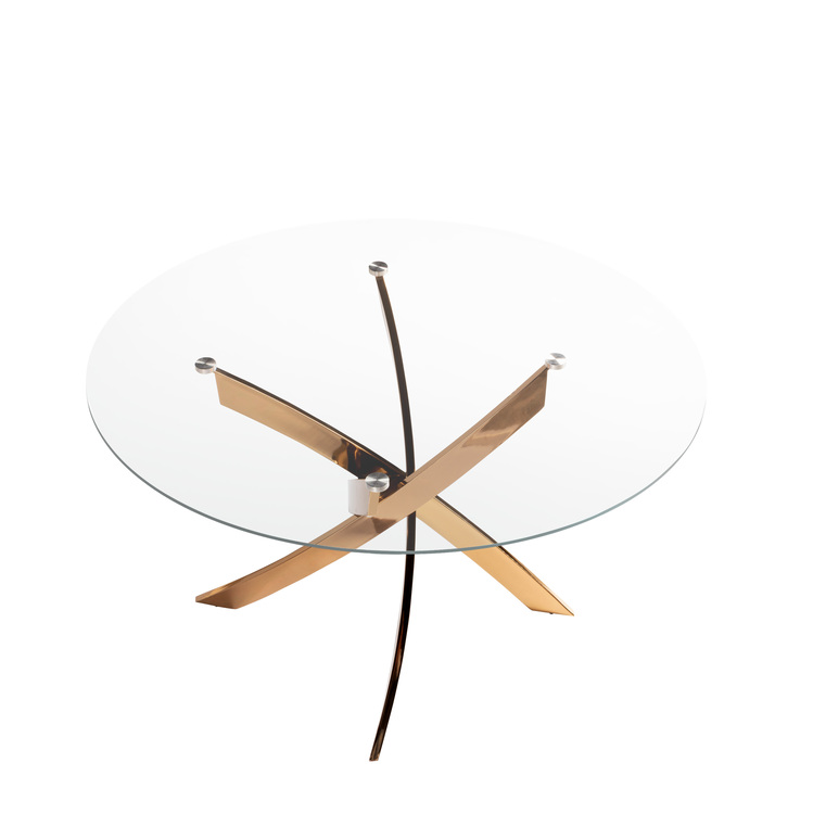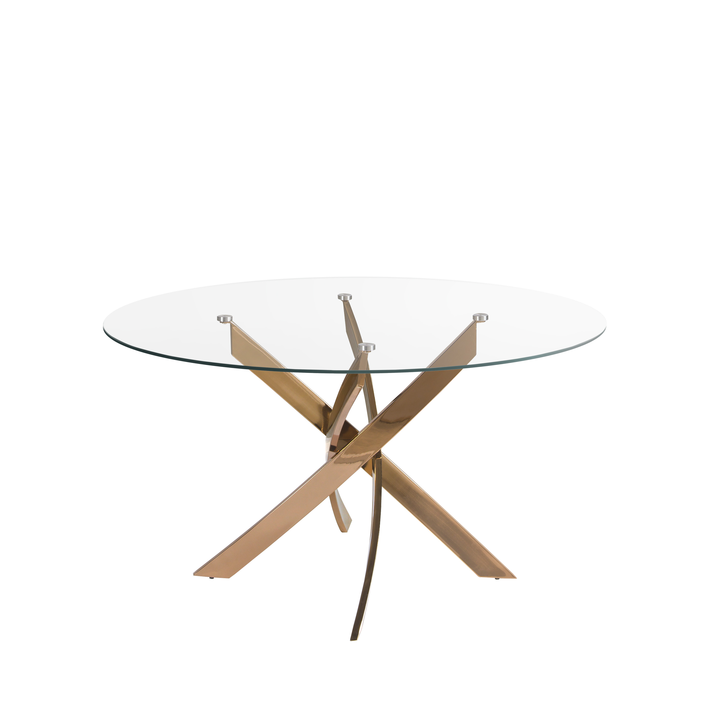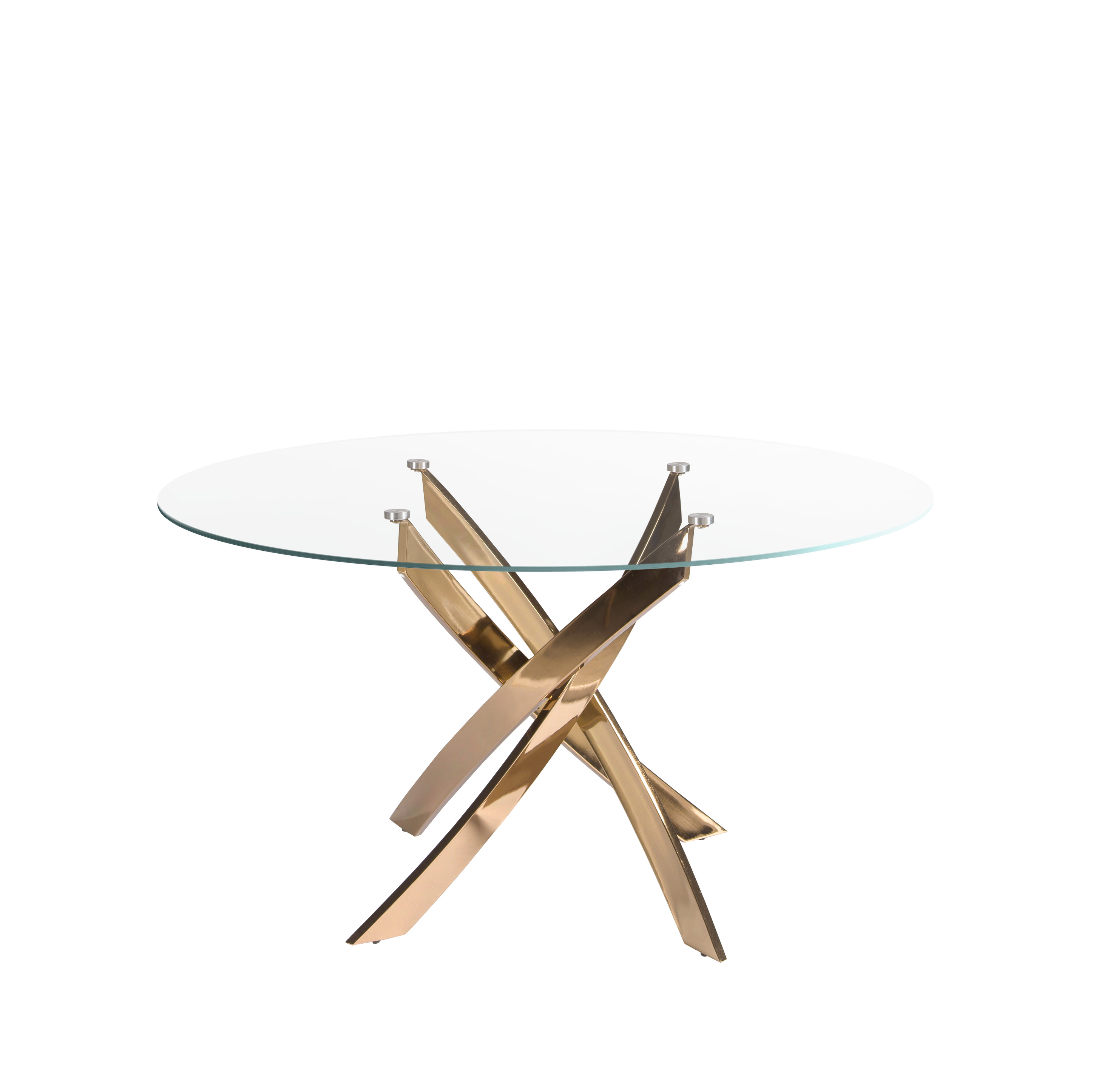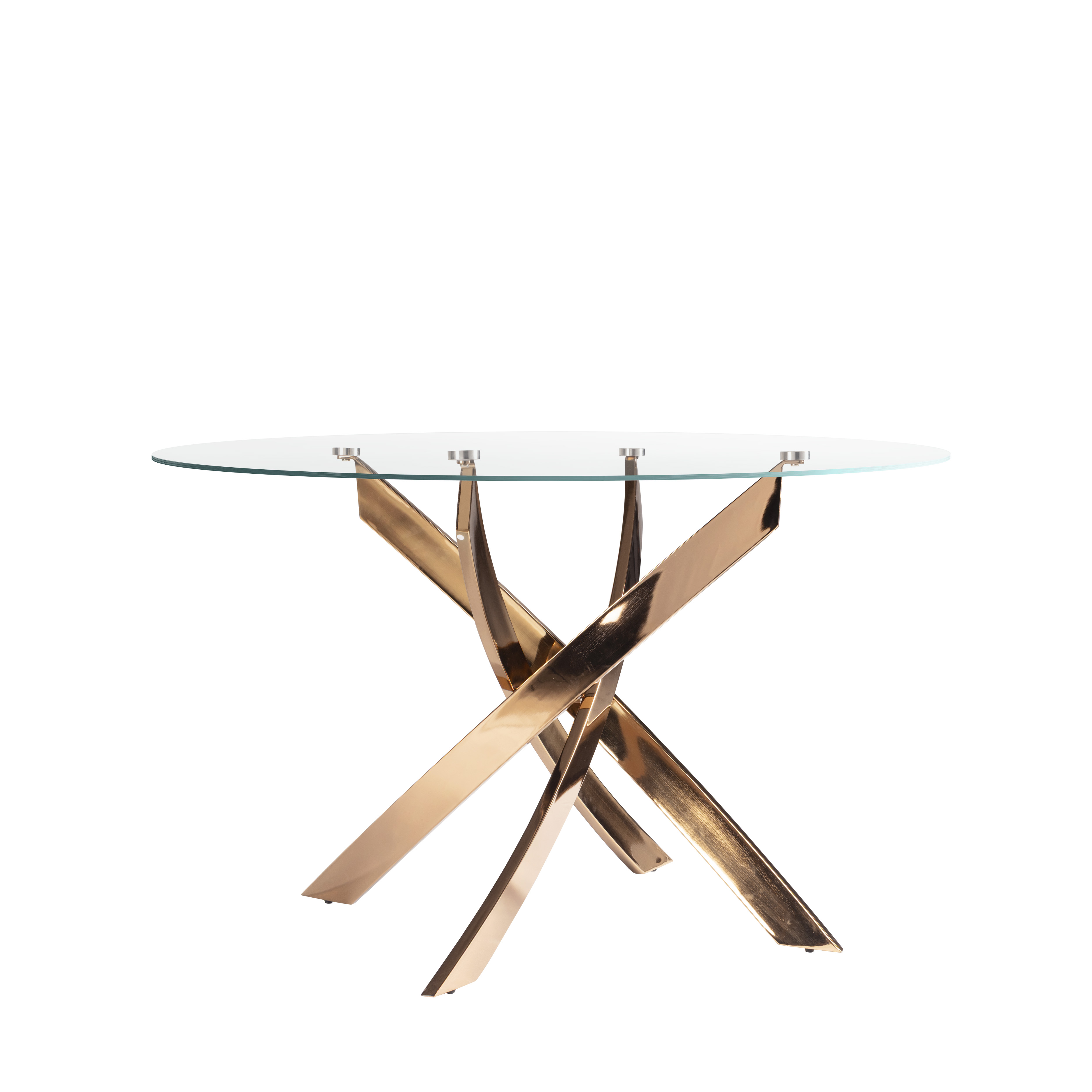 Modern kerek étkezőasztal fix méretű edzett üveglappal, rozé arany színű rozsdamentes acél központi lába feltűnő dizájneleme a bútornak.