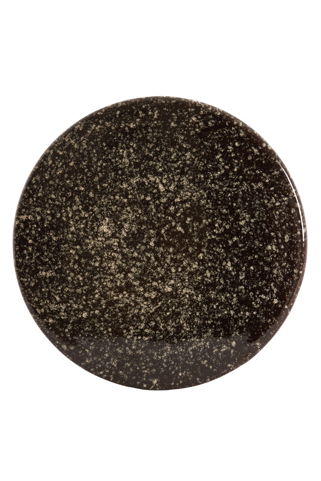 Sötétbarna színű fényes felületű kerek lerakóasztal masszív központi lábbal különleges szemcsézett kőhatású felülete karakteres és természetes megjelenést kölcsönöz.