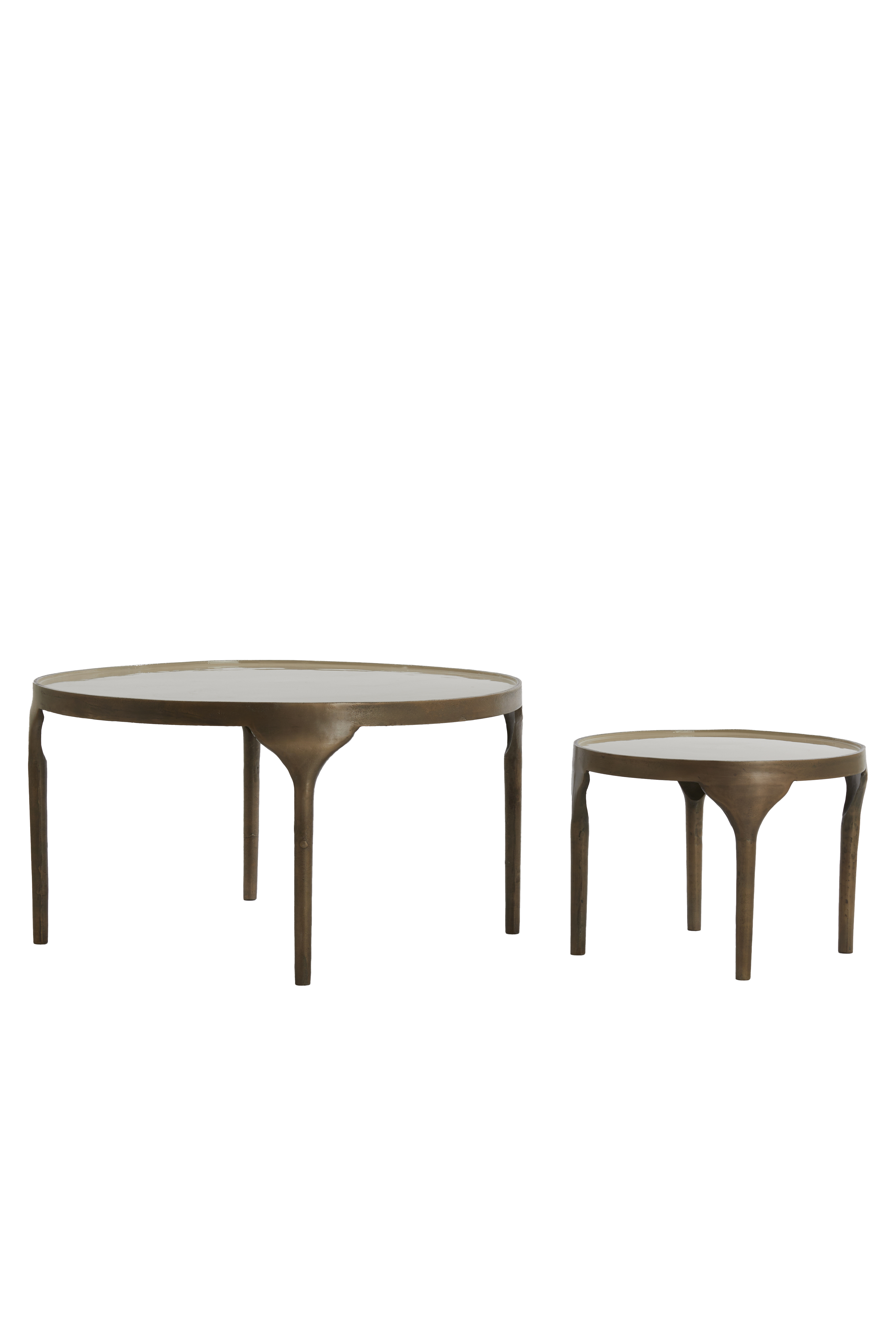 Taupe színű design fém lerakóasztal szett antik bronz színű lábakkal praktikus, elegáns és masszív szett, az eltérő méretű és magasságú asztalok egymás alá csúsztathatók, ezzel kisebb nappalikban is ideális választás, de akár külön elhelyezve is nagyszerű használható. Az asztallap méretéből adódóan nagy lerakófelületet biztosít nagyobb összejövetelek alkalmával is, szép színvilága otthonosságot teremt környezetében.