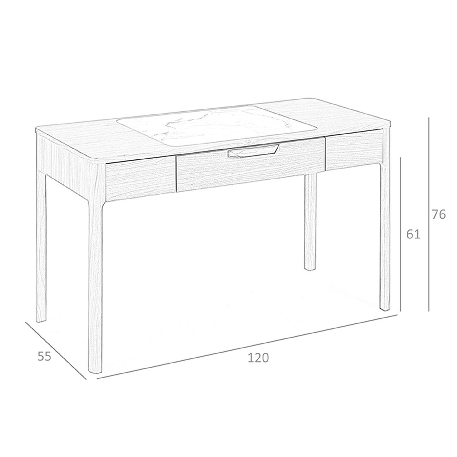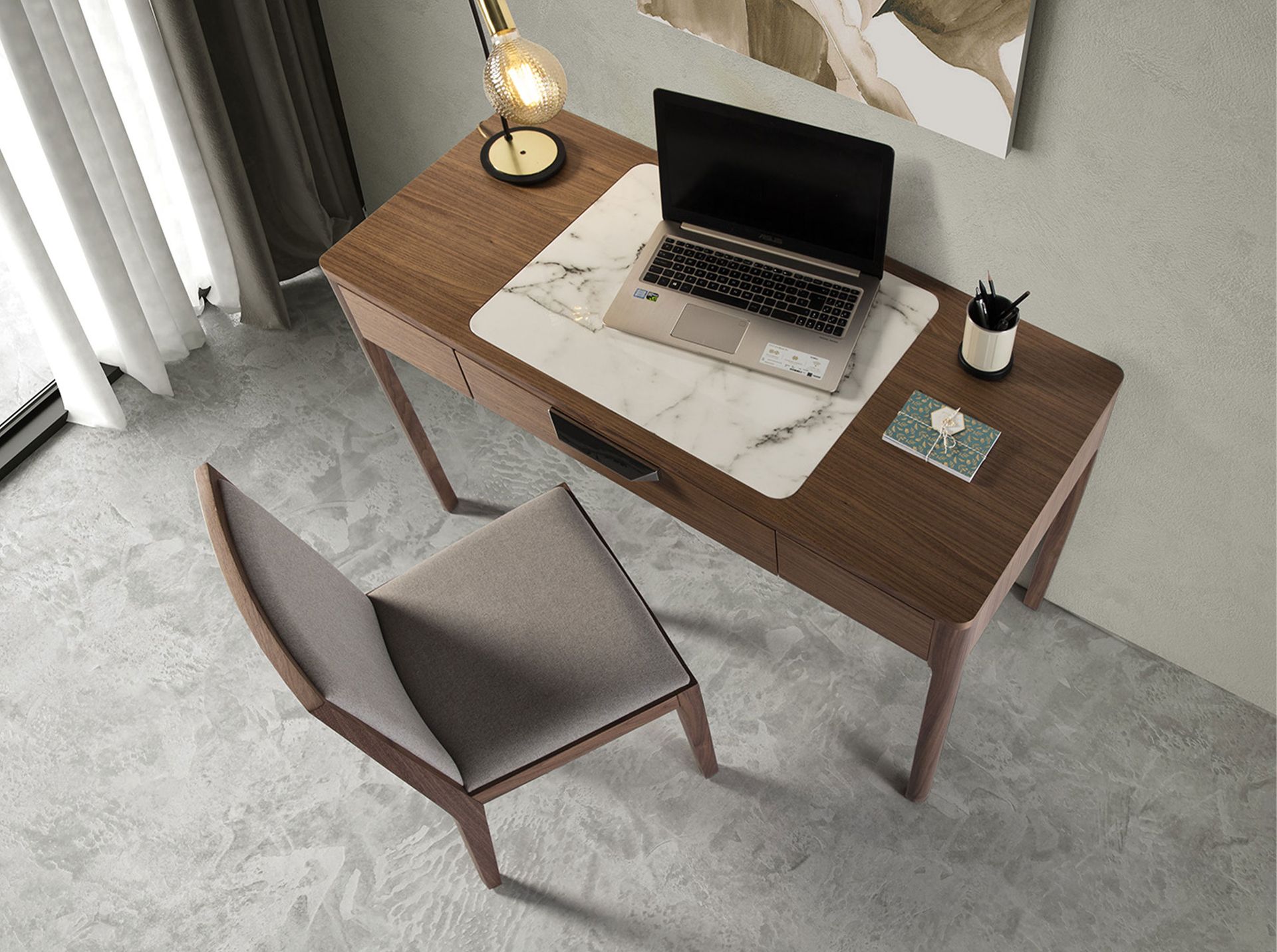 Modern megjelenésű íróasztal natúr dió furnérozott fa szerkezettel, fehér porcelán márvány mintás , fényes szürke erezetes üveglappal és 1 széles fiókkal. Natúr dió furnérozott fa lábai kiemelik a bútor eleganciáját, exkluzív megjelenést kölcsönöznek otthonának. Hálószobába fésülködőasztalként is remekül használható.