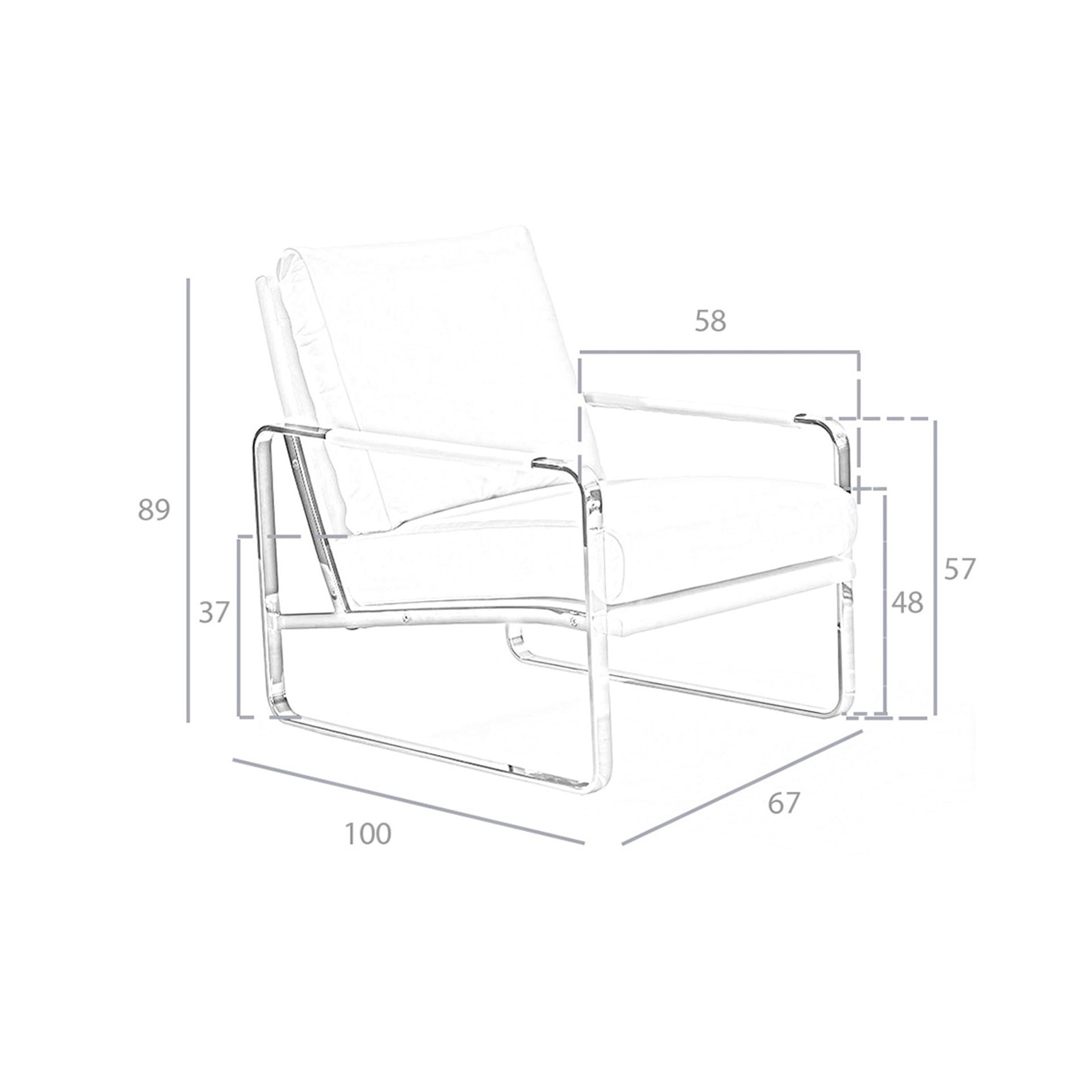 Modern design karfás fotel fehér színű műbőrrel kárpitozott háttámlával és kényelmes ülőfelülettel, krómozott rozsdamentes acél lábakkal.