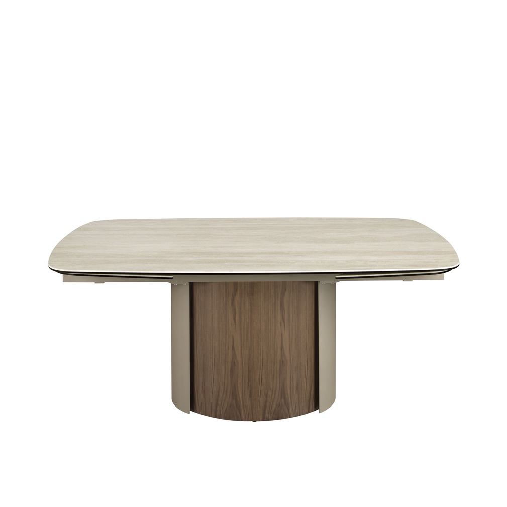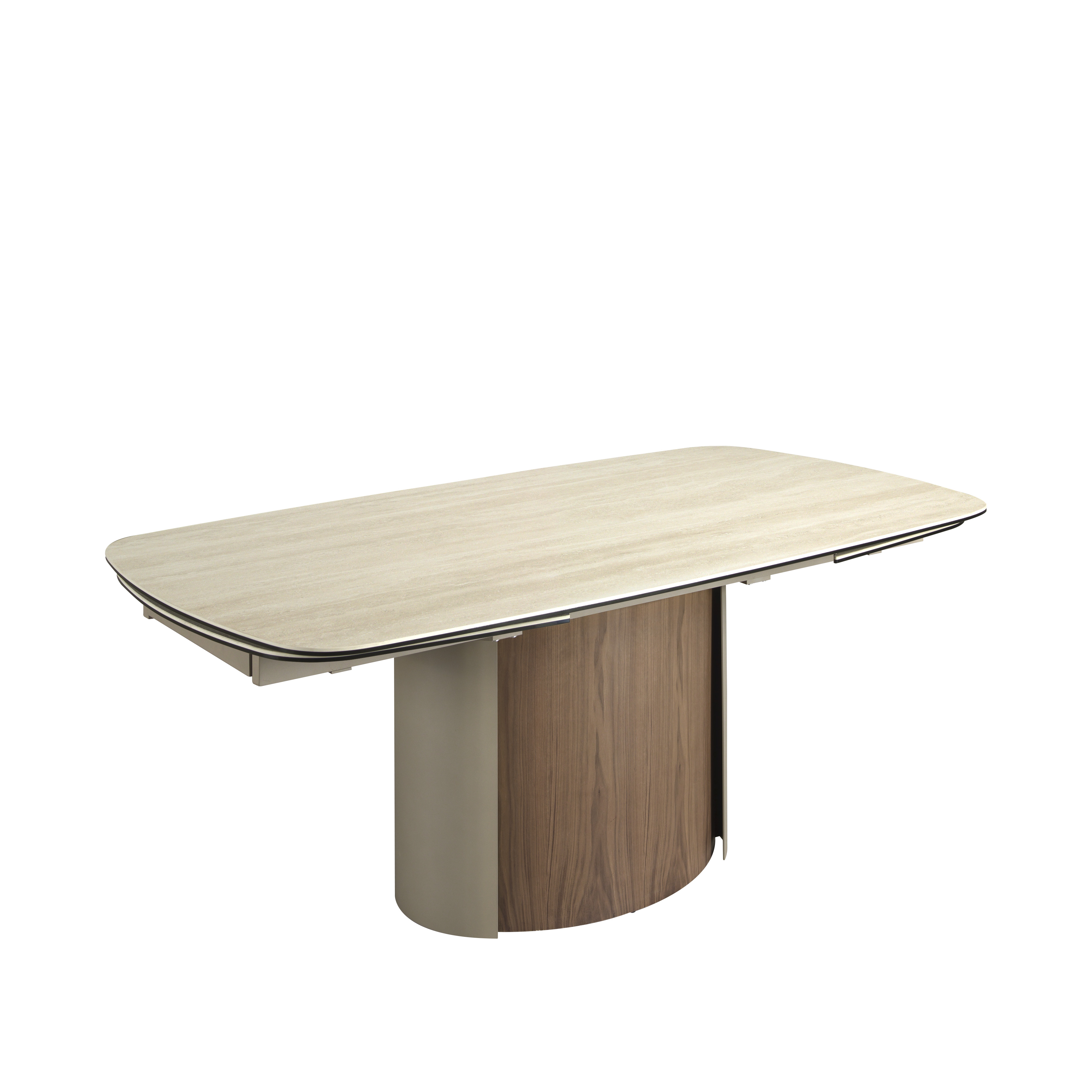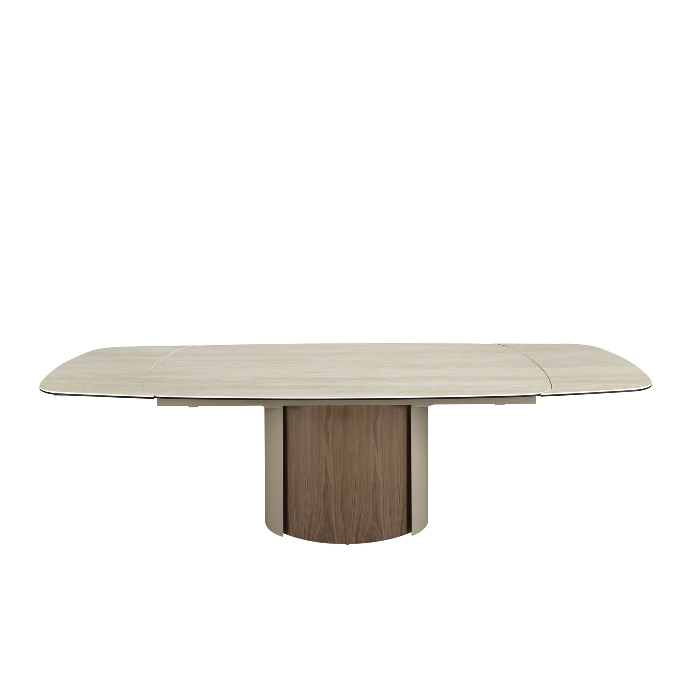Prémium minőségű téglalap alakú kihúzható étkezőasztal matt homokszínű kerámia lappal. Homokszínű metálhatású rozsdamentes acél és 0,5 mm vastag natúr dió furnérozott lábai stabil kialakítása miatt az asztal masszív, állítható méretű asztallapja praktikus és egyben modern megjelenést kölcsönöz a bútornak.