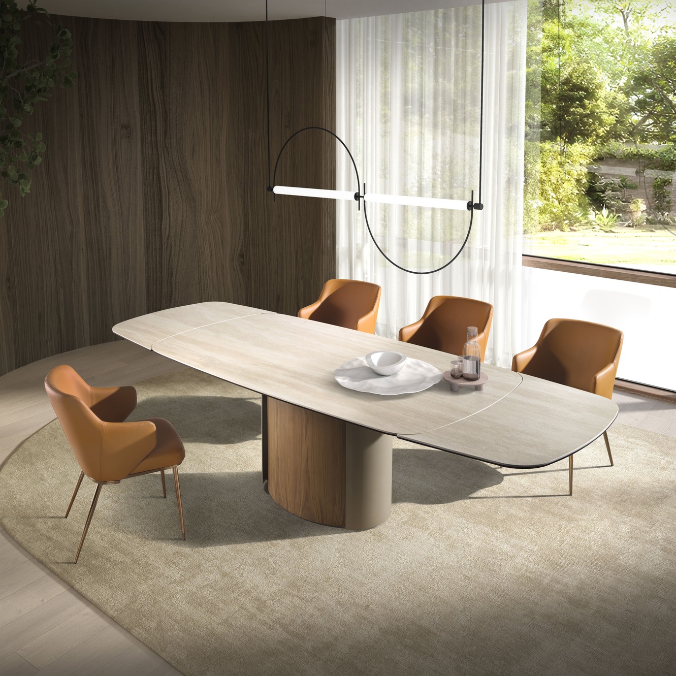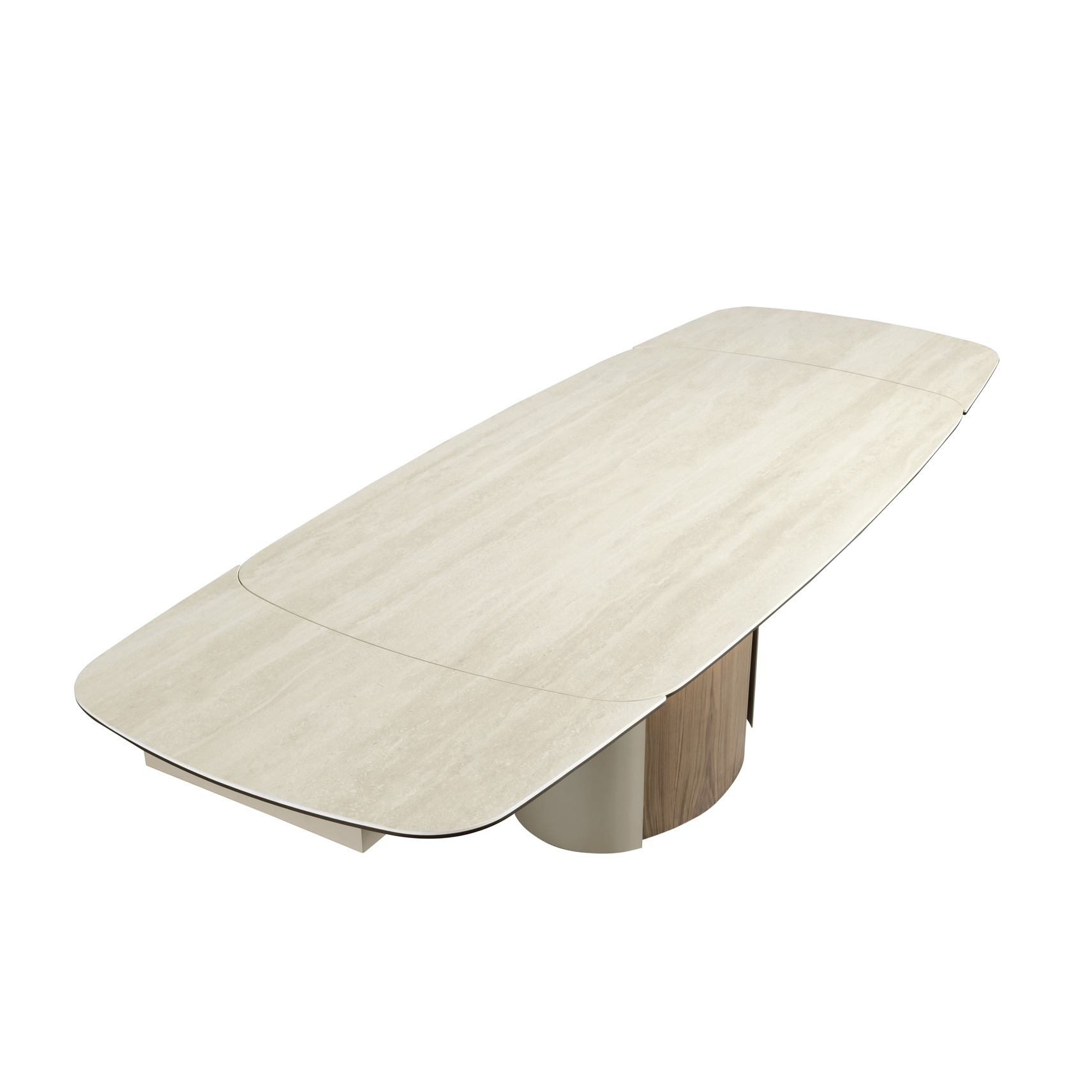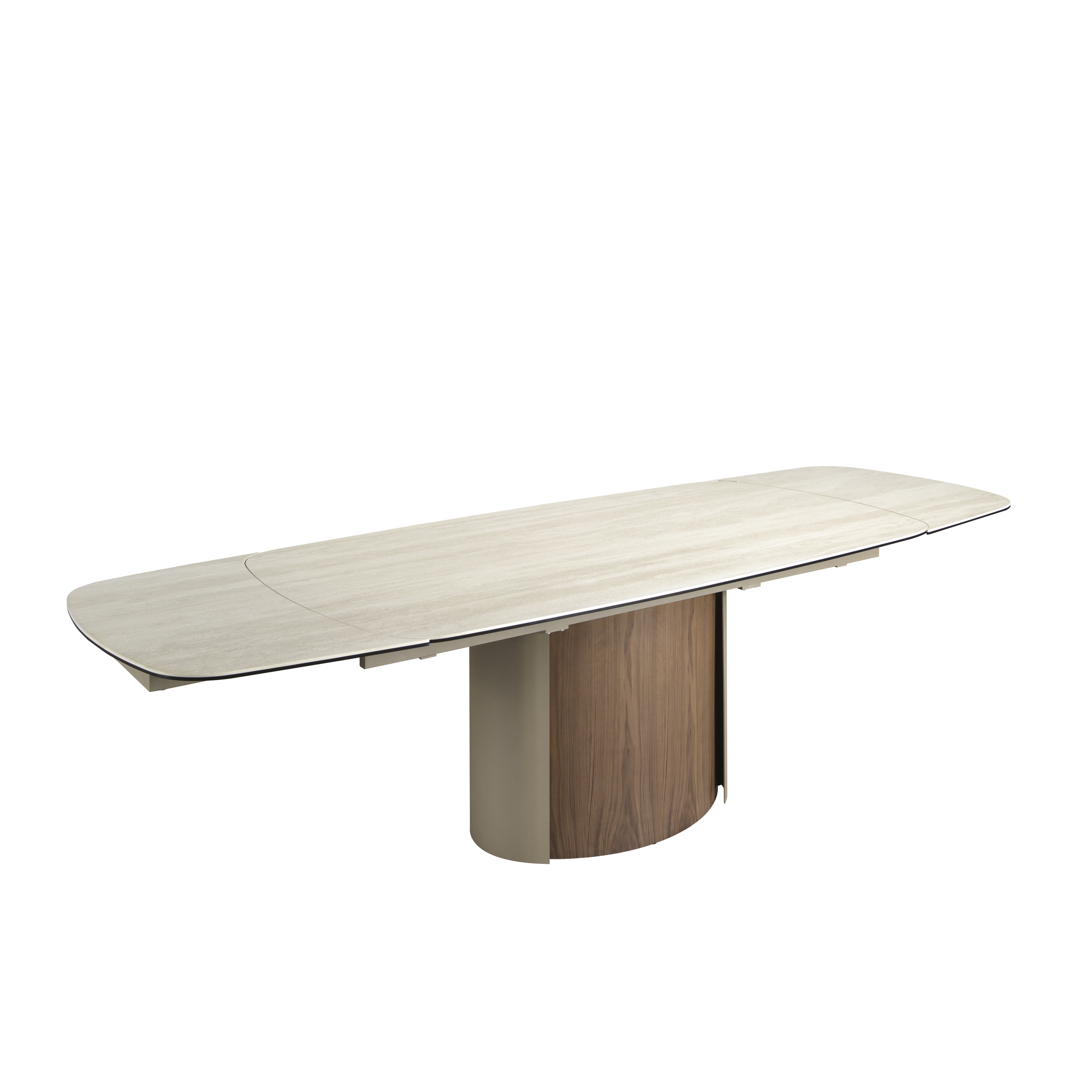Prémium minőségű téglalap alakú kihúzható étkezőasztal matt homokszínű kerámia lappal. Homokszínű metálhatású rozsdamentes acél és 0,5 mm vastag natúr dió furnérozott lábai stabil kialakítása miatt az asztal masszív, állítható méretű asztallapja praktikus és egyben modern megjelenést kölcsönöz a bútornak.