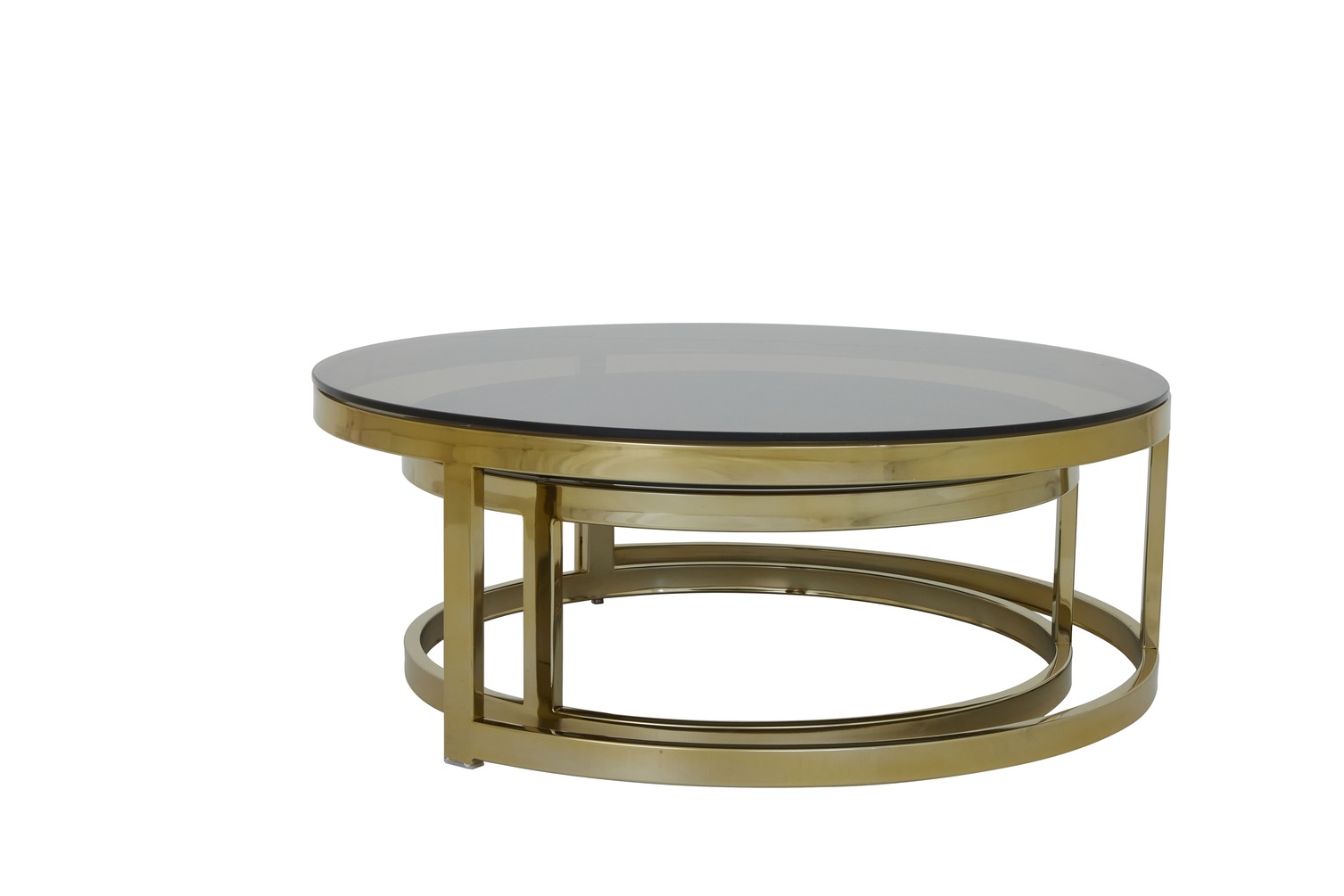 2 db-os design dohányzóasztal szett arany színű fém lábbal, vastagított kerettel valamint füstüveg lappal.
