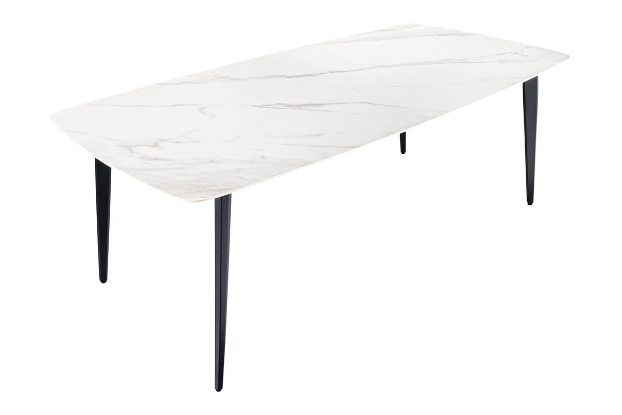 Modern téglalap alakú fix étkezőasztal fényes felületű szürke erezetes fehér porcelán márványlappal. Fekete színű rozsdamentes acél lába stabil kialakítása miatt az asztal masszív és elegáns.