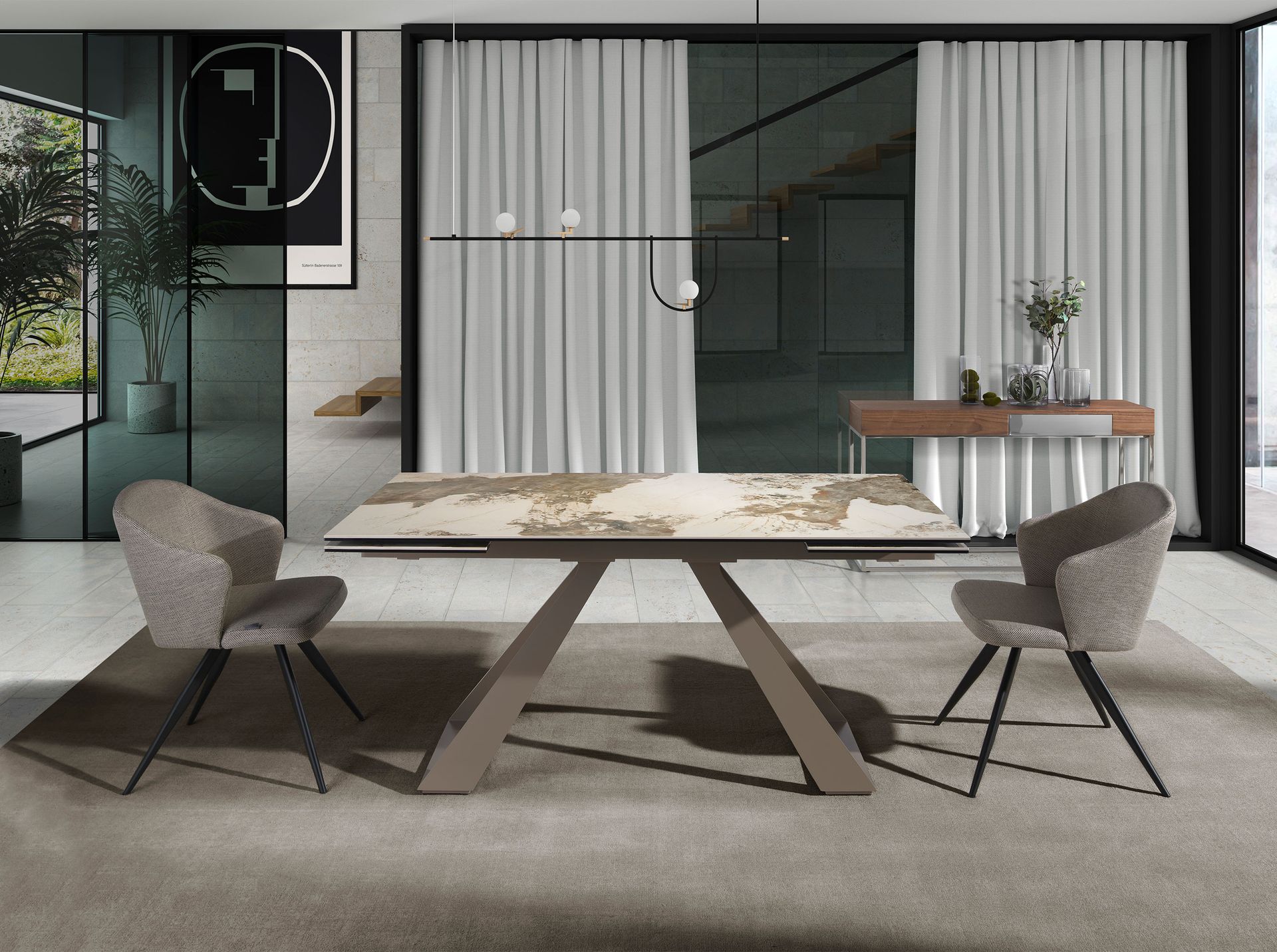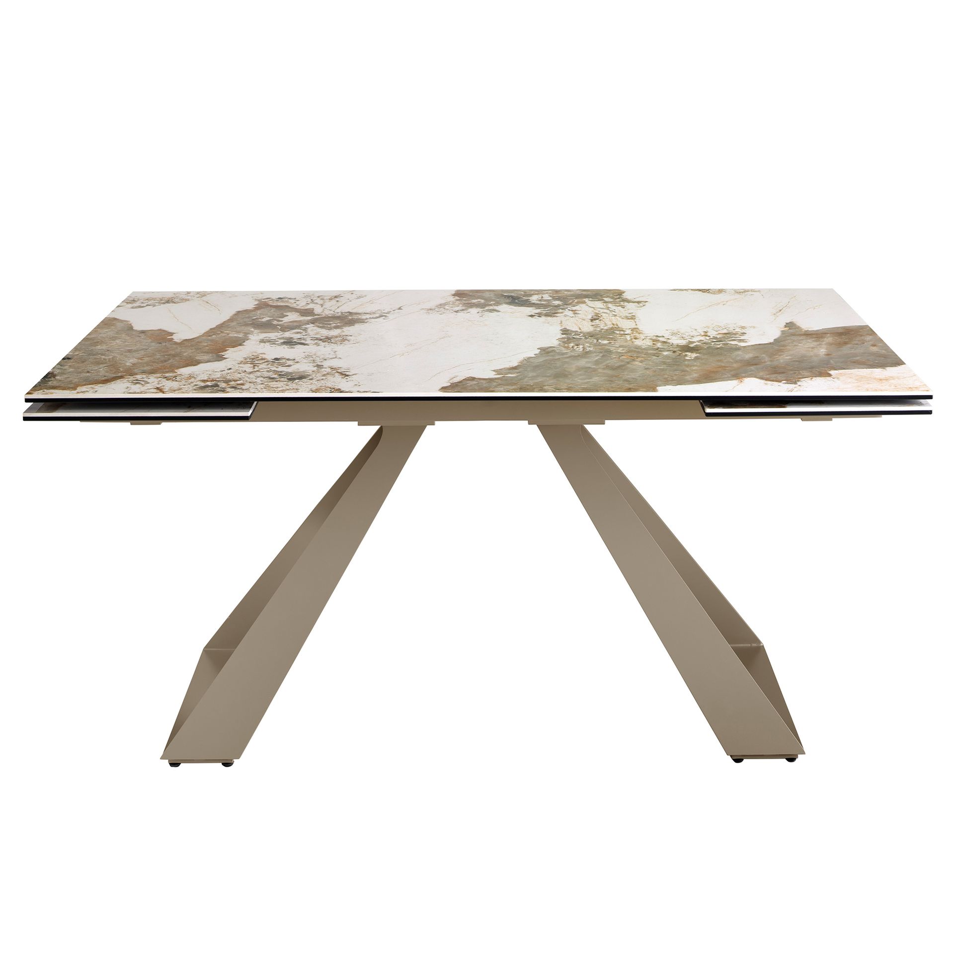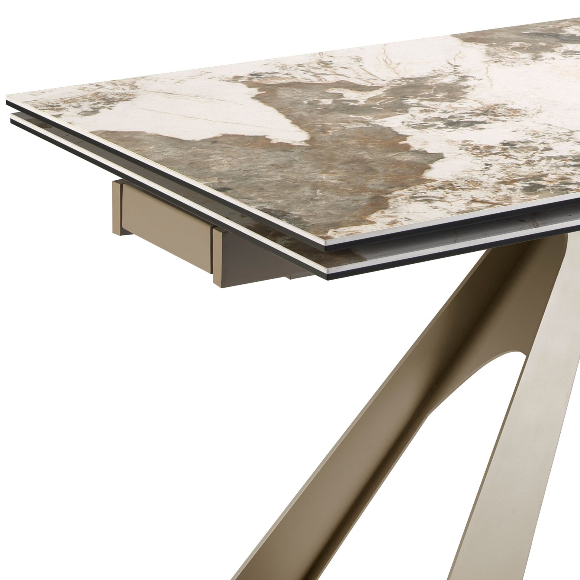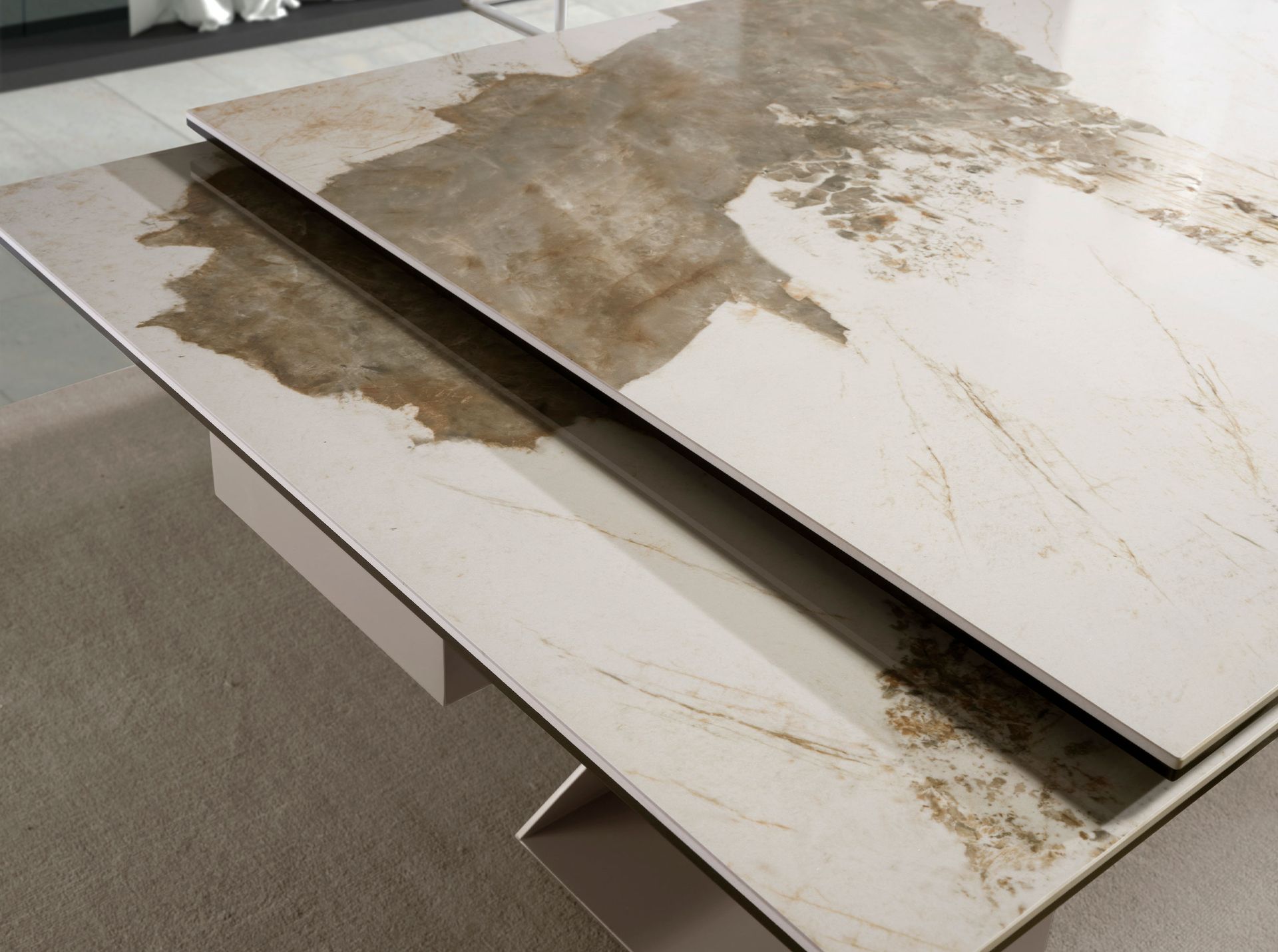 Prémium minőségű téglalap alakú kihúzható étkezőasztal fényes felületű földszínű erezetes fehér kerámia lappal. Bézs-szürke színű rozsdamentes acél lábai stabil kialakítása miatt az asztal masszív, állítható méretű asztallapja praktikus és egyben modern megjelenést kölcsönöz a bútornak.