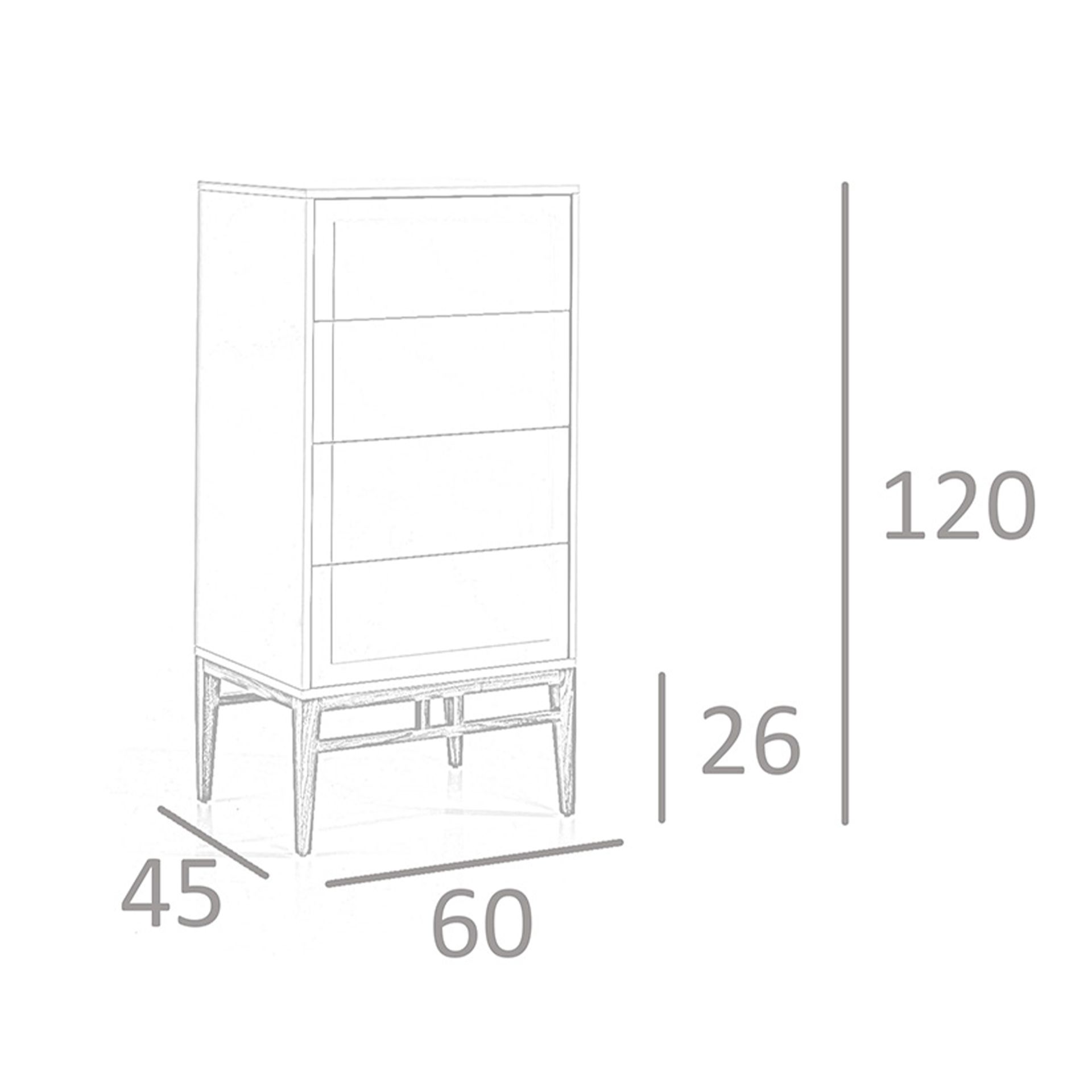 Modern megjelenésű magas komód bézs színű mdf fa szerkezettel és natúr dió furnér fa lábakkal. Tágas tárolóhellyel, 4 fiókkal került kialakításra melyek enyhe nyomásra nyílnak és lágyan záródó rendszerrel működnek.