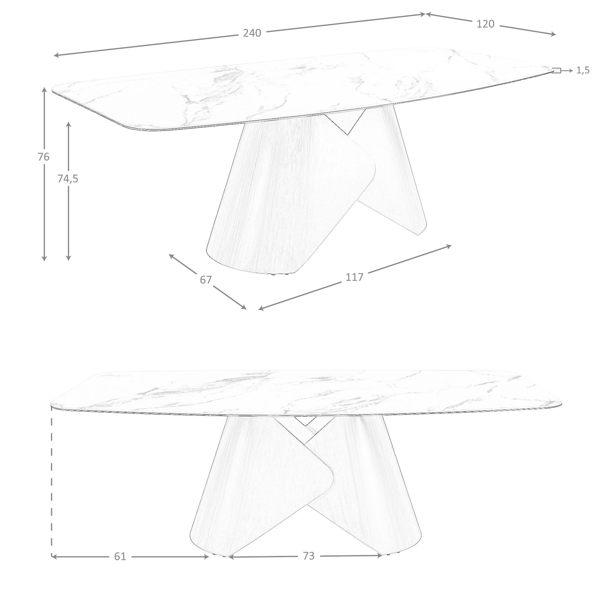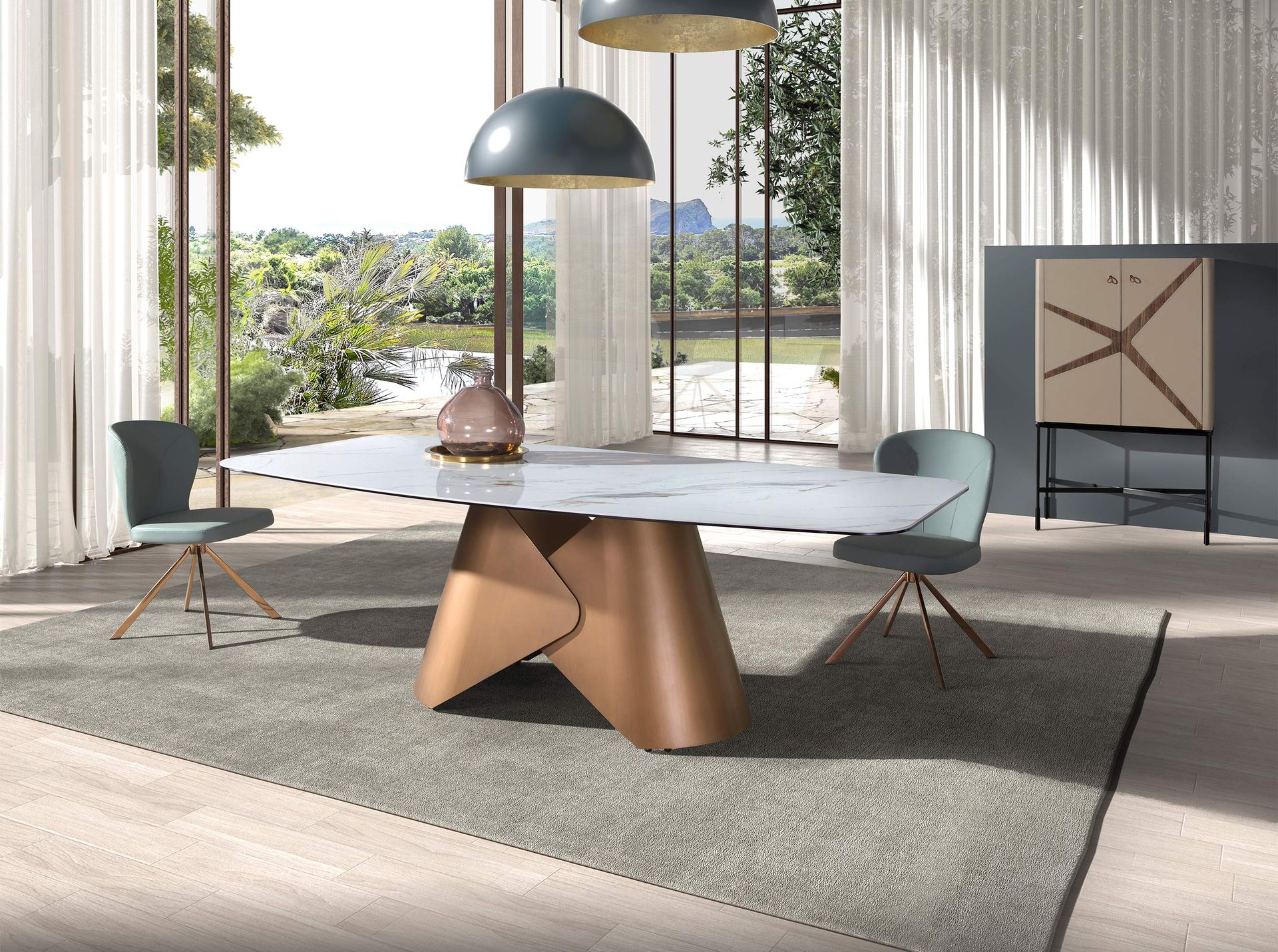 Modern, ovális prémium design étkezőasztal masszív, fix fényes felületű fehér porcelán márványlappal, szürke és barna erezetekkel. Rozsdamentes acél lába bronz színű, különleges dizájnjával exkluzív és egyedi megjelenést kölcsönöz az asztalnak.