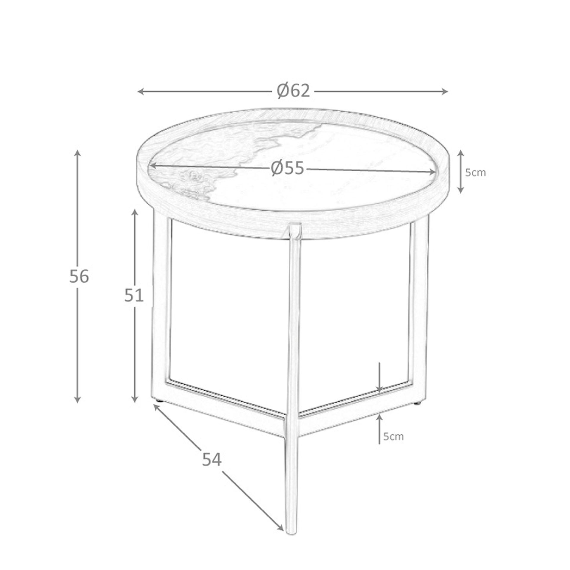 Modern kerek lerakóasztal natúr dió furnérral borított fából, elegáns fényes fehér porcelán márvány asztallappal, földszínű erezettel. Sötét metál rozsdamentes acél lába masszív és dekoratív megjelenésű. Ideális kanapé, fotel mellé helyezve vagy a hálószobába az ágy mellett praktikus pakolófelületet biztosít könyveknek, lámpának, italoknak és dekorációknak egyaránt.