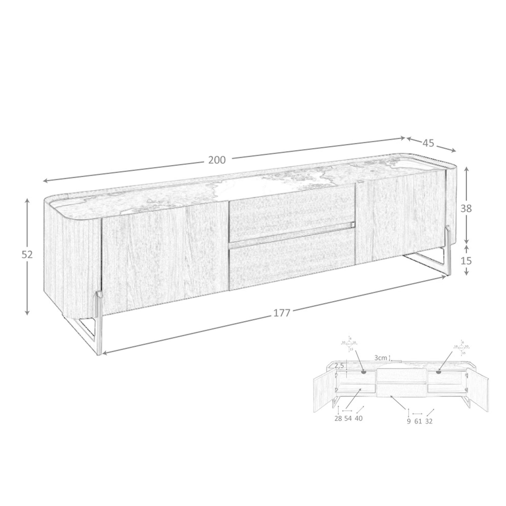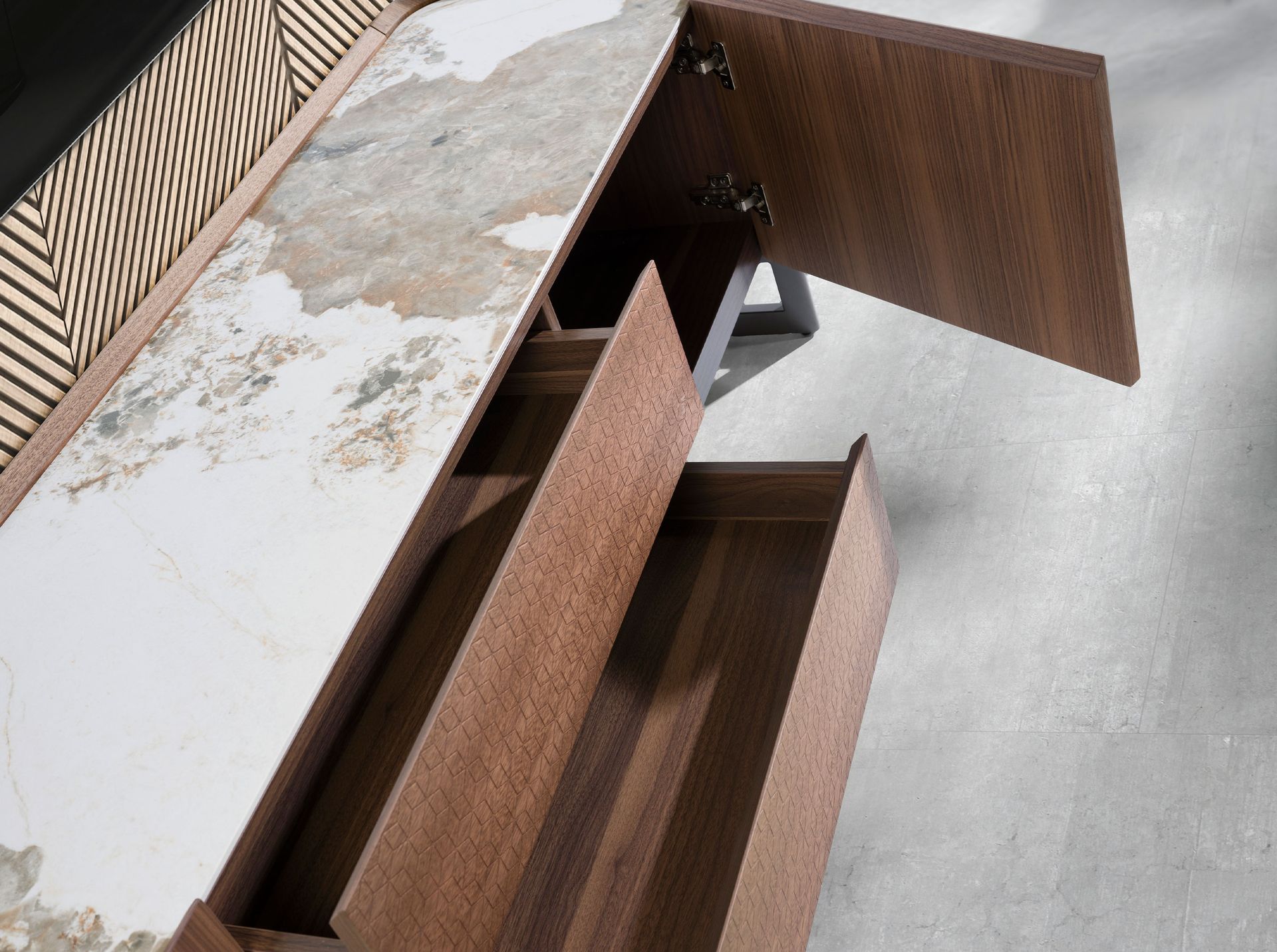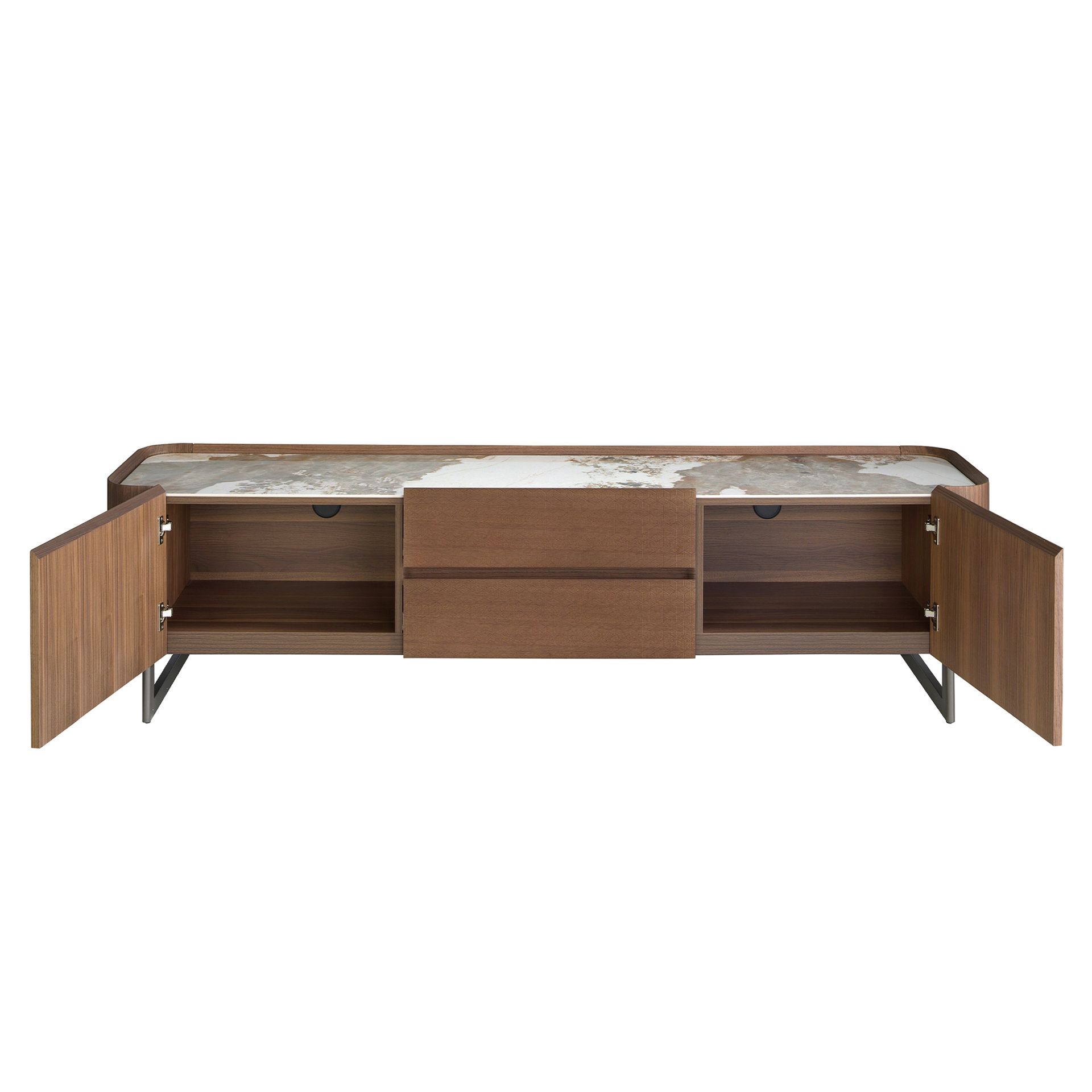 Elegáns és kifinomult megjelenésű prémium tv állvány, ahol csodálatos összhangban van a dió színű fa bútor a fehér színű márványmintás üveglap szürke és barna színű erezetével, praktikus tárolóhelyei megkönnyítik egy rendezett és komfortos otthon kialakítását.