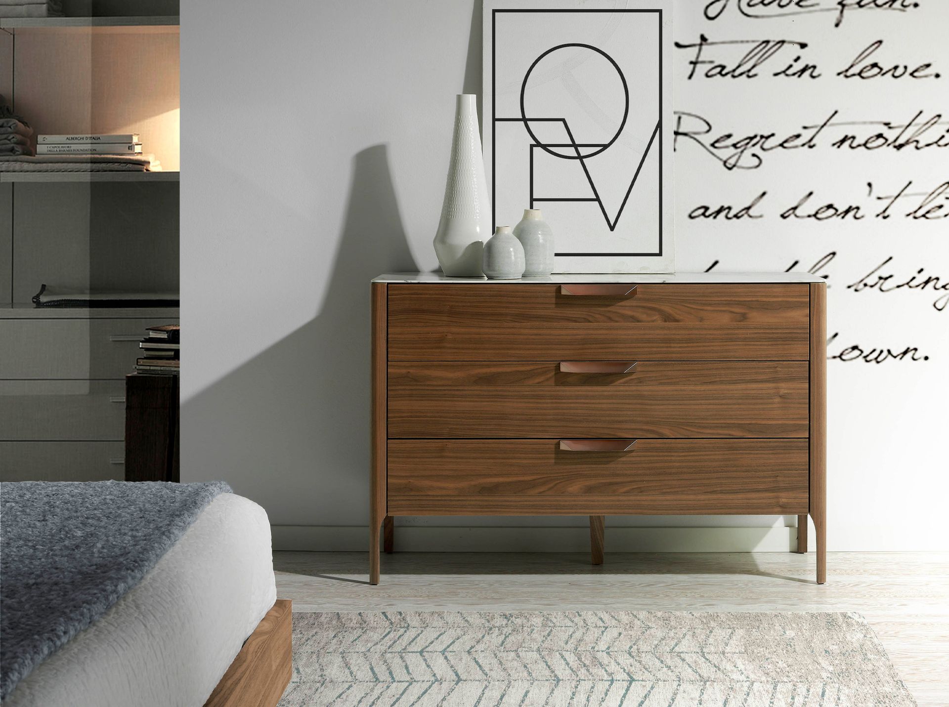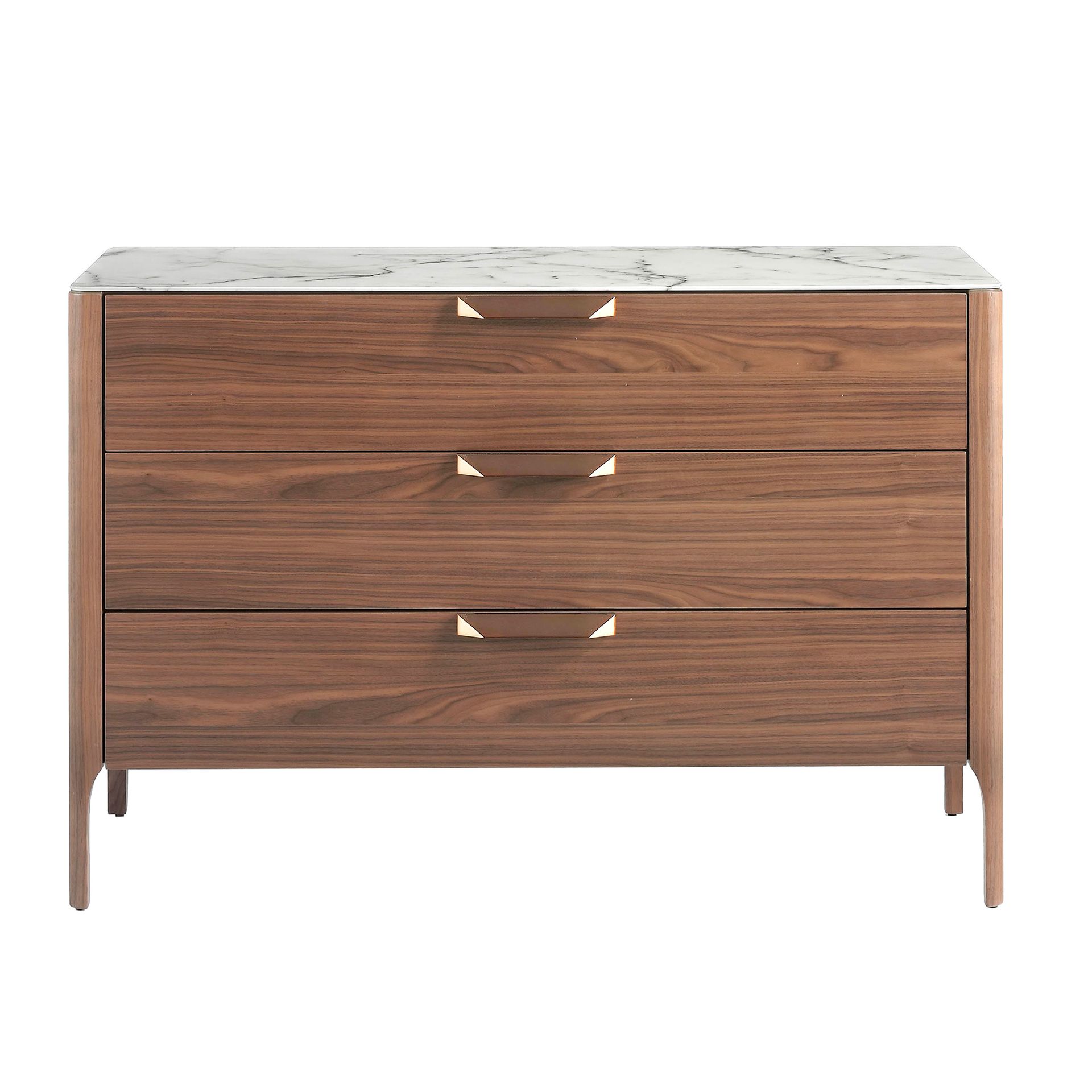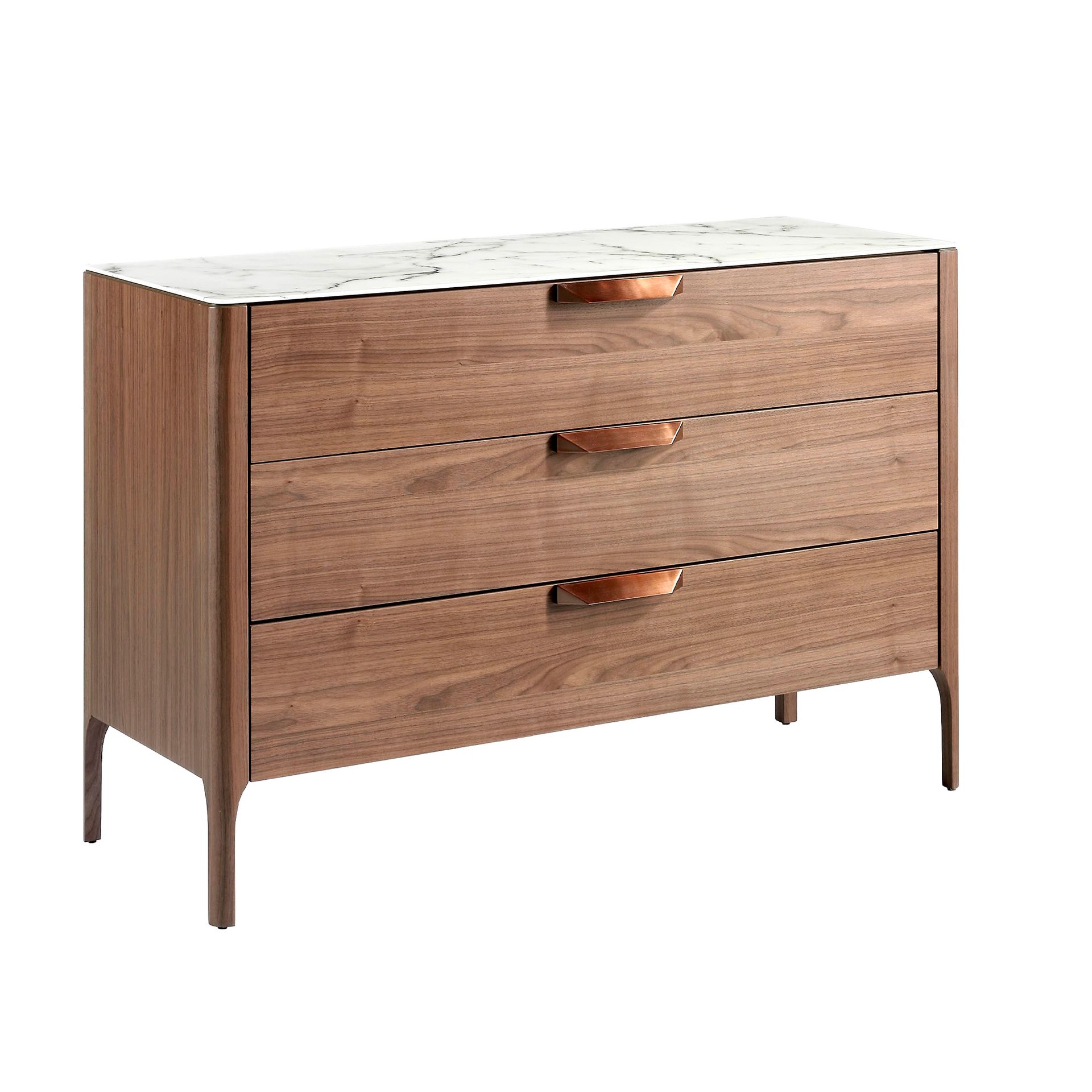 Modern megjelenésű komód natúr dió furnérozott fa szerkezettel és natúr dió furnérozott fa lábakkal. Tágas tárolóhellyel, 3 fiókkal került kialakításra, melyek réz színű rozsdamentes acél fogantyúval nyílnak és lágyan záródó rendszerrel működnek.