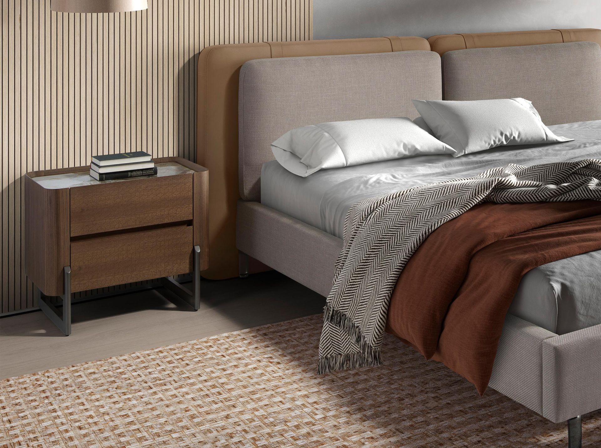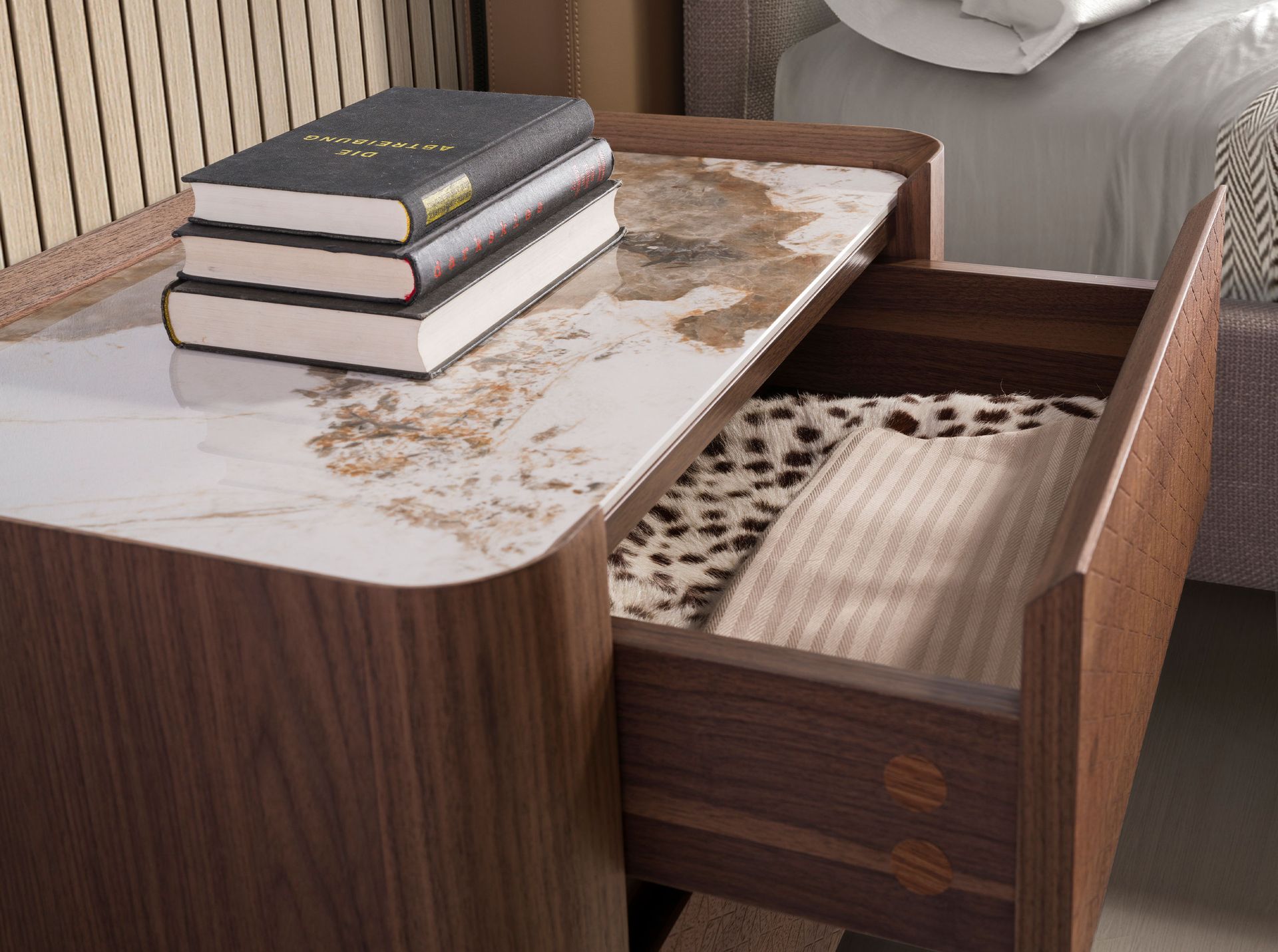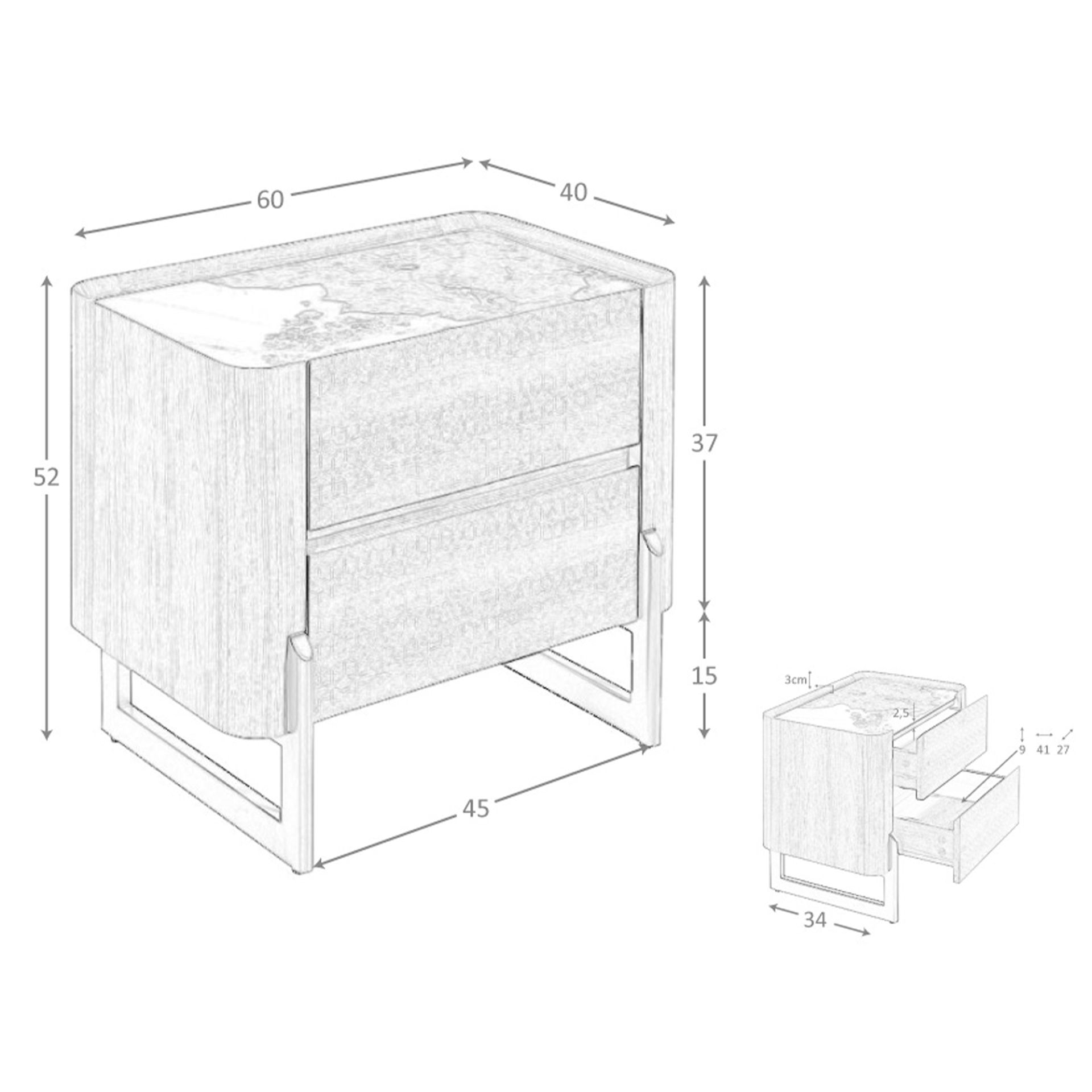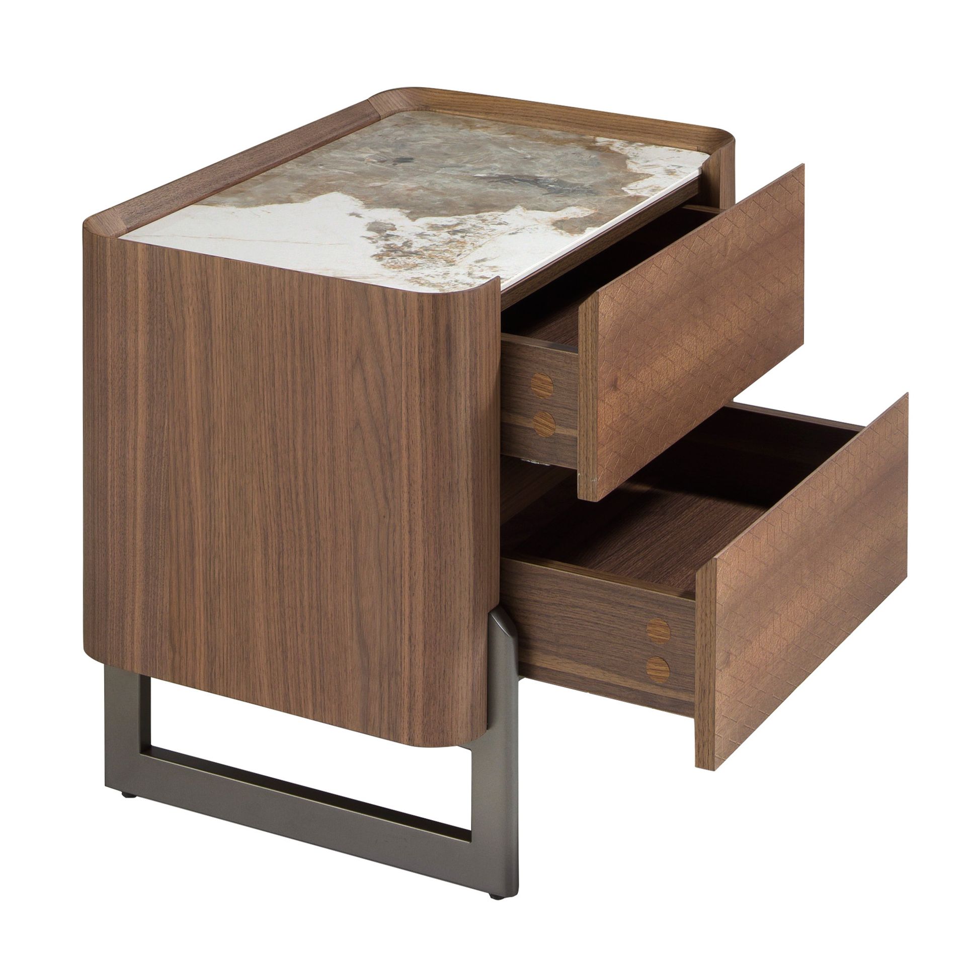 Natúr dió furnérozott fa szerkezetes modern éjjeli szekrény sötét metál rozsdamentes acél lábakkal, elegáns fényes fehér porcelán márványlappal, szürke és barna erezetekkel.