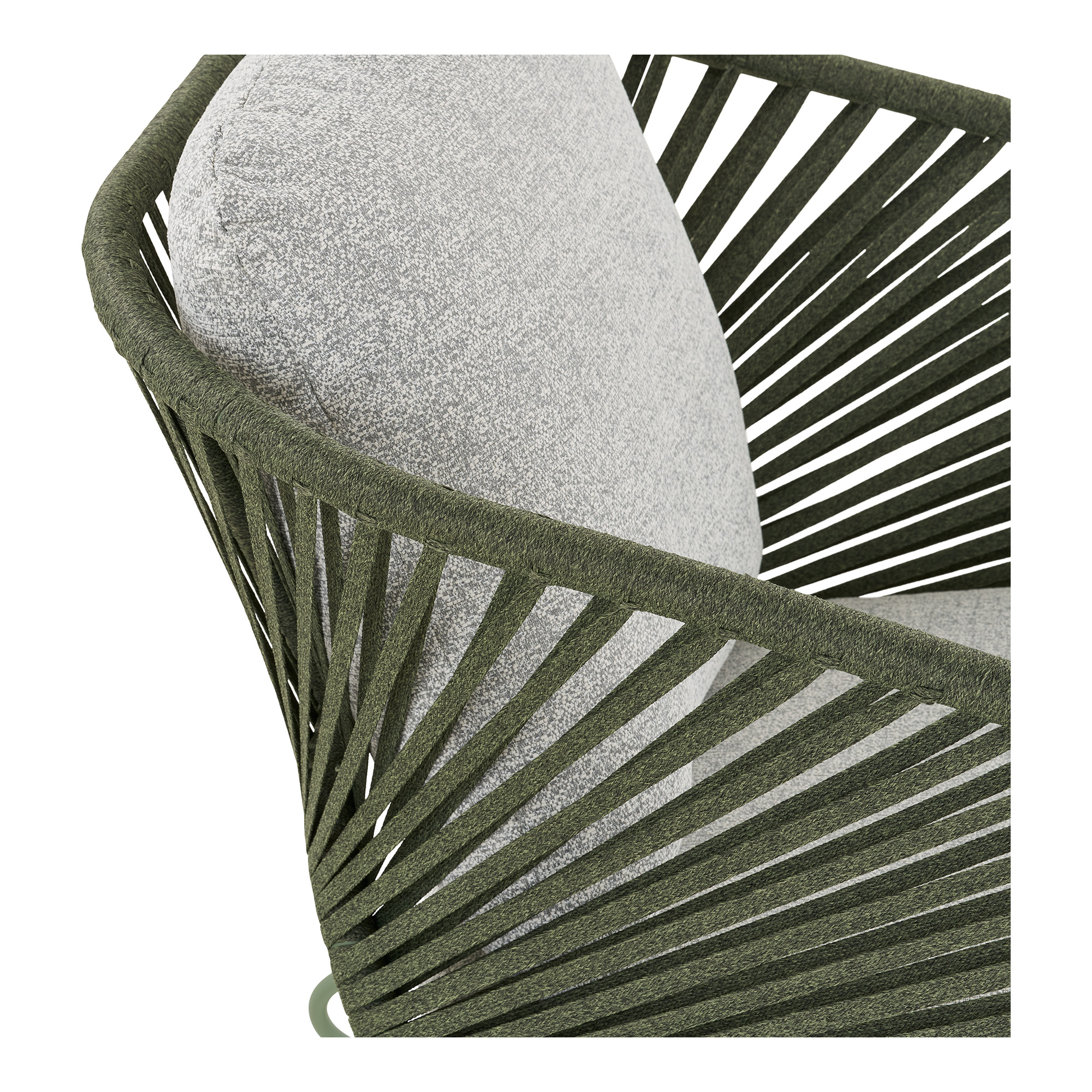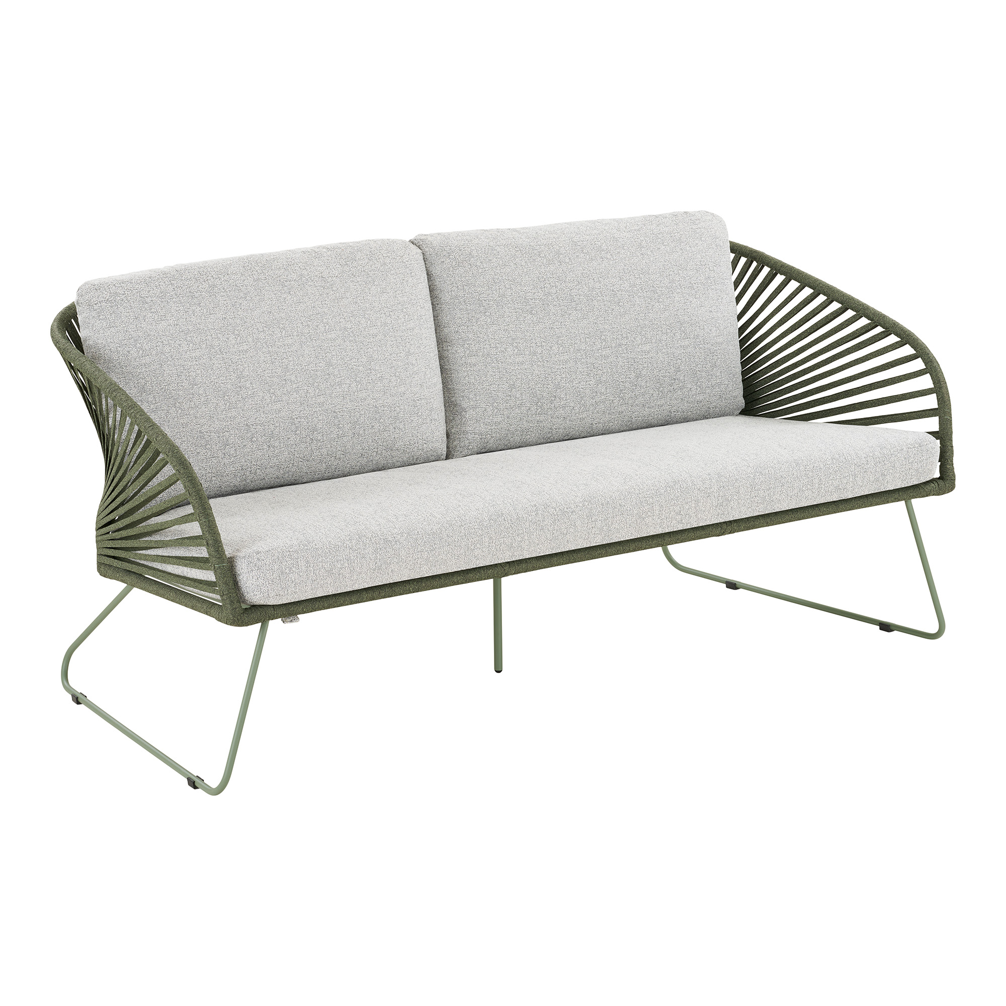 Design kerti bútor szett , szürke színű kötél fonatos ülőgarnitúra halványzöld színű acél vázzal és cipzározható kényelmes ülő és hátpárnákkal továbbá 2 db dohányzóasztallal, nagyszerű választás teraszra, kertbe egyaránt .Élvezze a szép időt ezzel a stílusos kerti bútor szettel, amely stabil és elegáns, tökéletes kényelmet biztosít egy jó könyvhöz vagy egy jó beszélgetéshez.