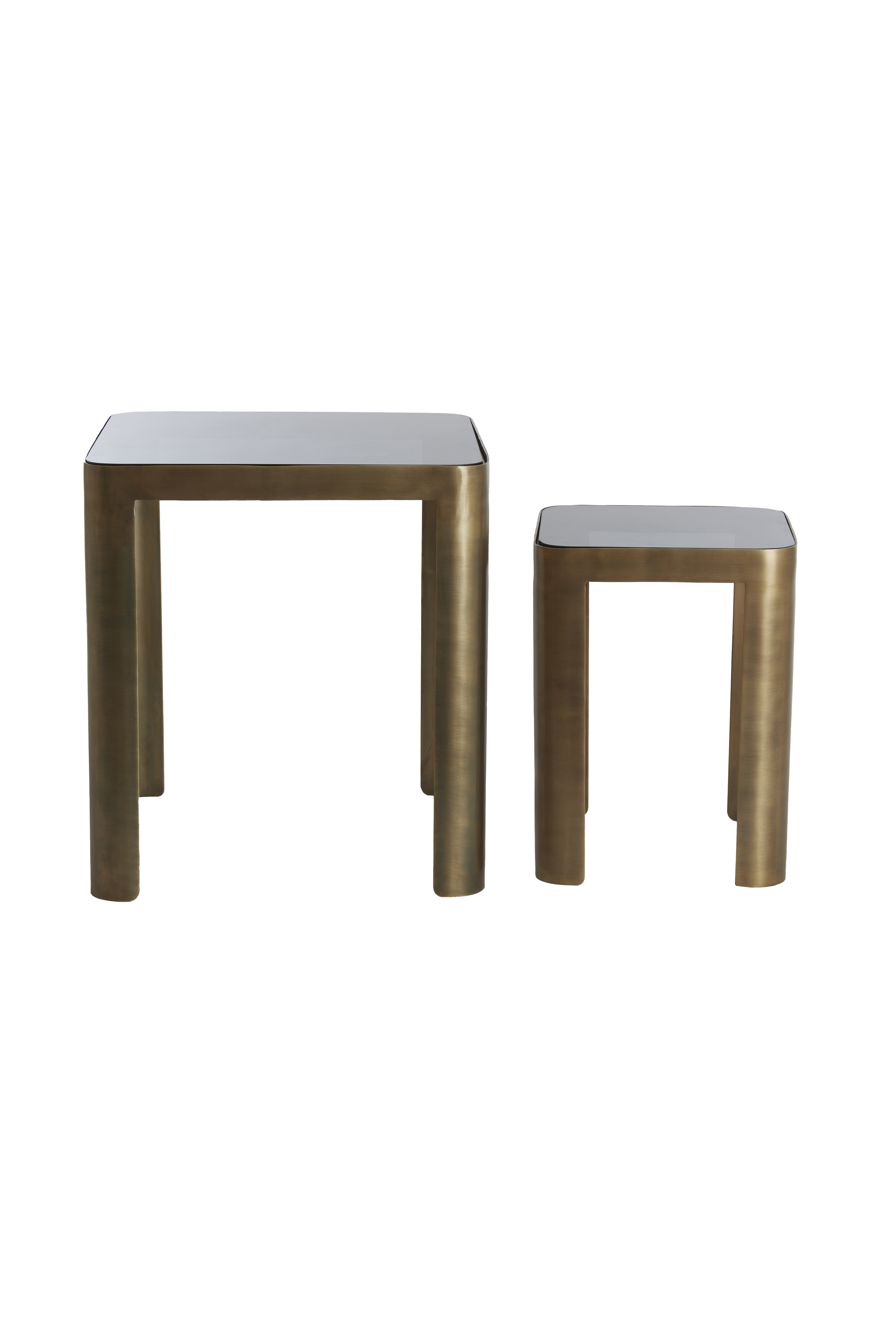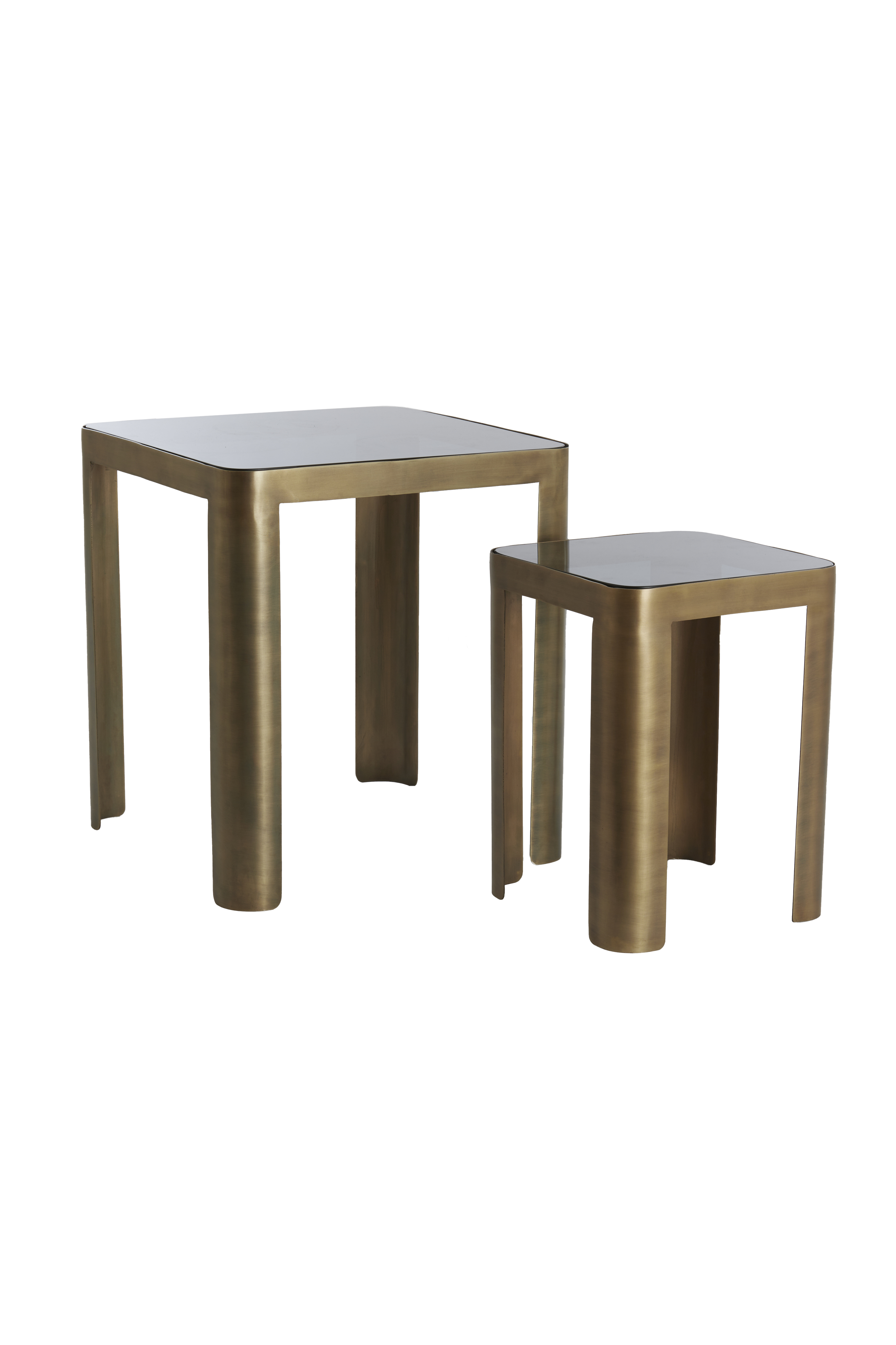 Antik bronz színű fém design lerakóasztal szett füst színű üveglappal egyszerre dekoratív és masszív, nappaliban, hálószobában elhelyezve ideális lerakófelületet biztosít könyveknek, lámpának, egyéb dísztárgyaknak,italoknak, elegáns vastagított kerete egyrészt szilárdítja, továbbá exkluzív megjelenést biztosít a szettnek.