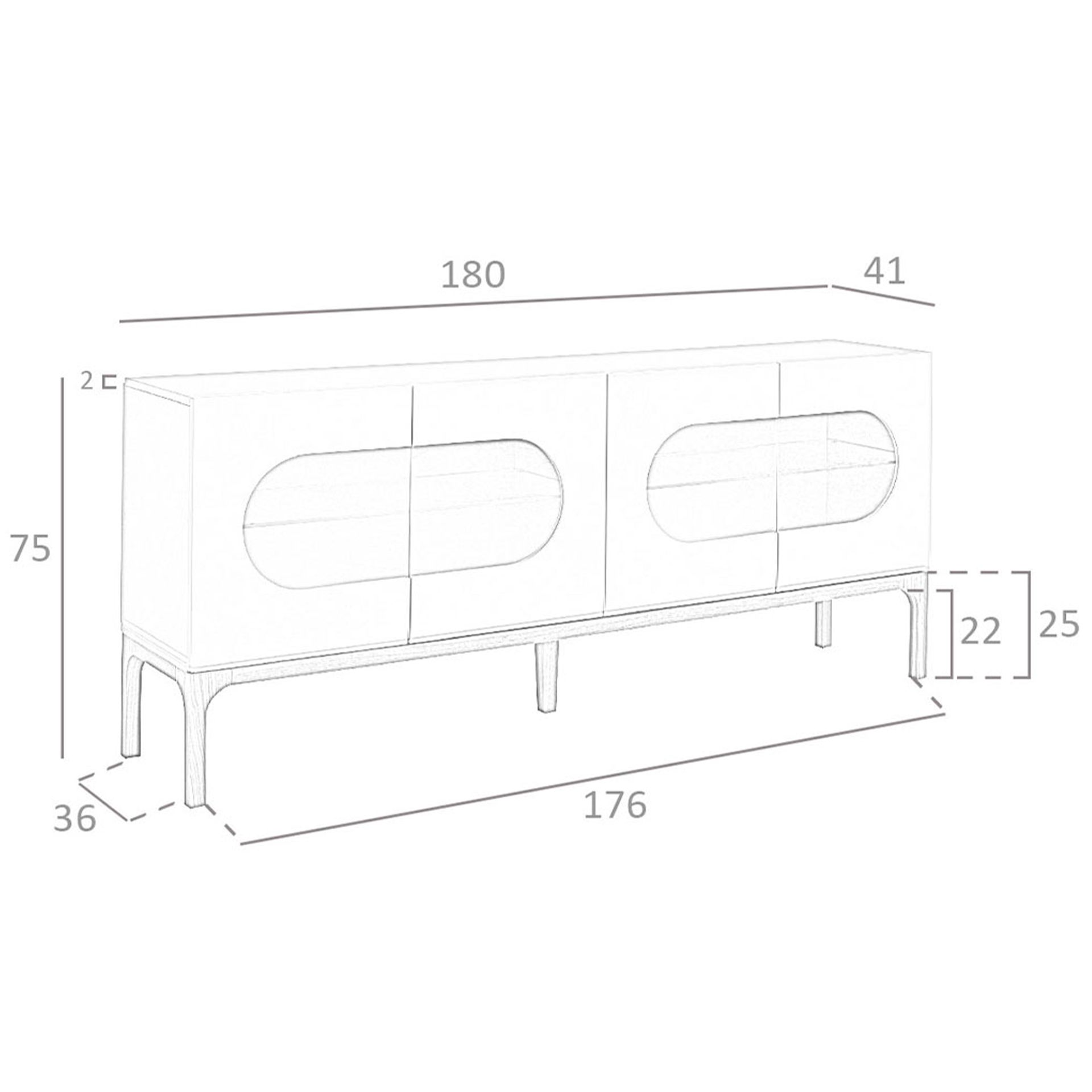 Modern stílusú tálaló komód szürke színű mdf faszerkezettel és eredeti dió színű fa lábakkal, a szekrény belső világítása harmóniát és nyugodt légkört teremt, edzett üveg ajtórészletei és polckialakítása letisztult és elegáns megjelenést kölcsönöz a bútornak