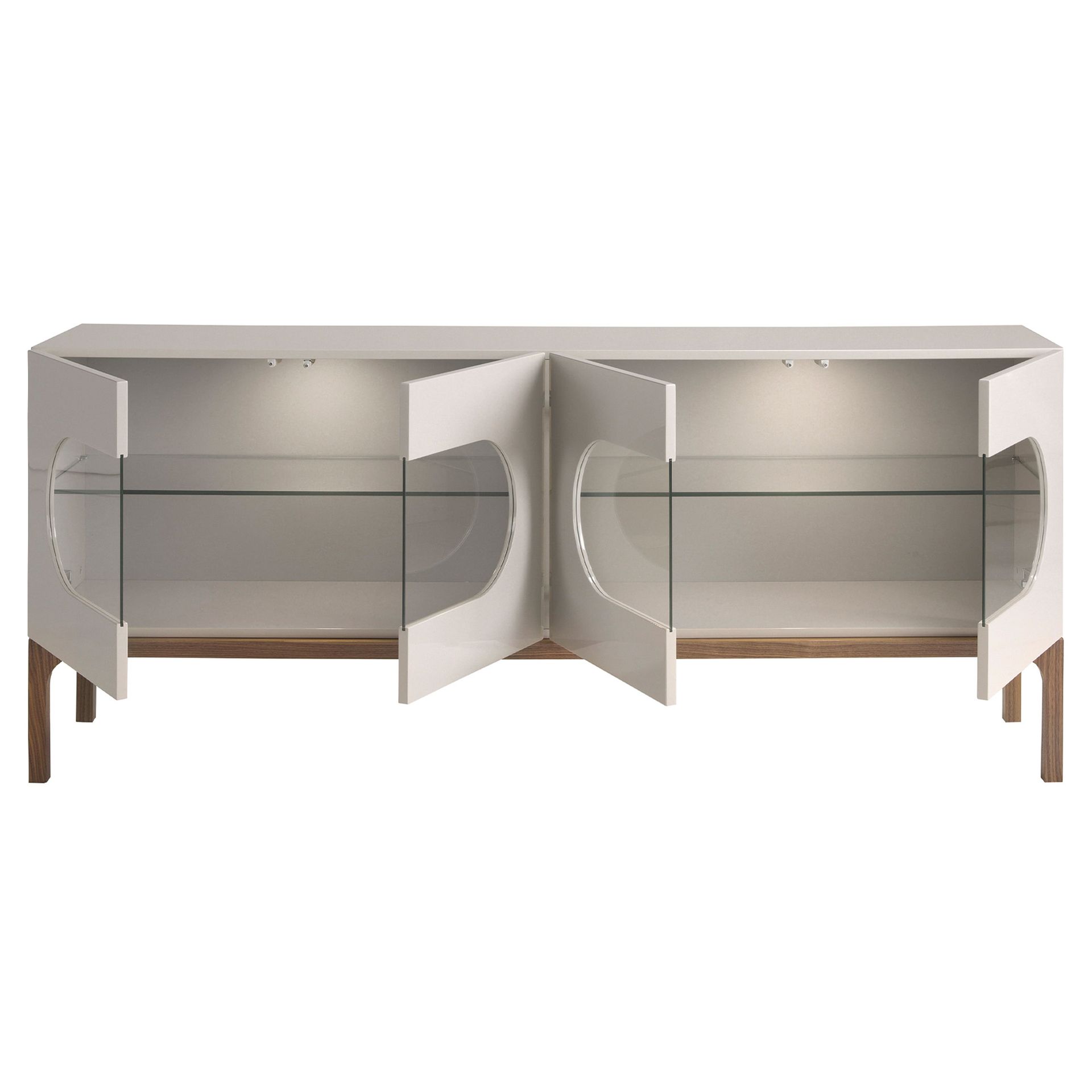 Lakkozott felülete elegáns hangulatú, kivehető és állítható magasságú edzett üveg polcainak köszönhetően bőséges pakolófelületet biztosítanak tányérok, poharak, asztalterítők és egyéb használati tárgyak részére.
