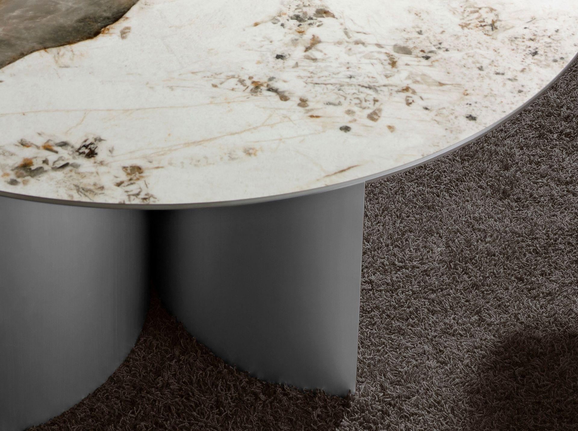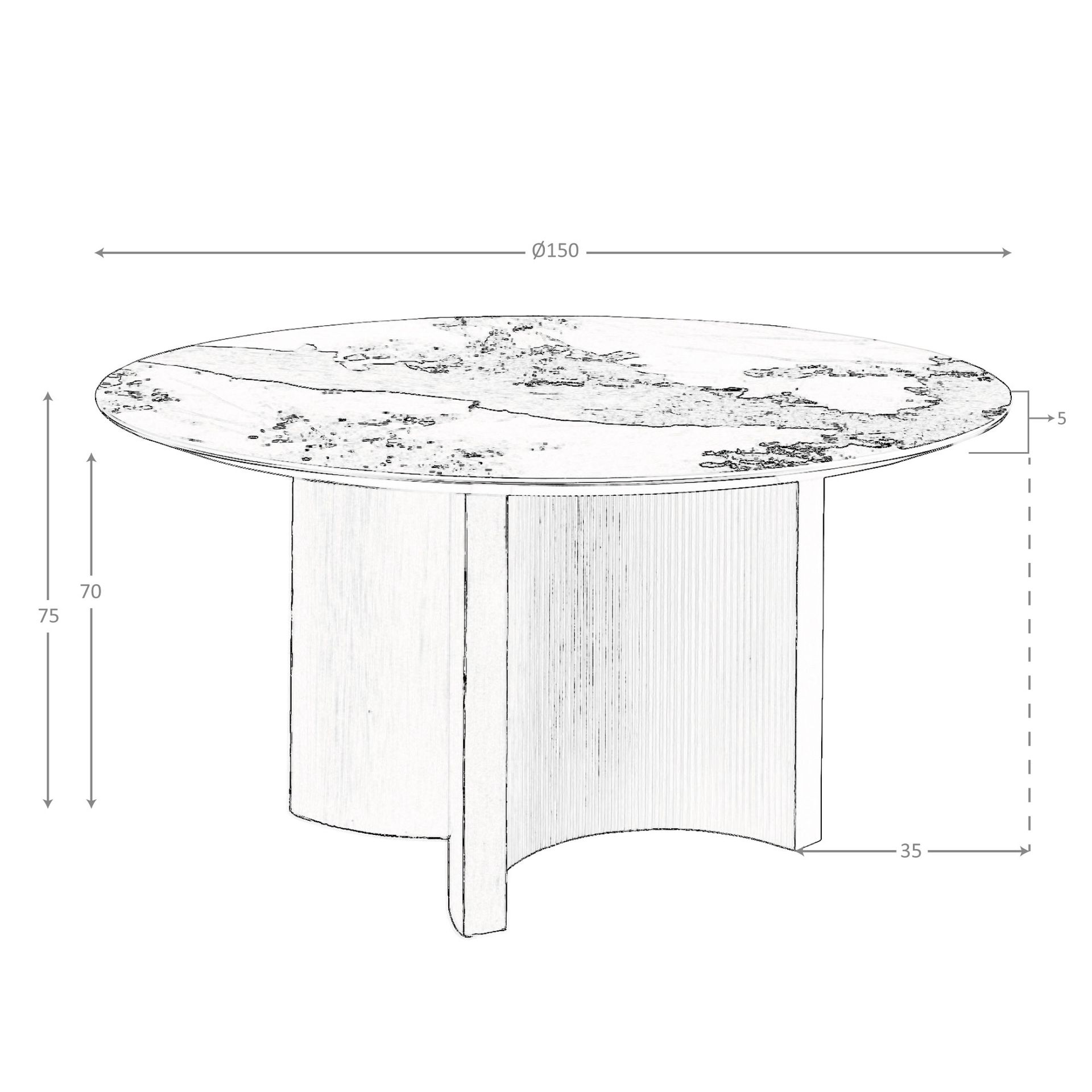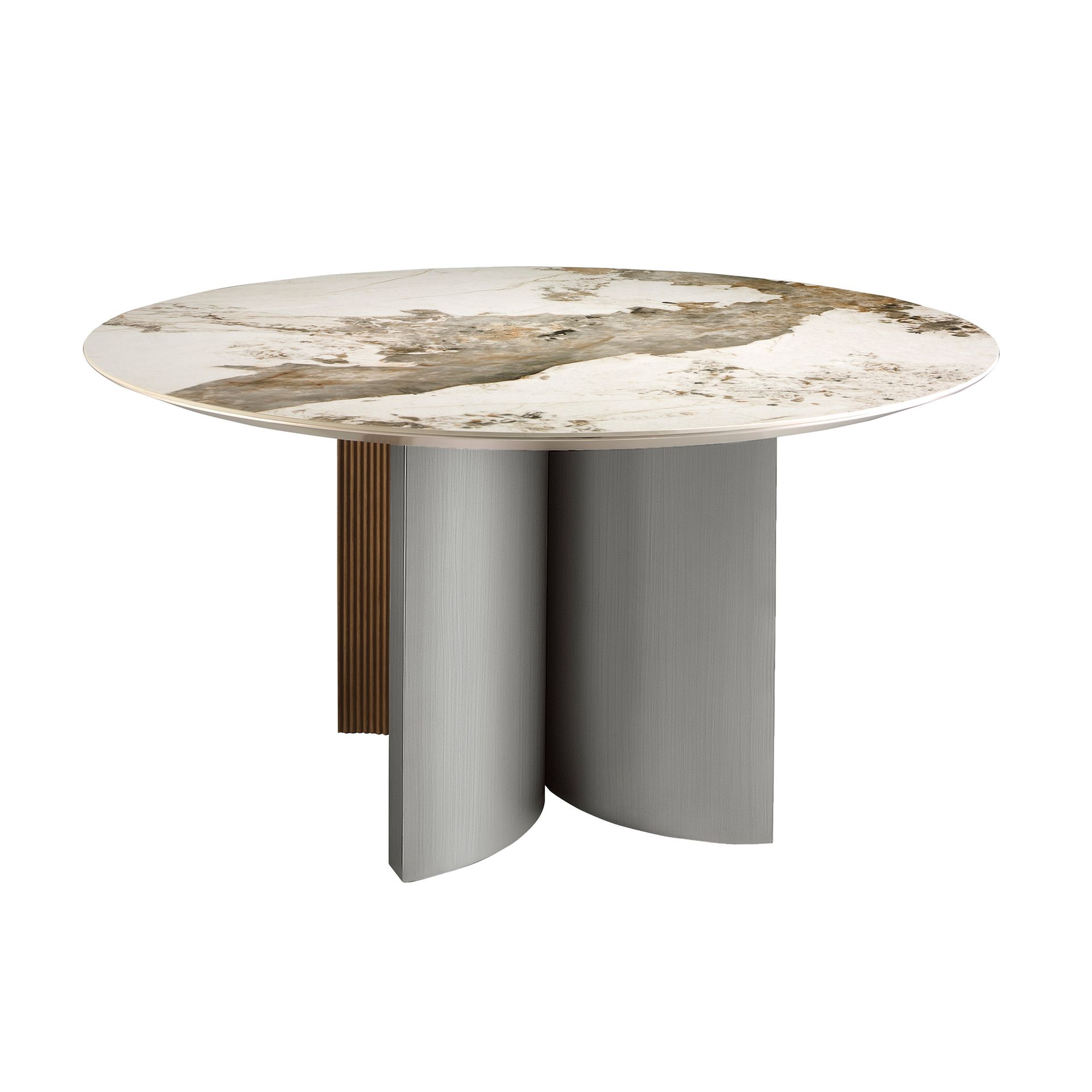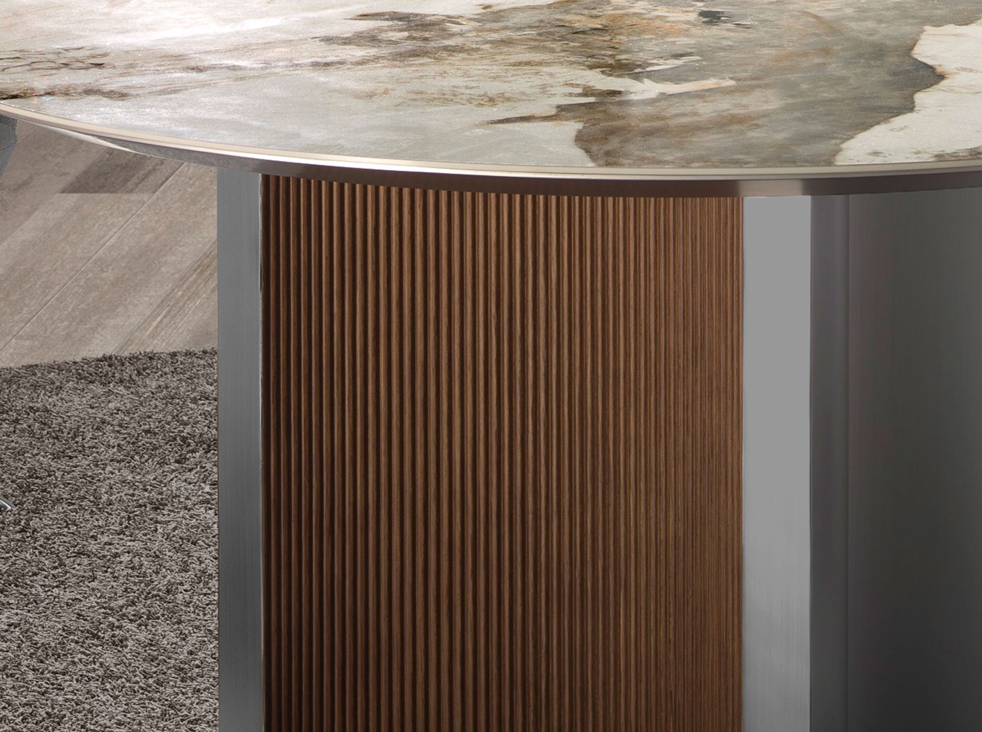 Prémium kerek étkezőasztal föld színű erezetes porcelán márvány asztallappal, dió és ezüst színű fa központi tagolt lábbal.
