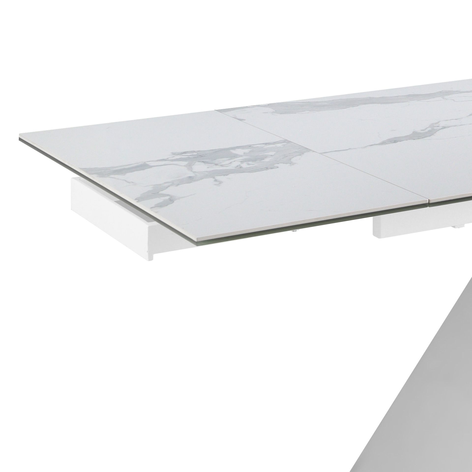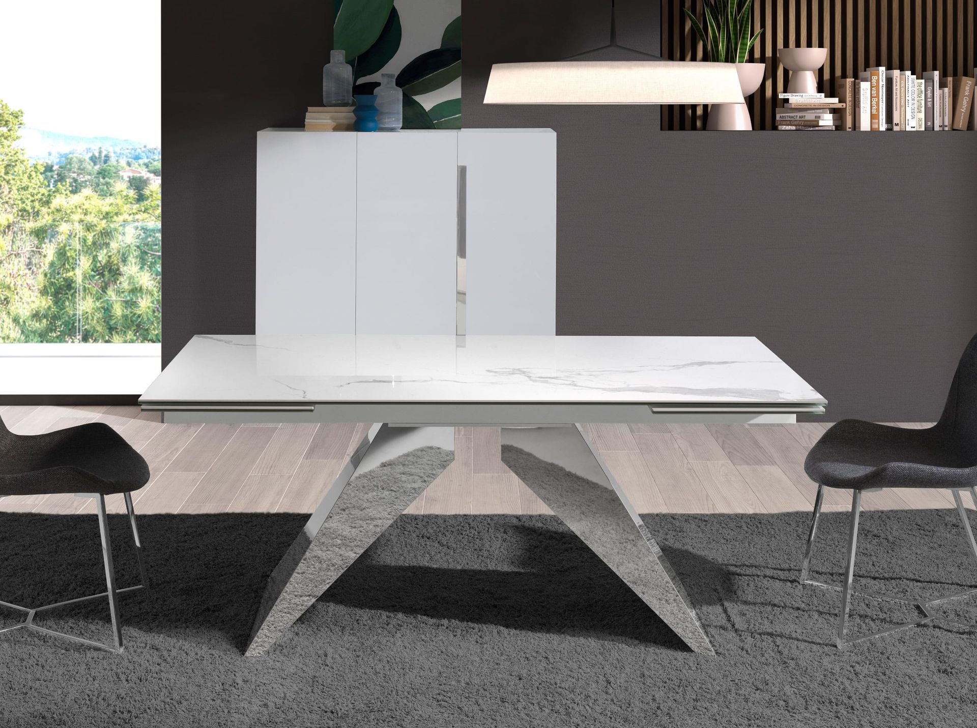 Prémium minőségű téglalap alakú kihúzható étkezőasztal fényes felületű szürke erezetes fehér porcelán márványlappal. Krómozott rozsdamentes acél lábai stabil kialakítása miatt az asztal masszív, állítható méretű asztallapja praktikus és egyben modern megjelenést kölcsönöz a bútornak.