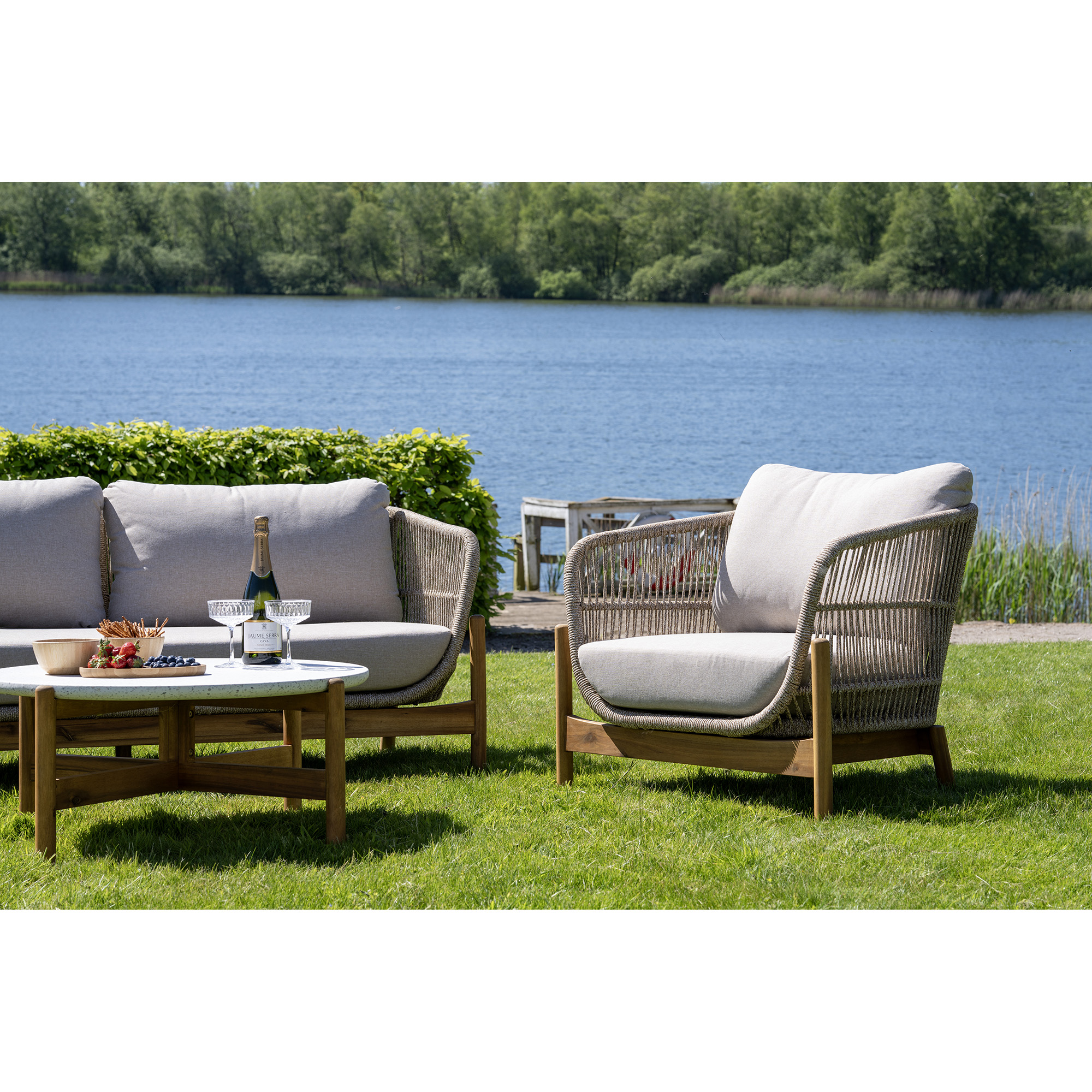 Elegáns és letisztult megjelenésű kerti fotel akácfa lábakkal, bézs színű kötél fonattal , nagy méretű natúr bézs színű párnákkal.
