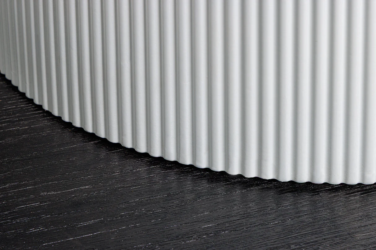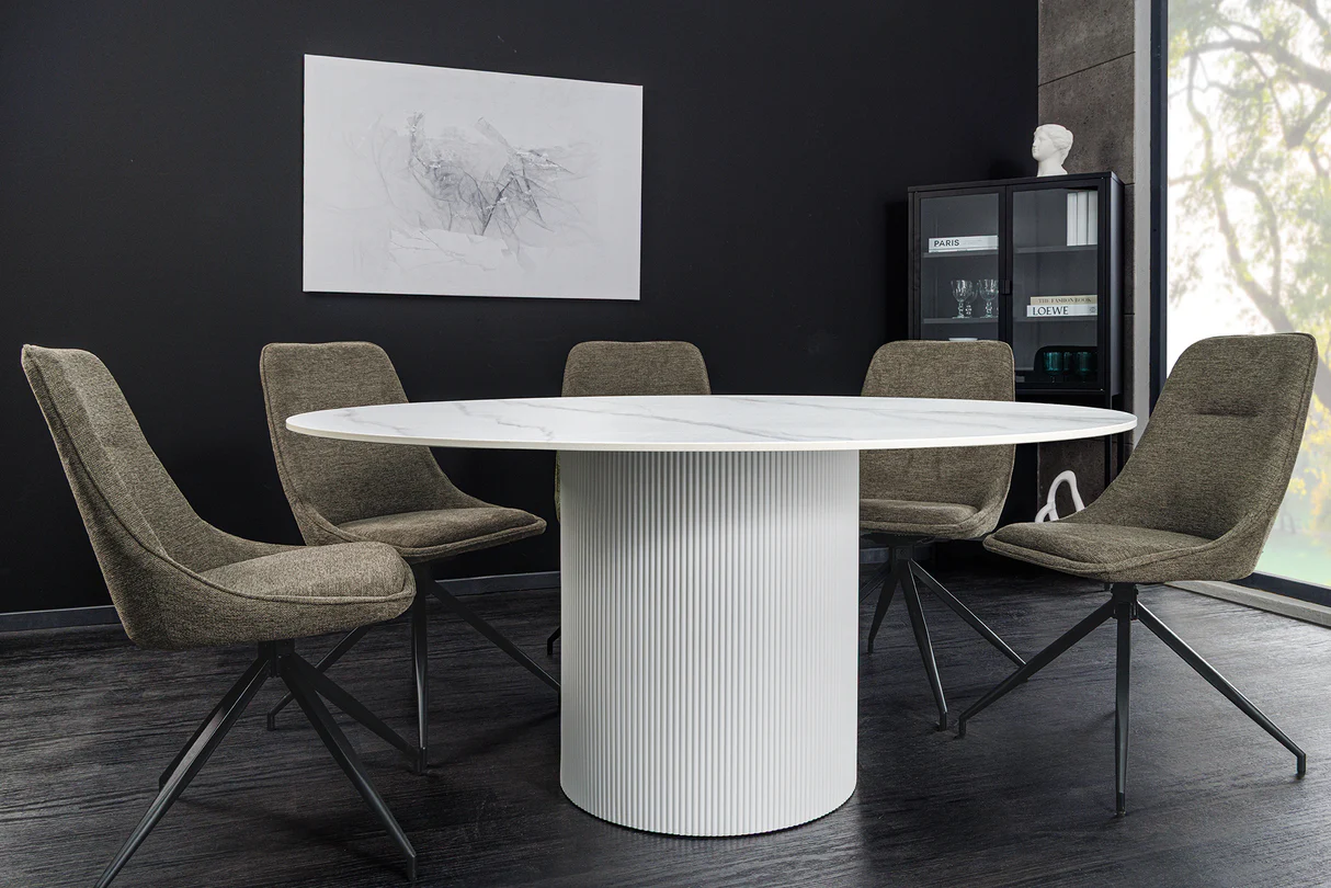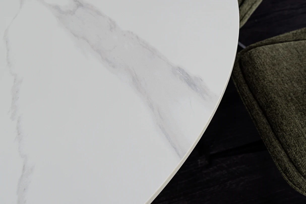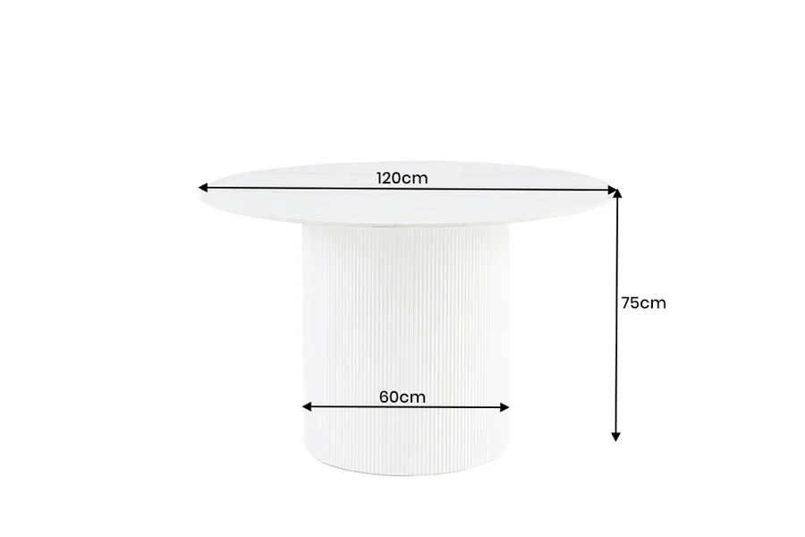 Elegáns kerek étkezőasztal fehér színű márvány mintás asztallappal , szürke színű erezettel és fehér színű kerek bordázott fa furnérozott masszív asztallábbal.