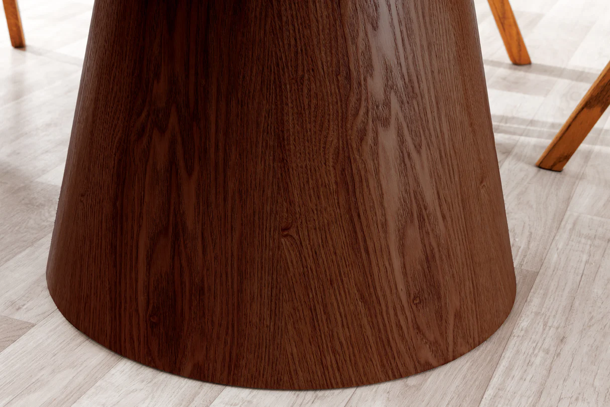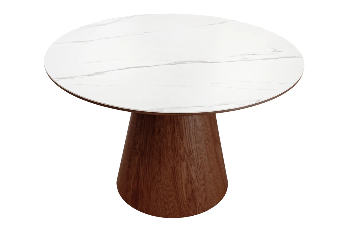 Elegáns kerek étkezőasztal fehér színű márvány mintás asztallappal , szürke színű erezettel és kerek kúp alakú eredeti dió furnérozott masszív asztallábbal.