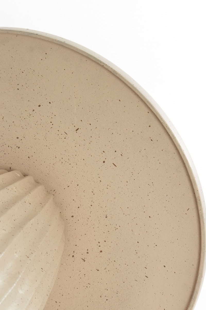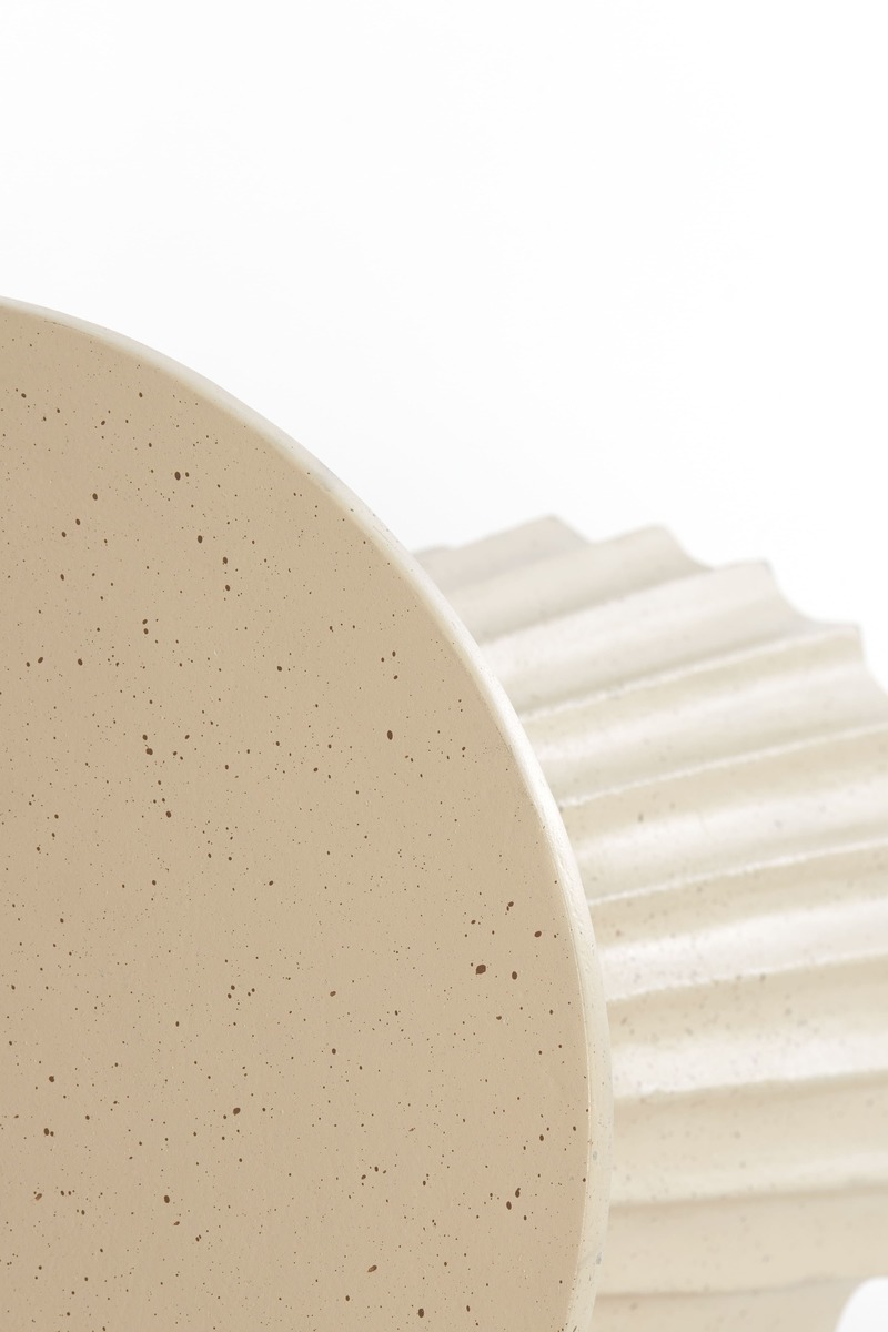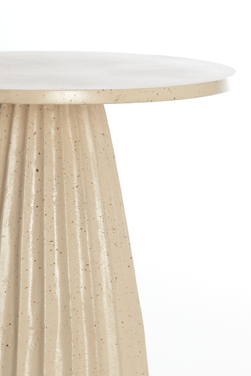 Matt krém és világosbarna színű kőhatású fém lerakóasztal kúp alakú stílusos bordázott lábbal ideális választás, ha egy dekoratív megjelenésű és egyben tartós lerakóasztalt keres otthonába. Remek választás nappaliba kanapé, fotel mellé helyezve, hogy kedvenc könyvei, kávé és egyéb italok csupán karnyújtásnyira legyenek Öntől, valamint hálószobába, teraszra elhelyezve is ideális lerakófelületet biztosít, meleg színével segít még inkább otthonossá varázsolni környezetét. Nagyszerűen kombinálható a termék további méreteivel.