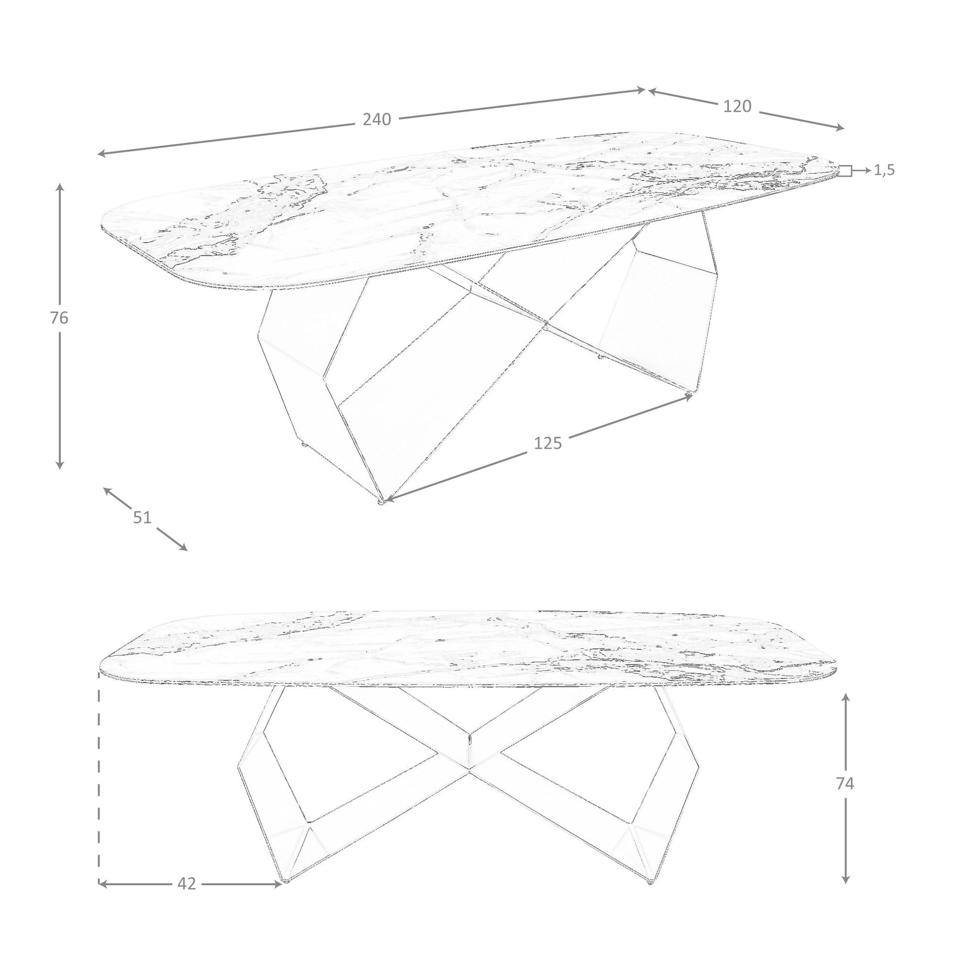 Modern, téglalap alakú prémium design étkezőasztal masszív, fix fényes felületű fehér porcelán márványlappal, szürke és arany erezetekkel. Rozsdamentes acél lába pezsgő színű, különleges dizájnjával exkluzív és egyedi megjelenést kölcsönöz az asztalnak.