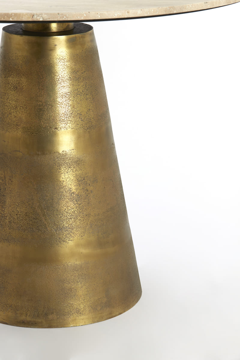 Kerek formájú design étkezőasztal travertin mészkő lappal és kúp formájú, lefelé szélesedő antik bronz színű központi fém lábbal elegáns megjelenésű, a mészkő lap természetes szépsége, egyedi mintázata és bézs tónusai otthonos hangulatot teremtenek, masszív fém lába sima felületű, kerek formája miatt ideális helykihasználtságot és meghittebb, kötetlenebb beszélgetéseket eredményez, kisebb méretű étkezőkben, konyhákban is kényelmesen használható.