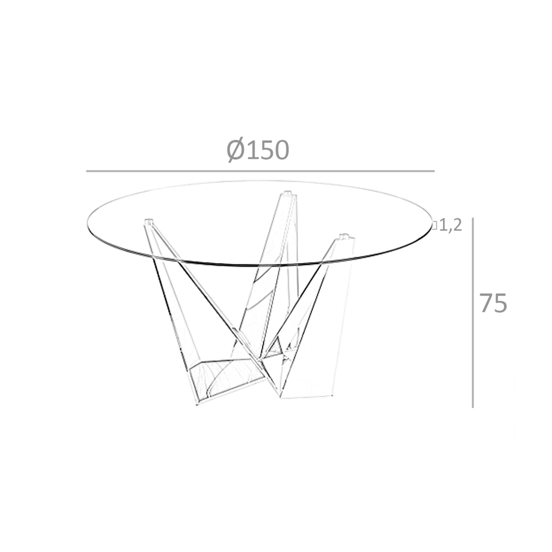 Modern kerek étkezőasztal fix méretű edzett üveglappal, fekete színű rozsdamentes acél központi lába feltűnő dizájneleme a bútornak.